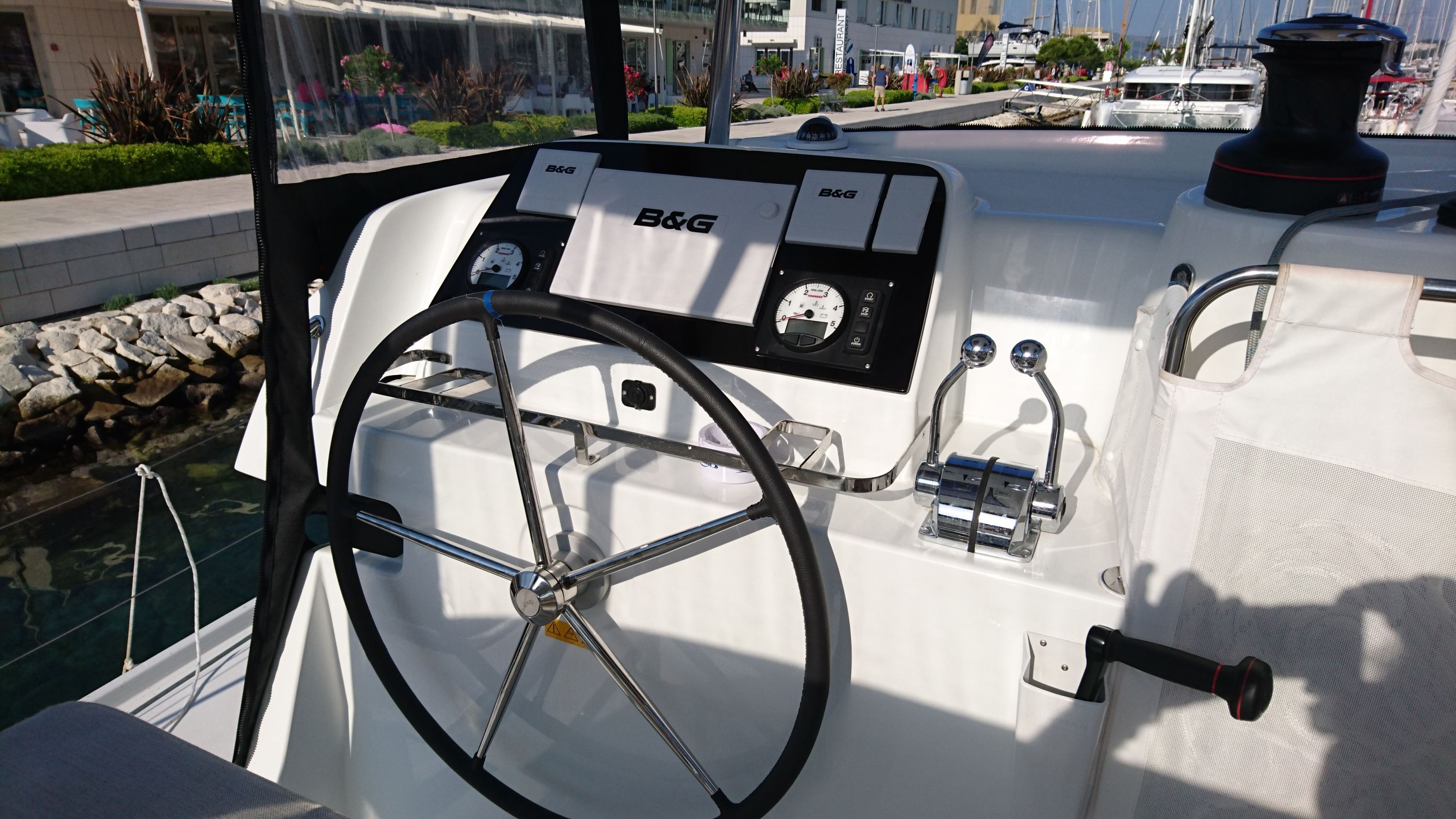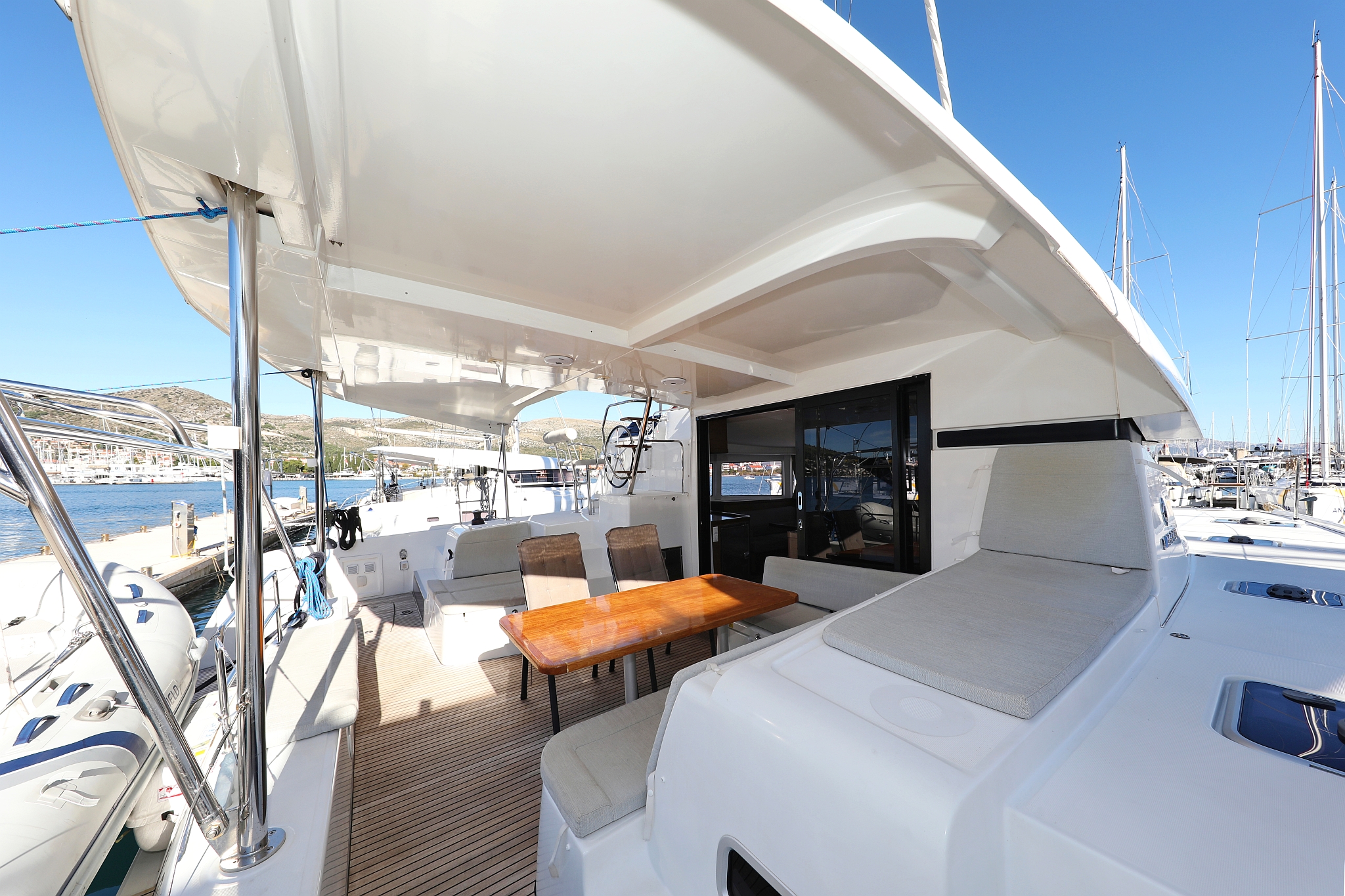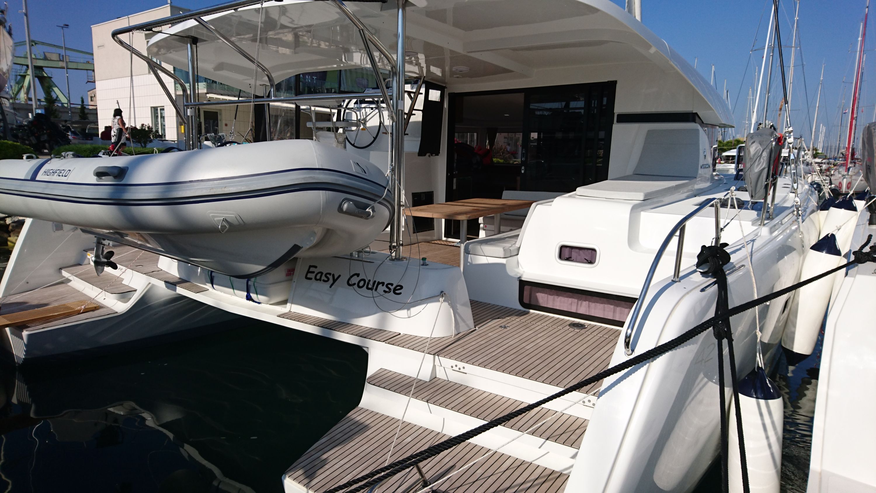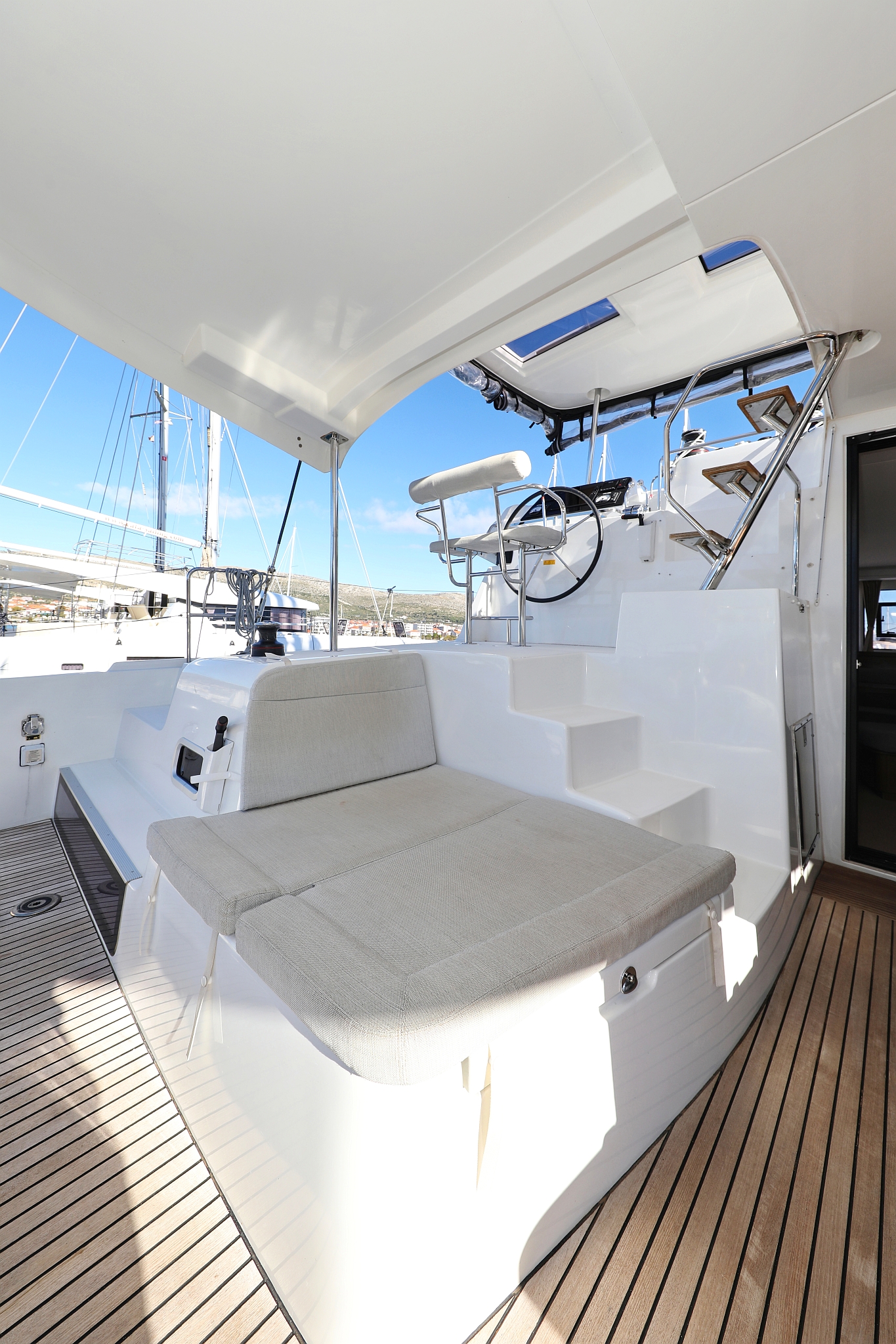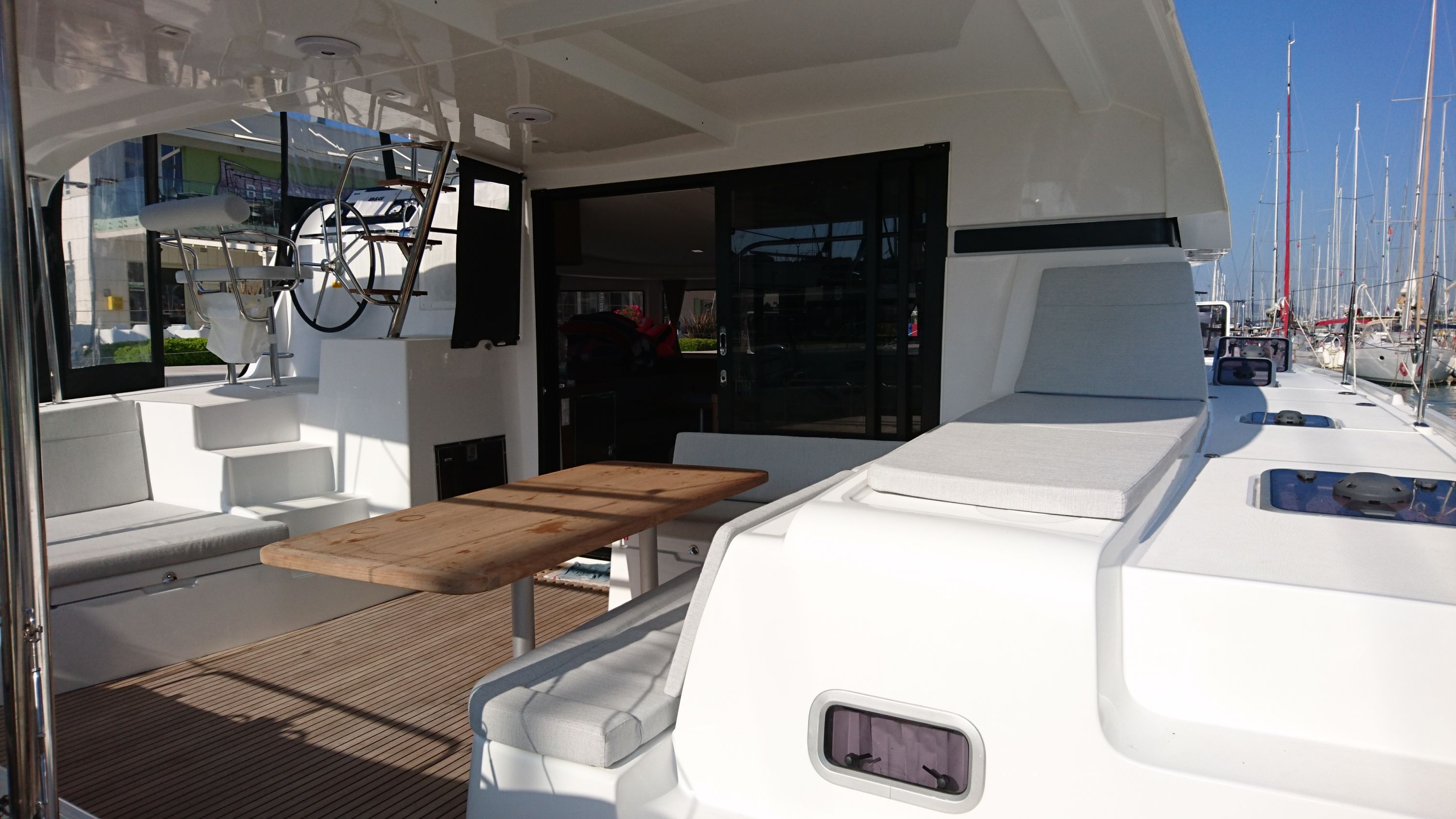 | Outside | 220 V-Landanschluss, Bootshaken, Cockpitdusche, Cockpitkühlschrank, Cockpitlautsprecher, Cockpitpolster, Cockpittisch, Cockpittisch mit Eisbox, Delta-Anker, elektr. Ankerwinsch, elektr. Winsch, Fender, Festmacherleinen, Gangway, Hardtop, Jambo Anker, Solaranlage, Sonnendeck, Wasserschlauch, Winschen |
