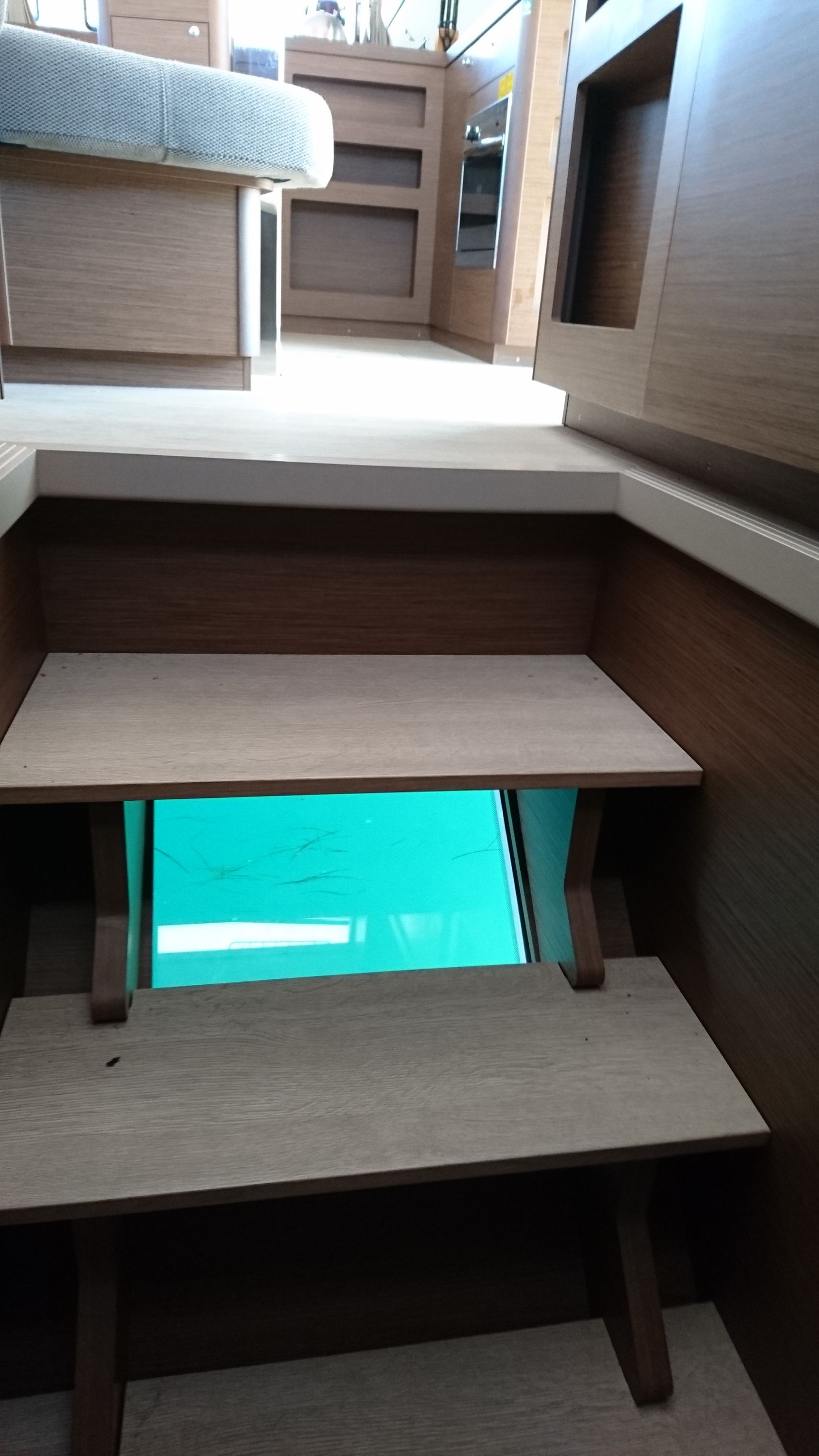 | Inside | 220V Steckdosen, Bluetooth Player, Borduhr, Fäkalientank, FUSION Sound System, Gasherd mit Backofen, Generator, Heizung, Klimaanlage (ohne Landstrombedarf), Kühlschrank, Ladegerät, Mokkakanne, Pantryausstattung, Radio, Spülbecken, Warmwasser, Wasserkocher, WC (elektr.) |