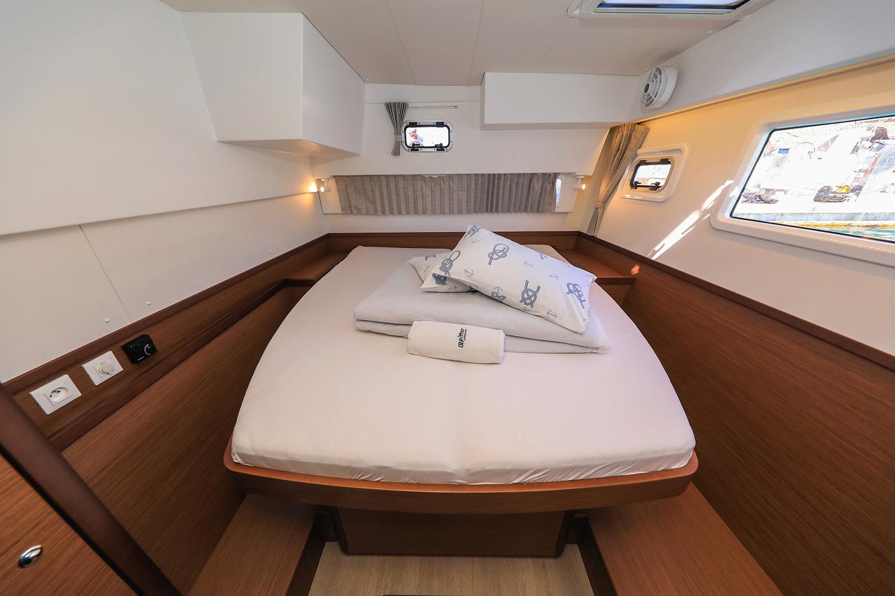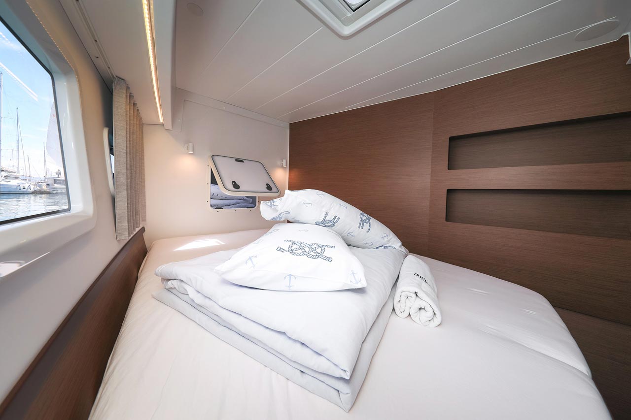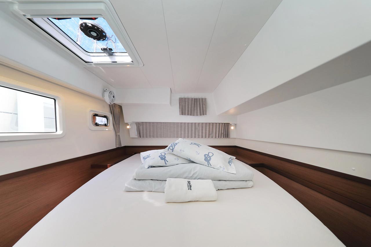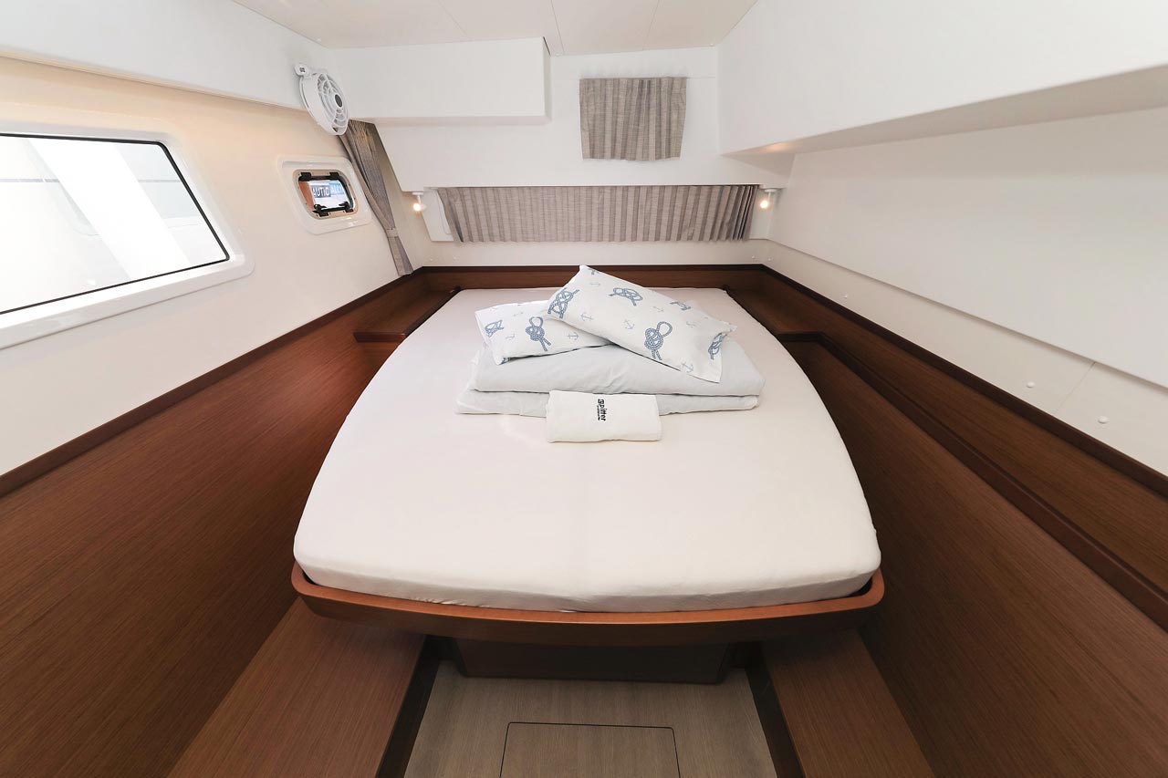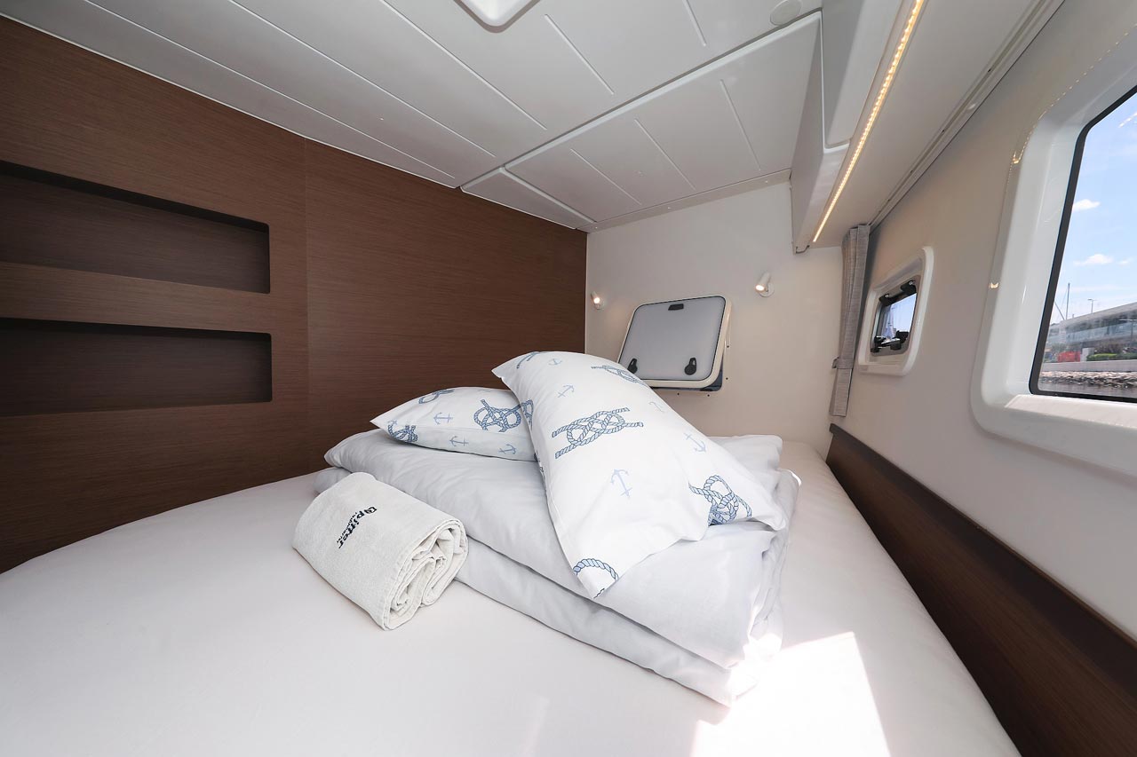 | Inside | 2. Kühlschrank, Borduhr, FUSION Sound System, Heizung, Inverter 12V/220V, Kühlschrank mit Gefrierfach, Ladegerät, Luftpumpe für Beiboot, Pantryausstattung, Radio mit USB, Bluetooth und AUX-In, Salontisch absenkbar, USB Steckdosen in den Kabinen, Ventilatoren in Kabinen, Warmwasser, WC (elektr.) |