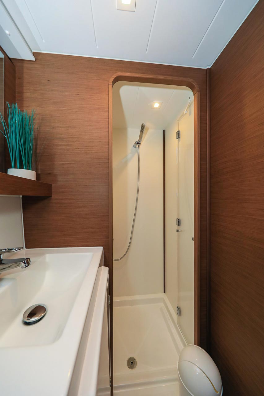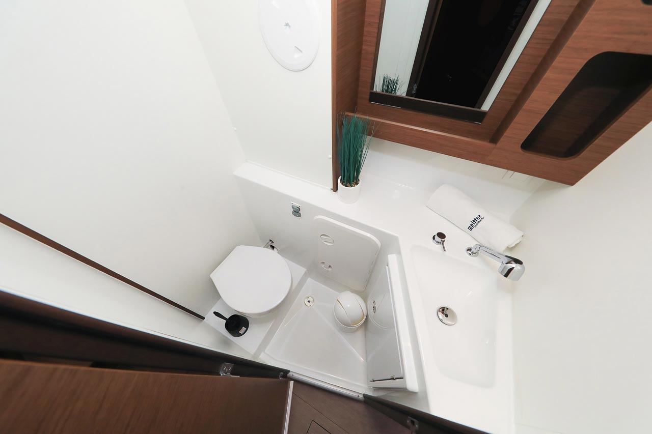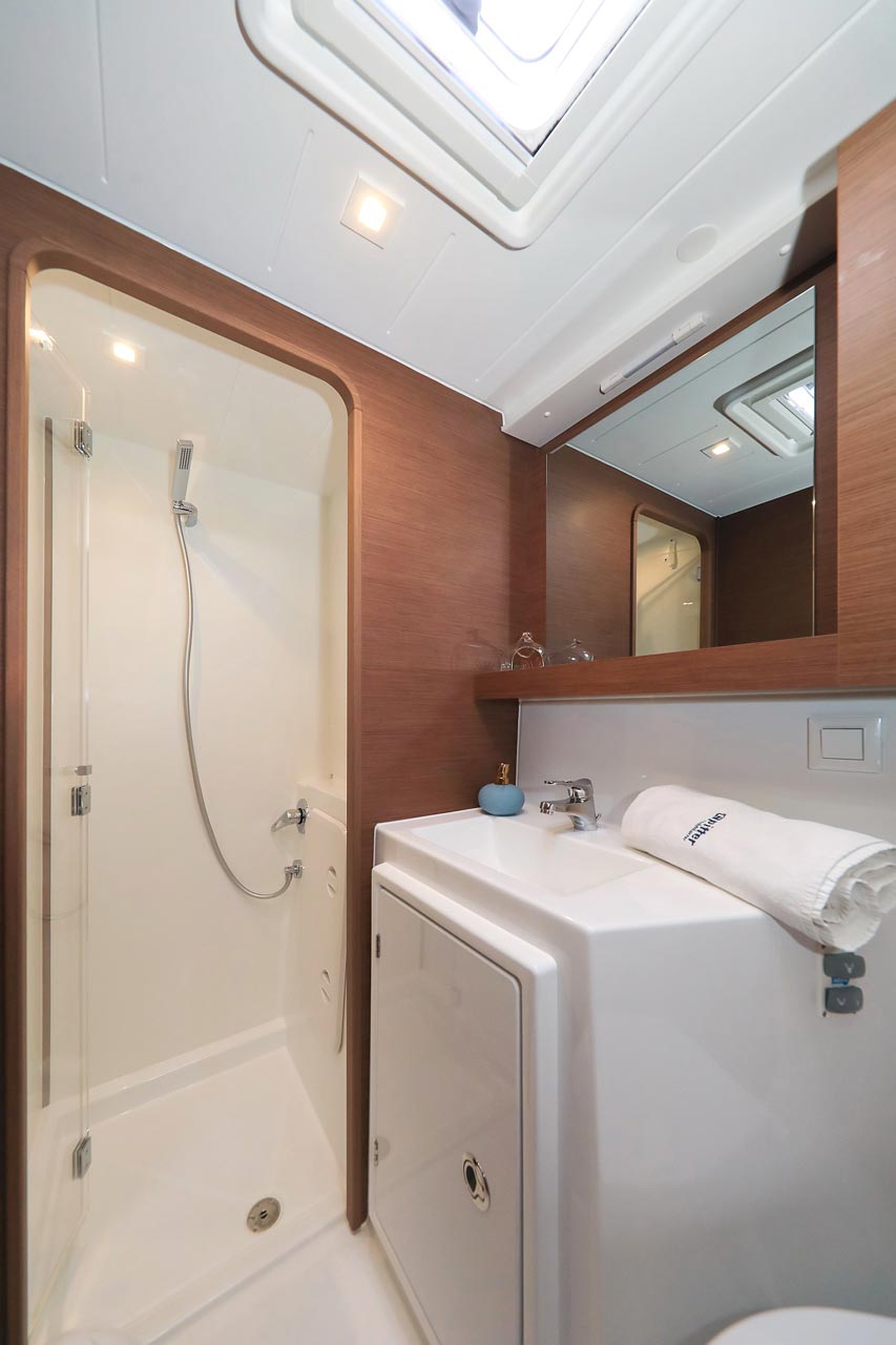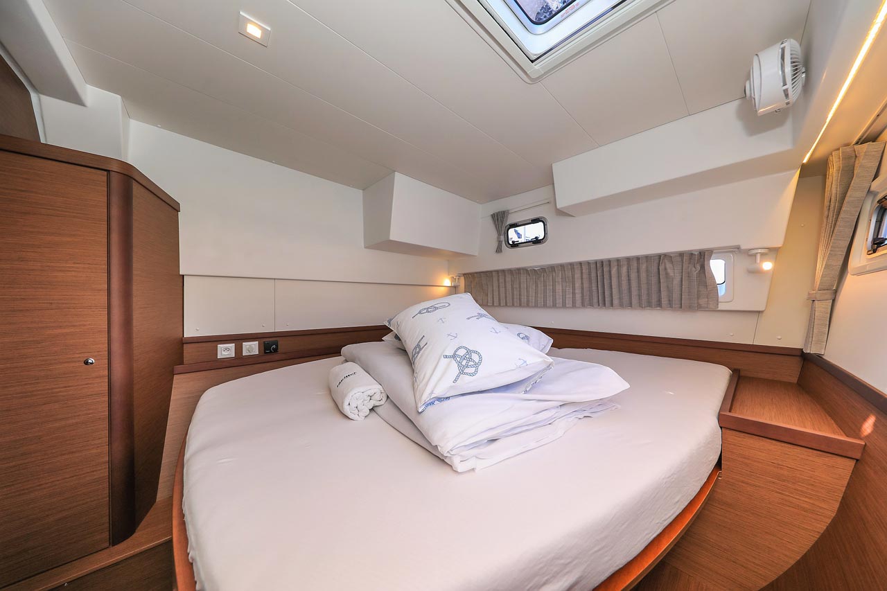 | Inside | 2. Kühlschrank, Borduhr, FUSION Sound System, Heizung, Inverter 12V/220V, Kühlschrank mit Gefrierfach, Ladegerät, Luftpumpe für Beiboot, Pantryausstattung, Radio mit USB, Bluetooth und AUX-In, Salontisch absenkbar, USB Steckdosen in den Kabinen, Ventilatoren in Kabinen, Warmwasser, WC (elektr.) |