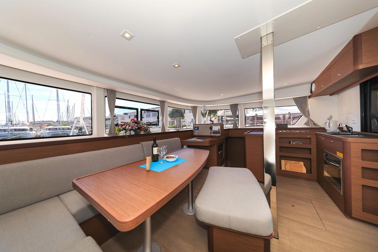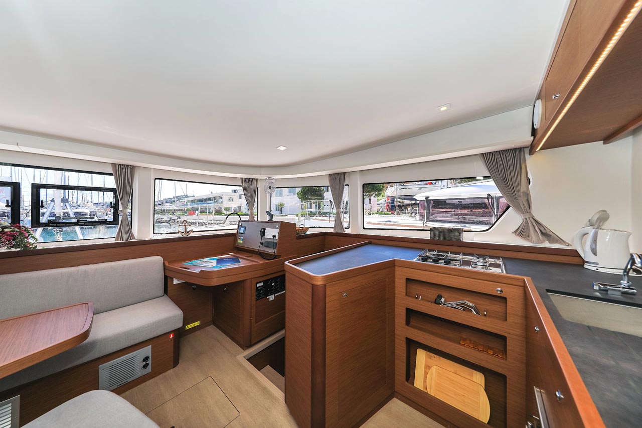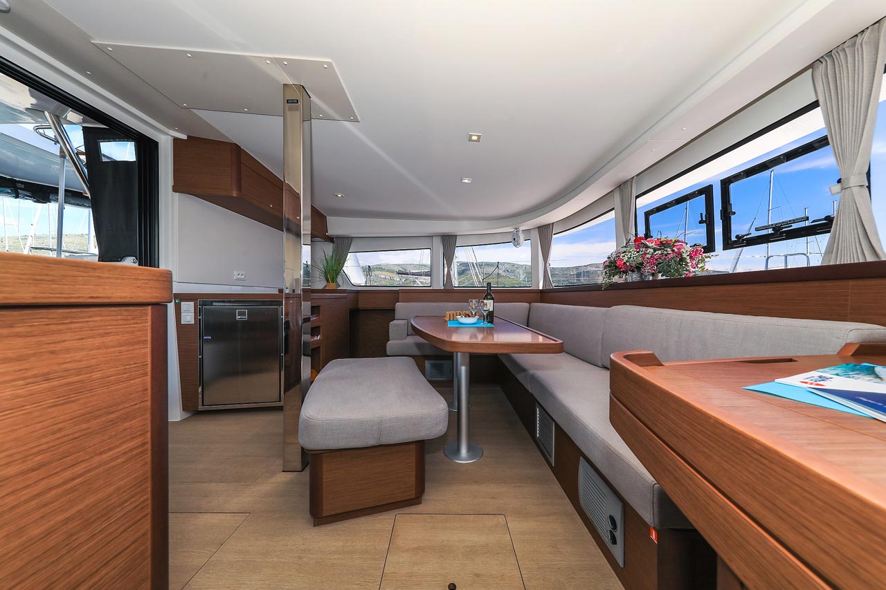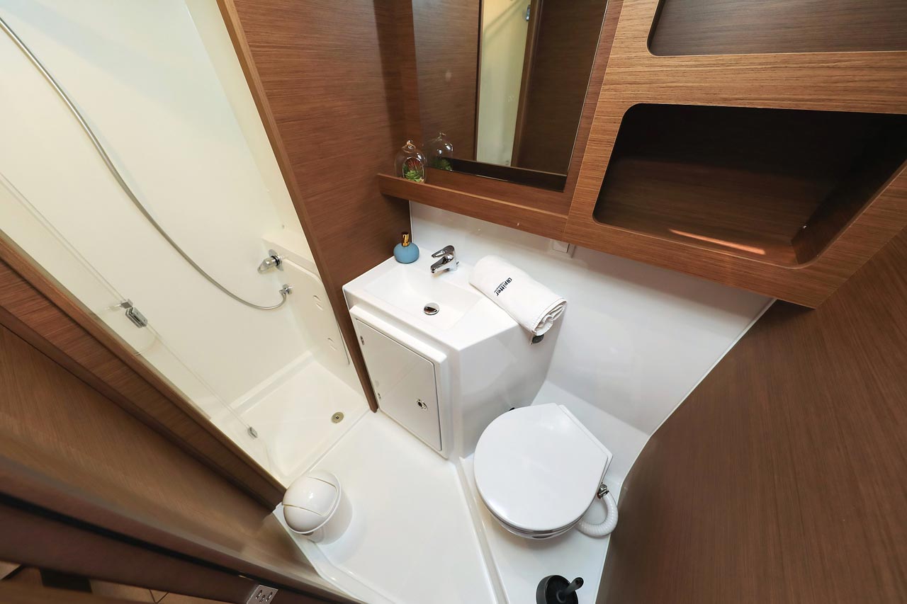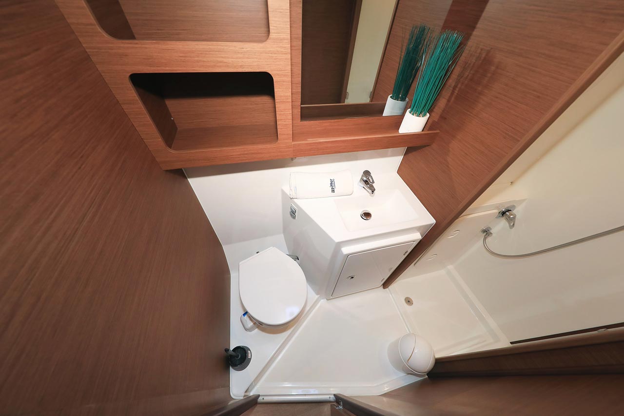 | Inside | 2. Kühlschrank, Borduhr, FUSION Sound System, Heizung, Inverter 12V/220V, Kühlschrank mit Gefrierfach, Ladegerät, Luftpumpe für Beiboot, Pantryausstattung, Radio mit USB, Bluetooth und AUX-In, Salontisch absenkbar, USB Steckdosen in den Kabinen, Ventilatoren in Kabinen, Warmwasser, WC (elektr.) |