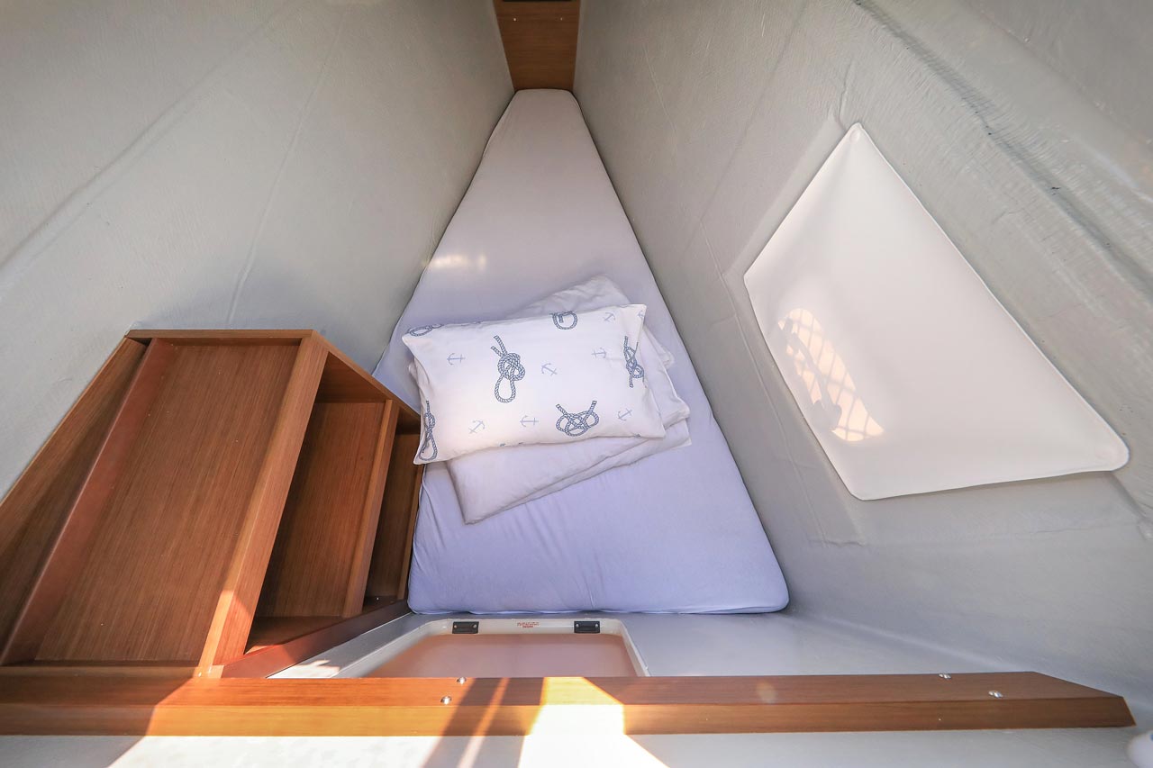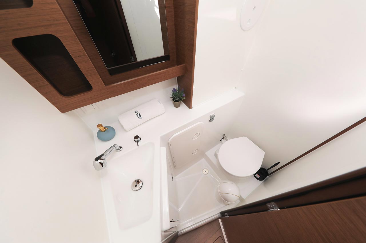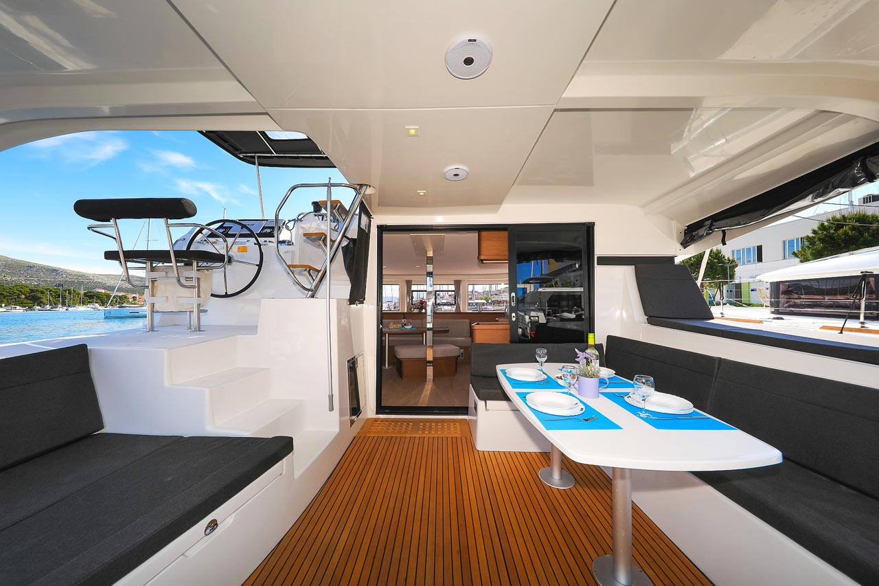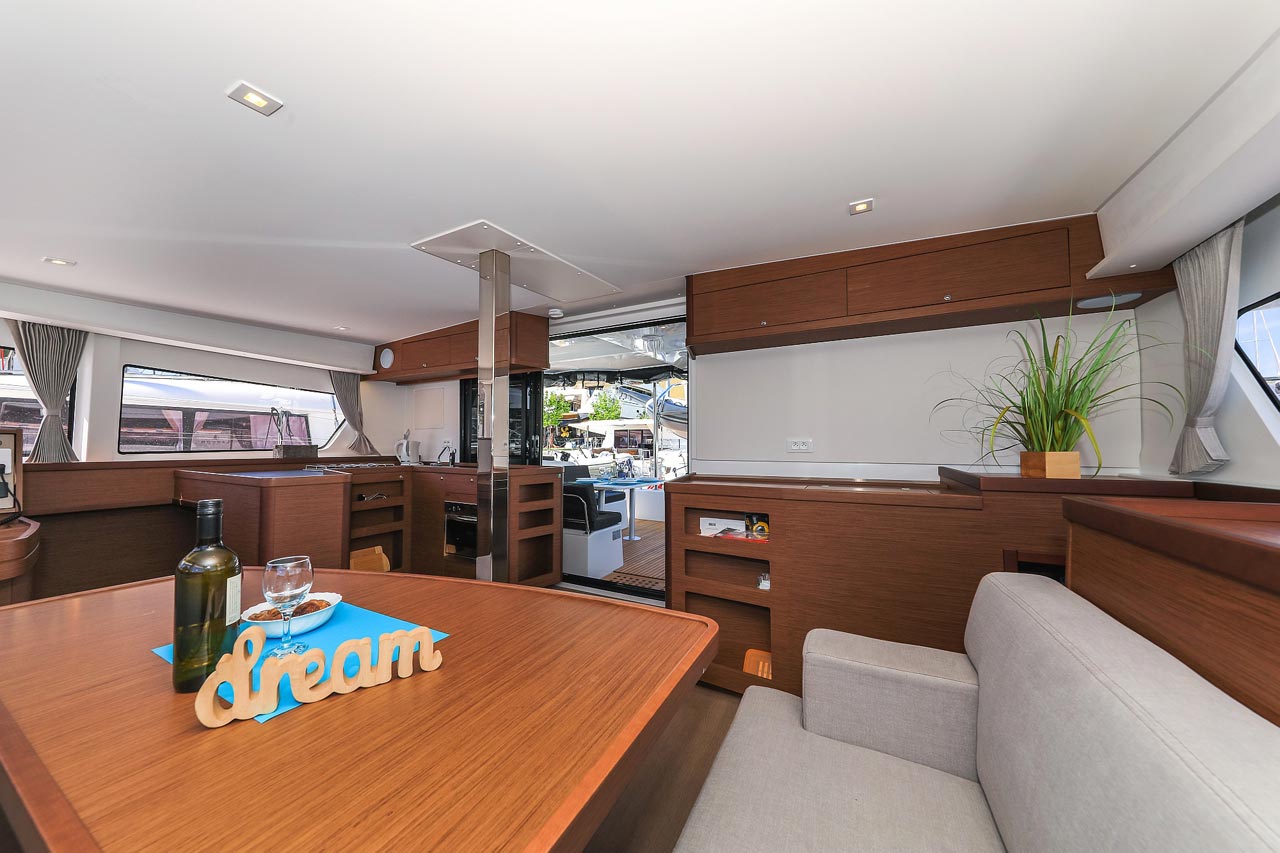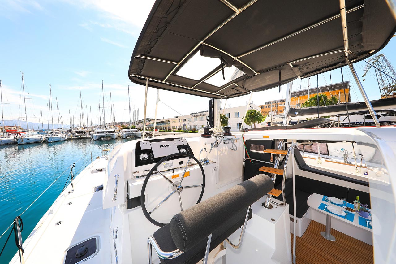 | Inside | 2. Kühlschrank, Borduhr, FUSION Sound System, Heizung, Inverter 12V/220V, Kühlschrank mit Gefrierfach, Ladegerät, Luftpumpe für Beiboot, Pantryausstattung, Radio mit USB, Bluetooth und AUX-In, Salontisch absenkbar, USB Steckdosen in den Kabinen, Ventilatoren in Kabinen, Warmwasser, WC (elektr.) |