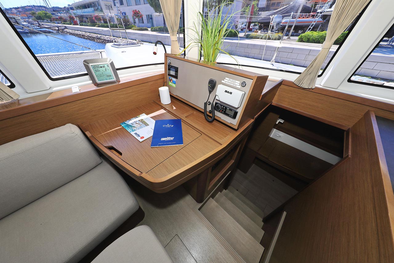 Fernglas, GPS mit Kartenplotter im Cockpit, Hafenhandbücher, Handpeilkompass, Navigationsbesteck, Seekarten, Tridata (Log, Echolot, Windm.) |
