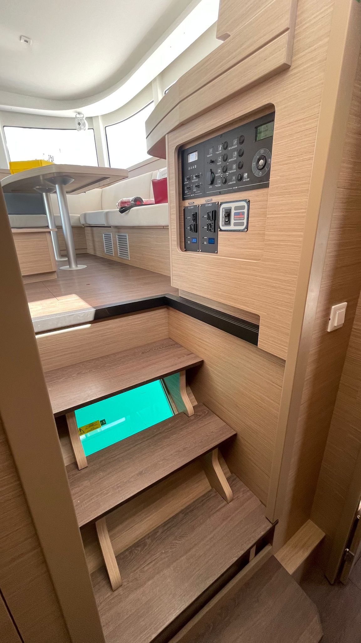 | Inside | 220V Steckdosen, Fäkalientank, FUSION Sound System, Gefrierschrank, Generator, Heizung, Kaffeemaschine, Klimaanlage (ohne Landstrombedarf), Kühlschrank, Ladegerät, Landstromkabel, Mikrowelle, Moskitonetze, Pantryausstattung, Radio, Radio mit CD, Salontisch absenkbar, USB Steckdosen in den Kabinen, Ventilatoren in Salon und Kabinen, Warmwasser, Watermaker, WC (elektr.) |