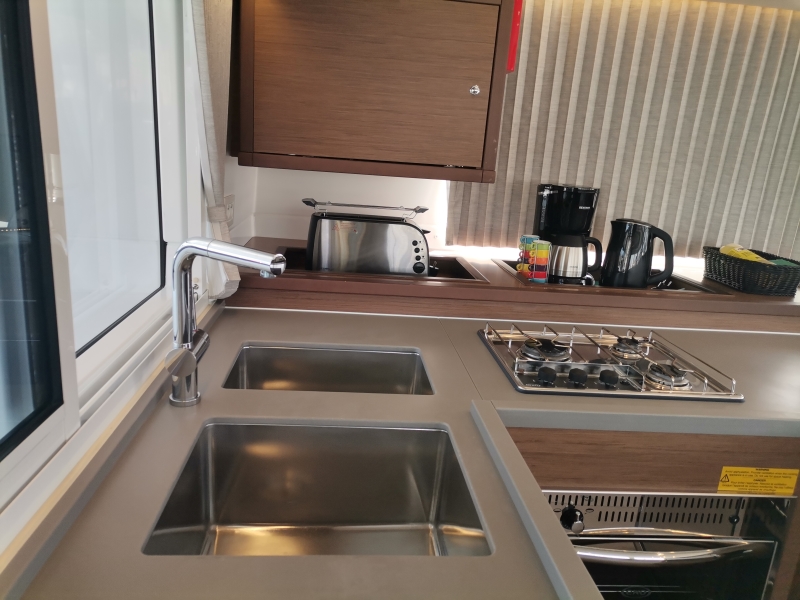 | Inside | 220V Steckdosen, Gasherd, Gefrierschrank, Generator, Heizung, Inverter 12V/220V, Klimaanlage (ohne Landstrombedarf), Kühlschrank, Ladegerät, Pantryausstattung, Radio, Salontisch absenkbar, TV, Warmwasser, Wasserkocher |