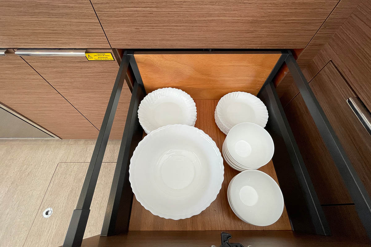 220V Steckdosen, Backofen, Eisbox, Fäkalientank, Frischwasserpumpe, Gasherd, Gefrierschrank, Generator, Inverter 12V/220V, Kleiderbügel, Klimaanlage (ohne Landstrombedarf), Klobürste, Kühlschrank, Ladegerät, Landstromkabel, LED-Innenleuchten, Mikrowelle, Pantryausstattung, Radio mit CD/MP3/USB, Spülbecken, USB Steckdose, Ventilatoren in Kabinen, Wasserkocher, WC (elektr.), WC-Pumpe |