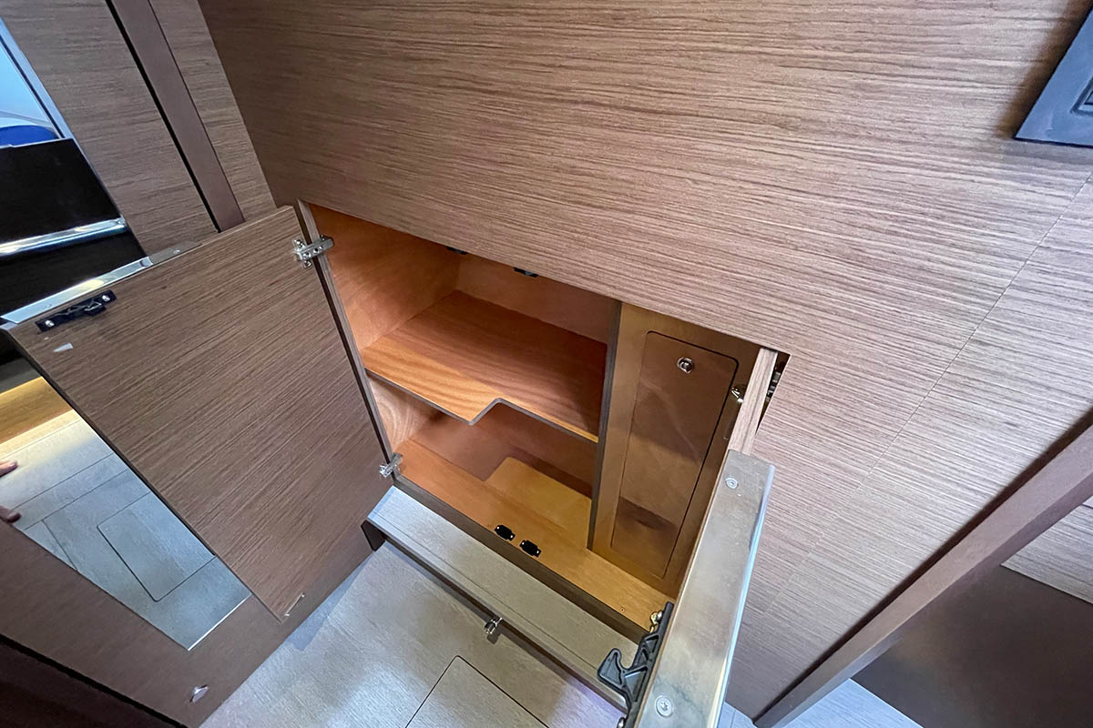 Autopilot, Bootsmannstuhl, Bordapotheke, Bordwerkzeug, elektr. Bilgepumpe, Feststoffschwimmwesten, Feuerlöscher, Flaggen, Handbilgepumpe, Kinderschwimmwesten, Lifebelts, Navigationslichter, Nebelhorn, Notpinne, Notsignale, Radarreflektor, Rettungsinsel, Rettungskragen, Taschenlampe, UKW-Funk m. DSC, Zweitanker |