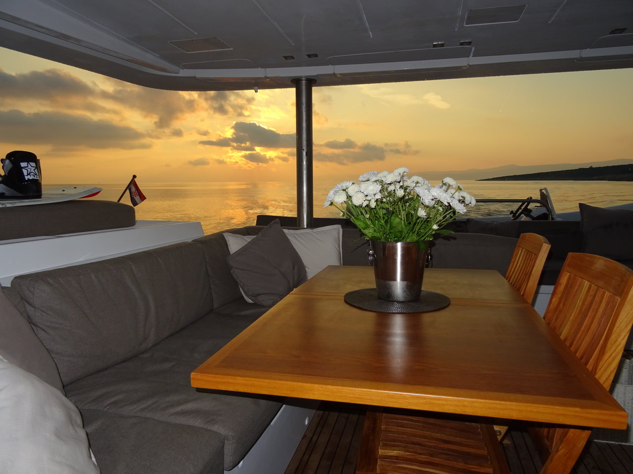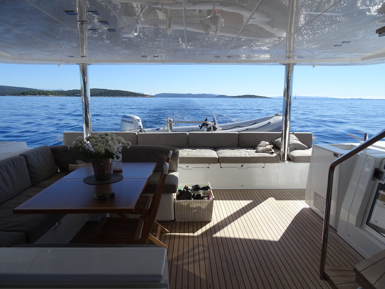 | Outside | 12 V-Anschluss, 220 V-Landanschluss, Anker mit Kette, Badeleiter, Badeplattform, Biminitop, Cockpitdusche, Cockpitkühlschrank, Cockpitlautsprecher, Cockpitpolster, Cockpittisch, Deckpolster, elektr. Ankerwinsch, elektr. Winsch, Flybridge, Grill, Schnorchelausrüstung, Sprayhood, Teak im Cockpit, Winschen |