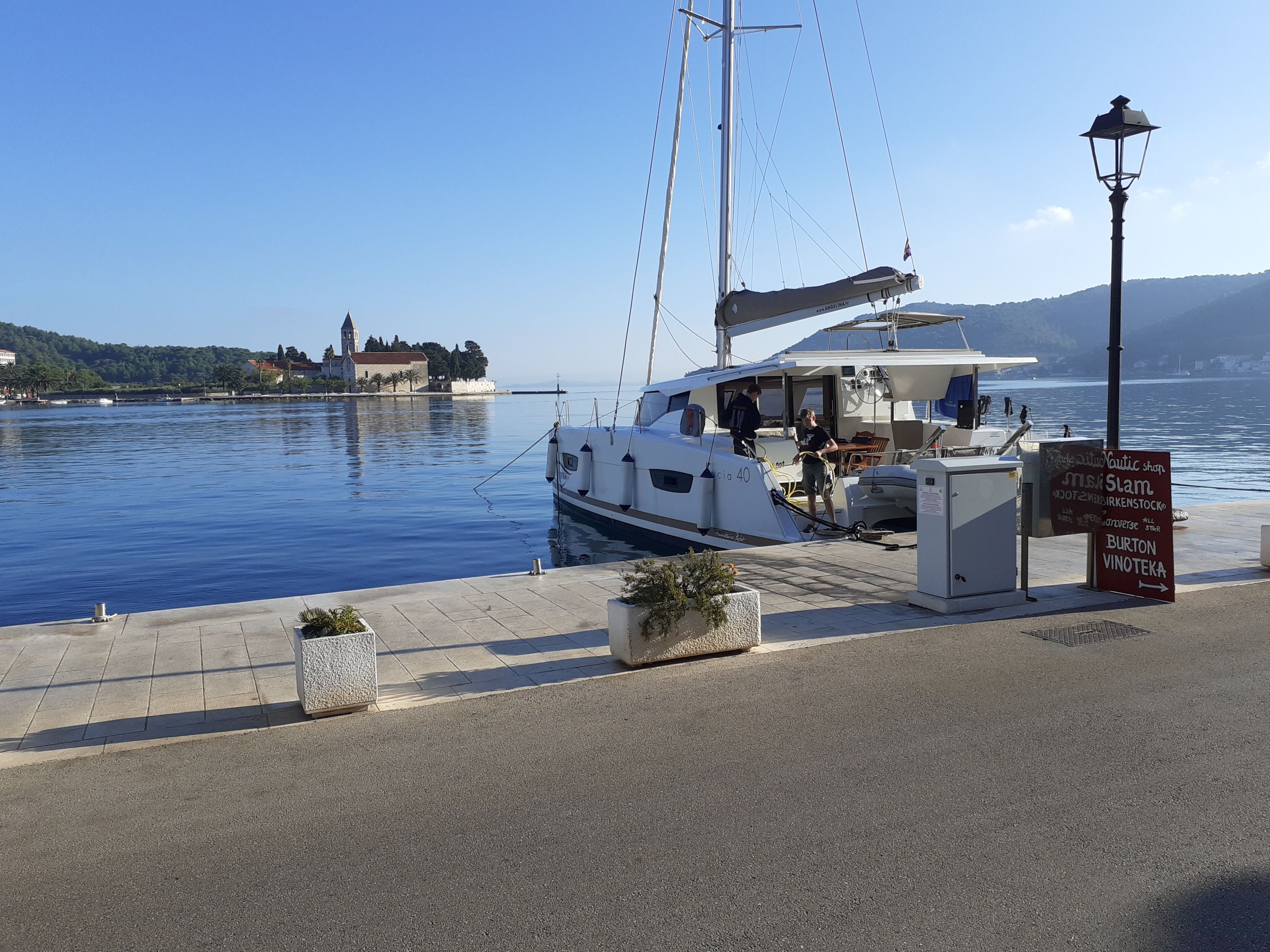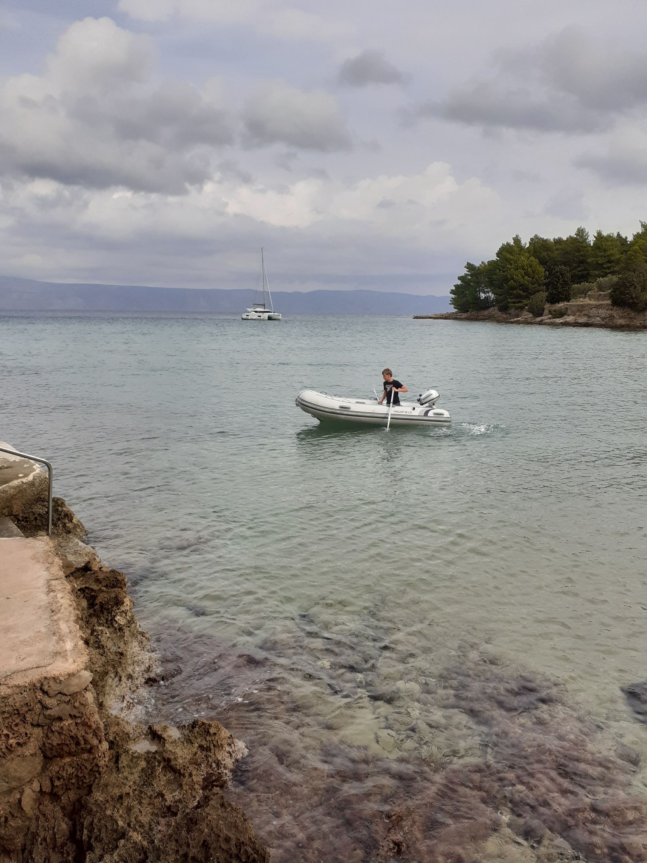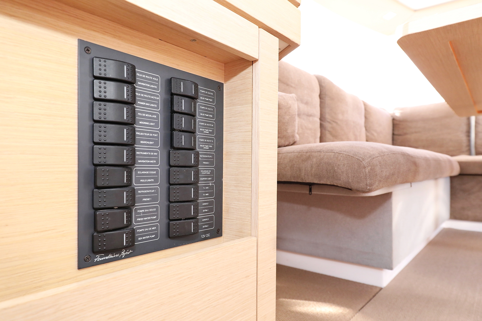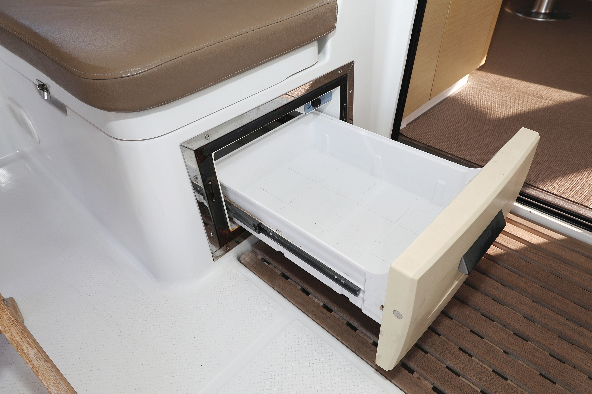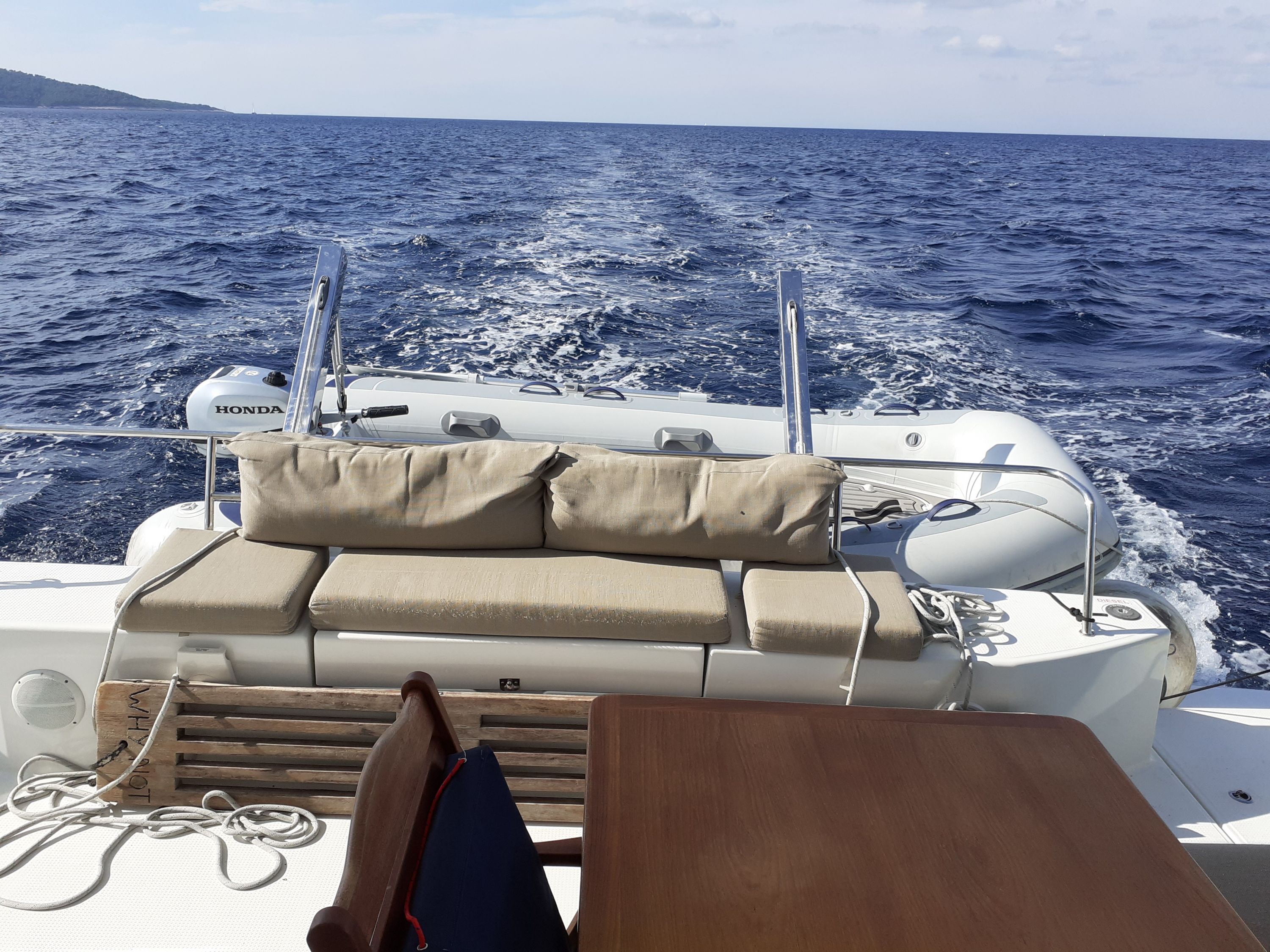 | Outside | Bootshaken, Cockpitdusche, Cockpitkühlschrank, Cockpitlautsprecher, Cockpitpolster, Cockpittisch, Delta-Anker, elektr. Ankerwinsch, Fender, Festmacherleinen, Gangway, Hardtop, Kugelfender, Solaranlage, Wasserschlauch, Winschen |