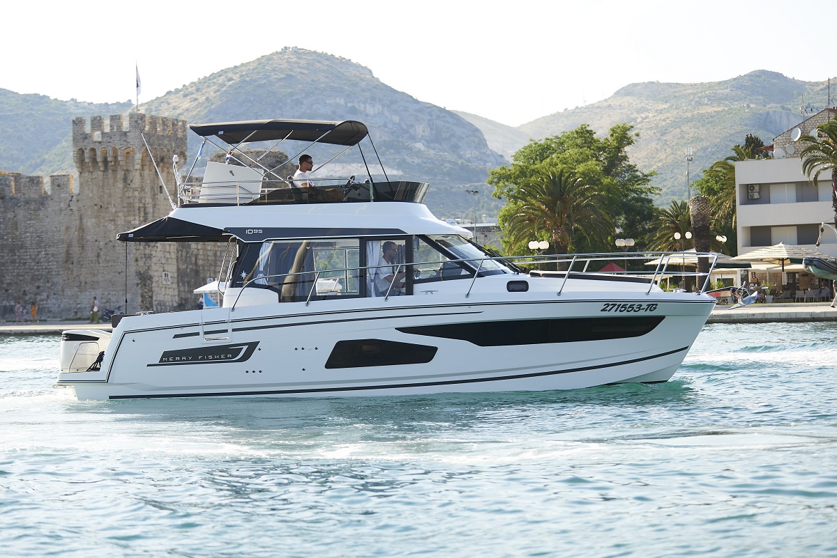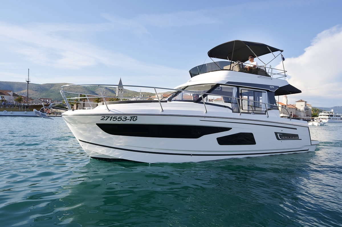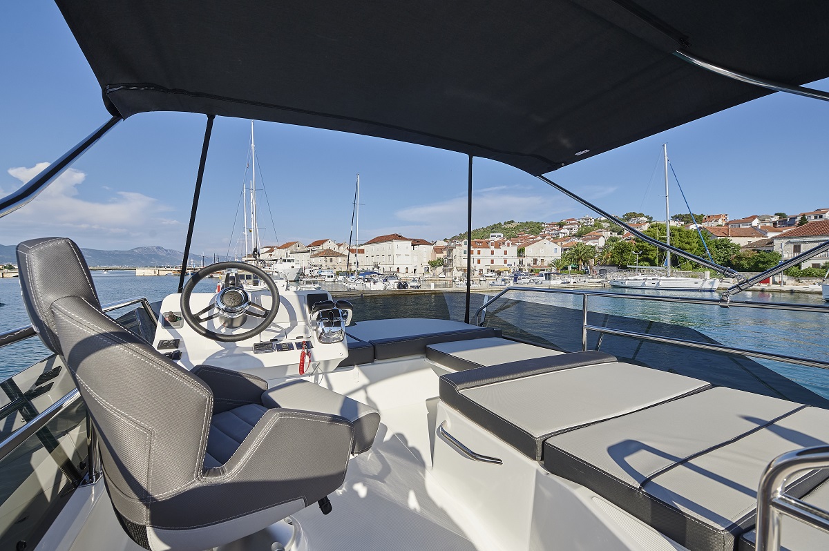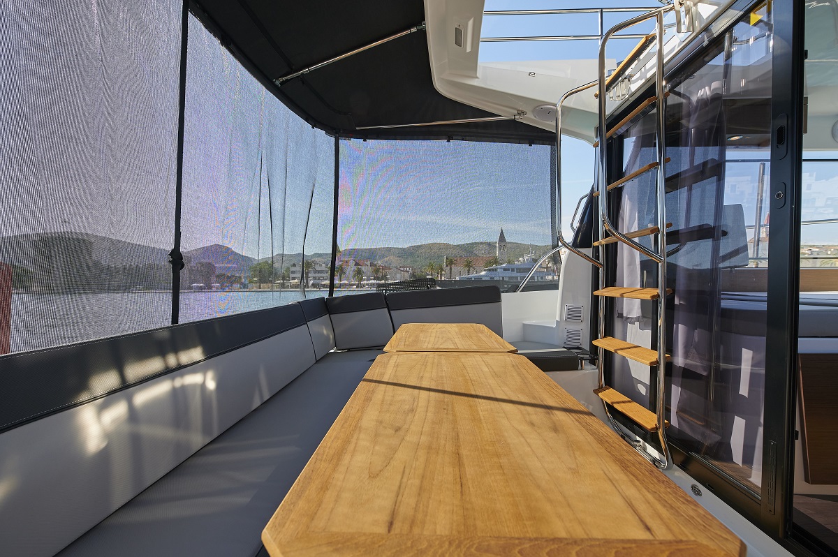 | Outside | 12 V-Anschluss, 220 V-Landanschluss, Anker mit Kette, Badeplattform, Biminitop, Cockpitdusche, Cockpitlautsprecher, Cockpitleuchte, Cockpitpolster, Deckpolster, elektr. Ankerwinsch, Fender, Festmacherleinen, Flybridge, Sprayhood, Teakdeck |