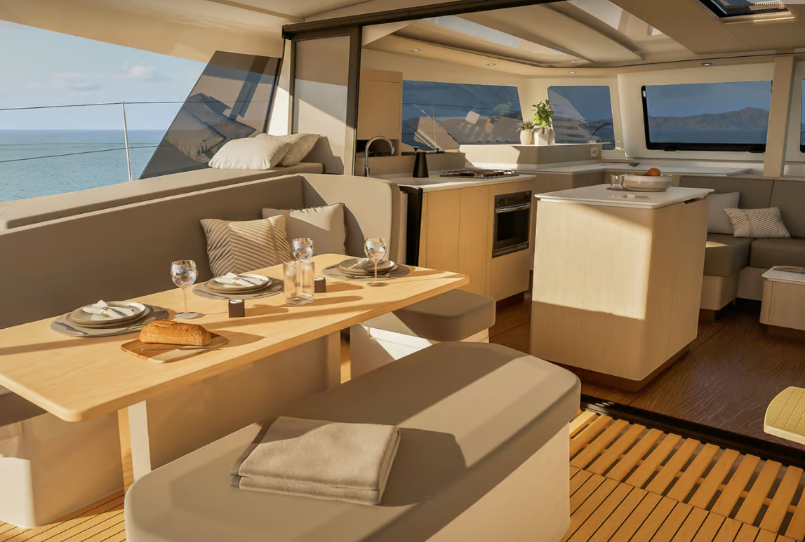 | Inside | Borduhr, Generator, Inverter 12V/220V, Klimaanlage (ohne Landstrombedarf), Kühlschrank, Luftpumpe für Beiboot, Pantryausstattung, Radio mit Bluetooth, Salontisch absenkbar, Ventilatoren in Kabinen, WC (elektr.) |