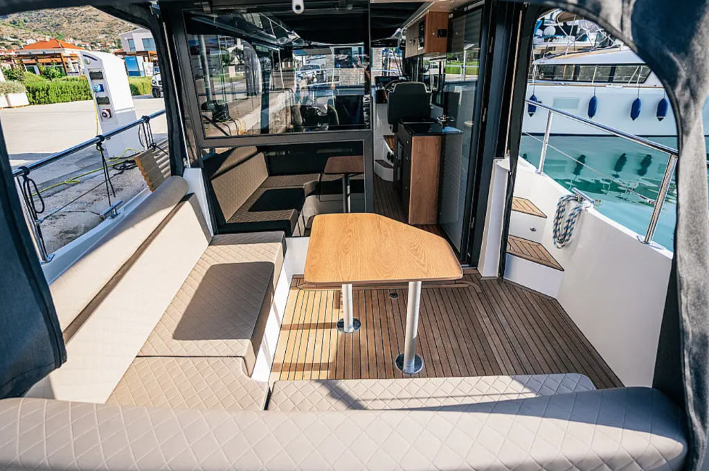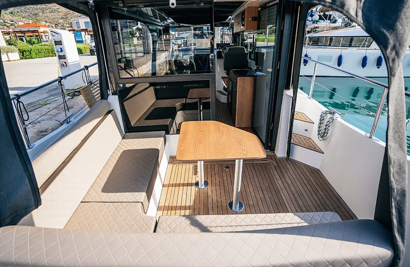 | Outside | Anker mit Kette, Biminitop, Cockpitdusche, elektr. Ankerwinsch, Gangway, Teak im Cockpit |