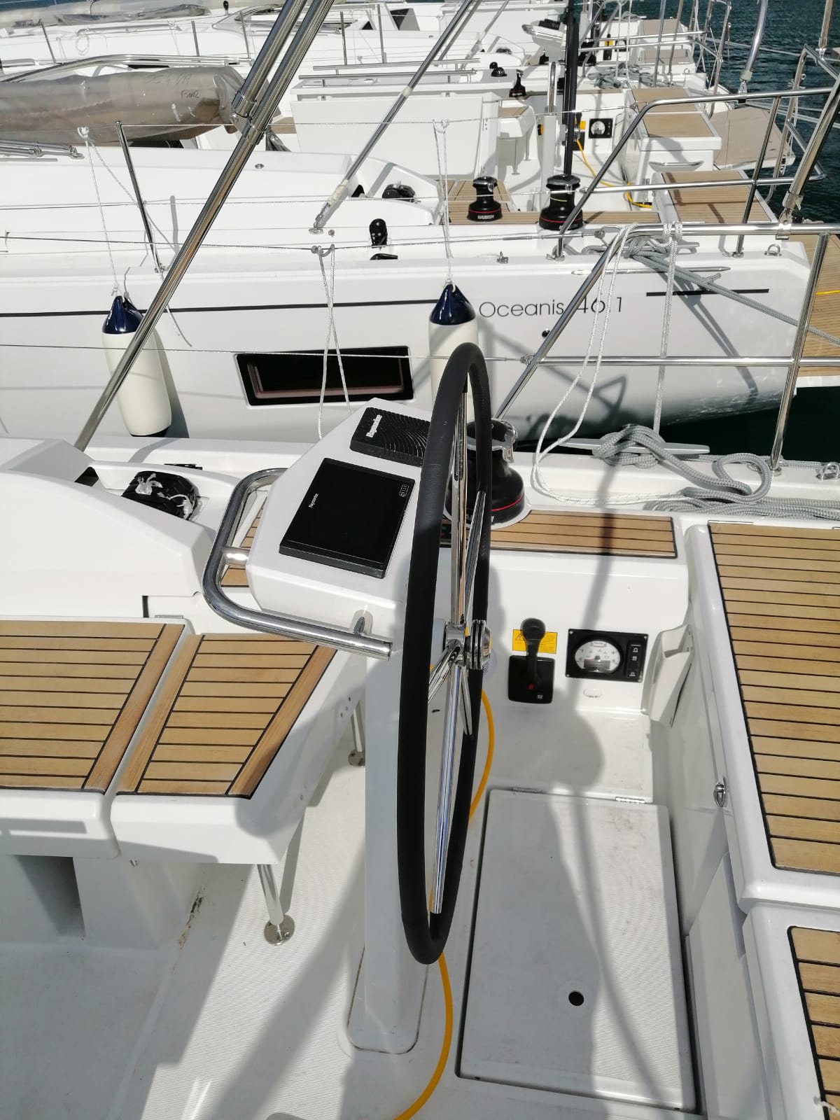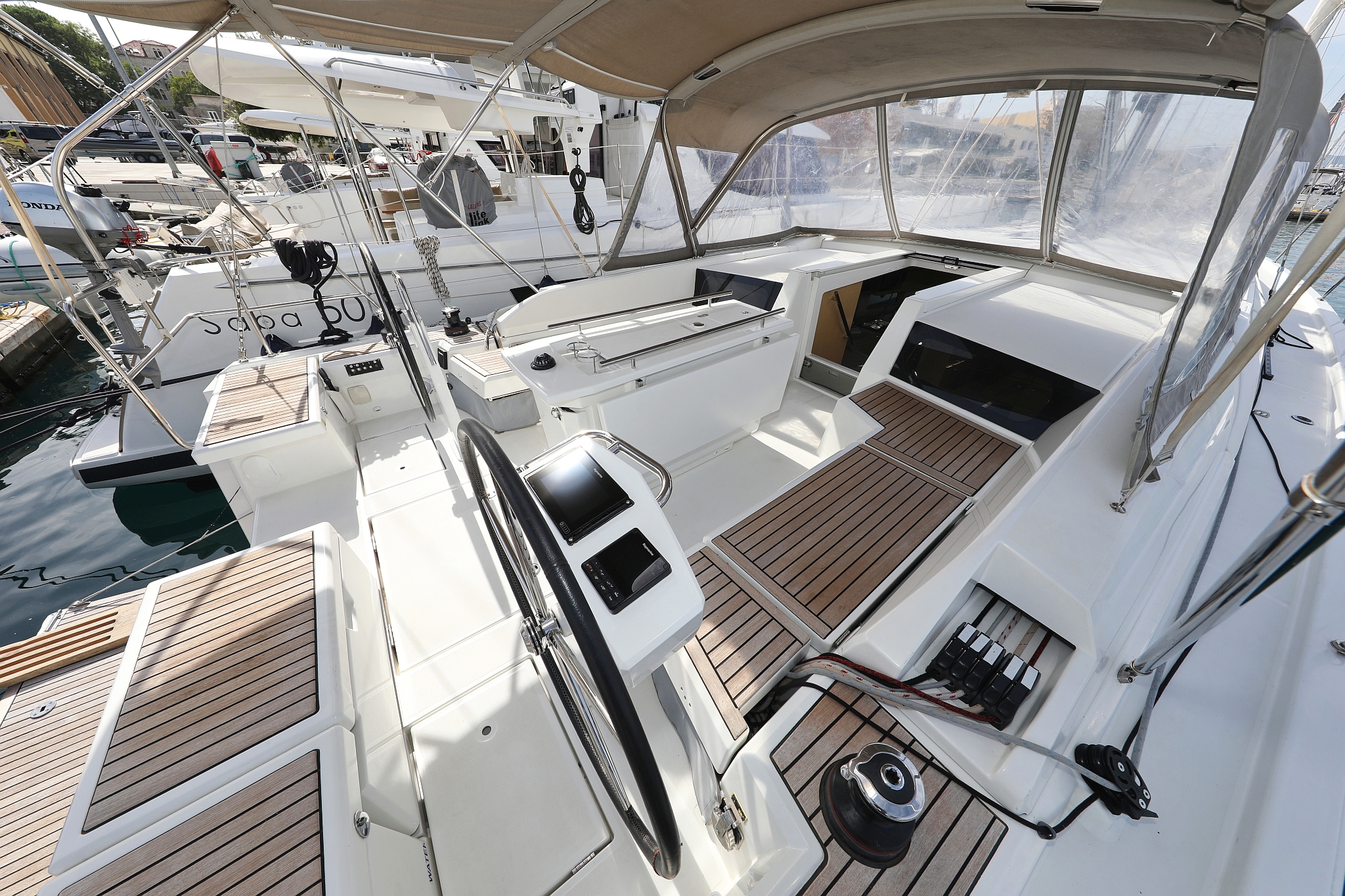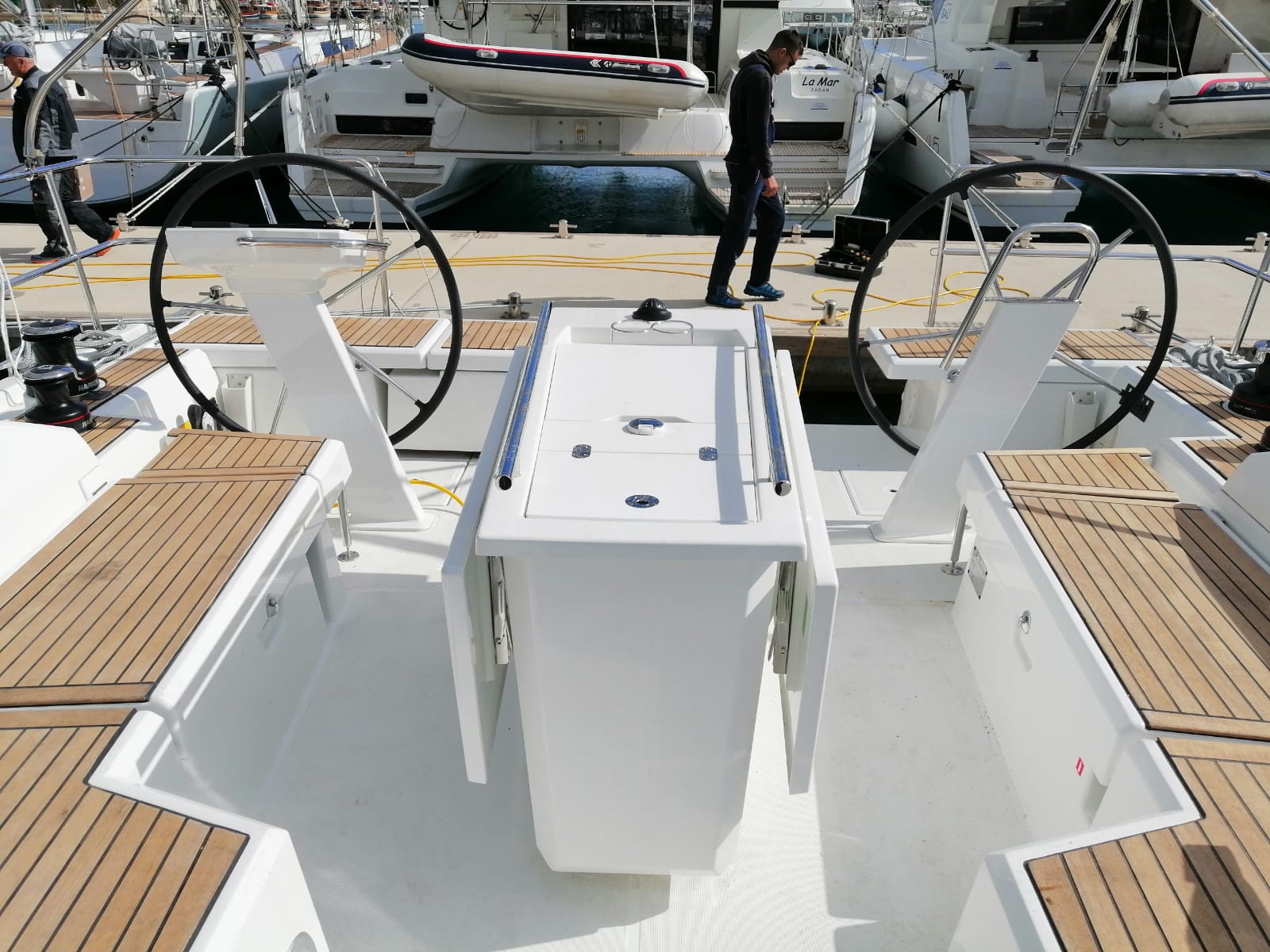 | Outside | 220 V-Landanschluss, Anker mit Kette, Badeplattform, Biminitop, Bootshaken, Cockpitdusche, Cockpitlautsprecher, Cockpitpolster, Cockpittisch, Delta-Anker, elektr. Ankerwinsch, Fender, Festmacherleinen, Gangway, Grill, Jambo Anker, Solaranlage, Sprayhood, Teak im Cockpit, Wasserschlauch, Winschen |