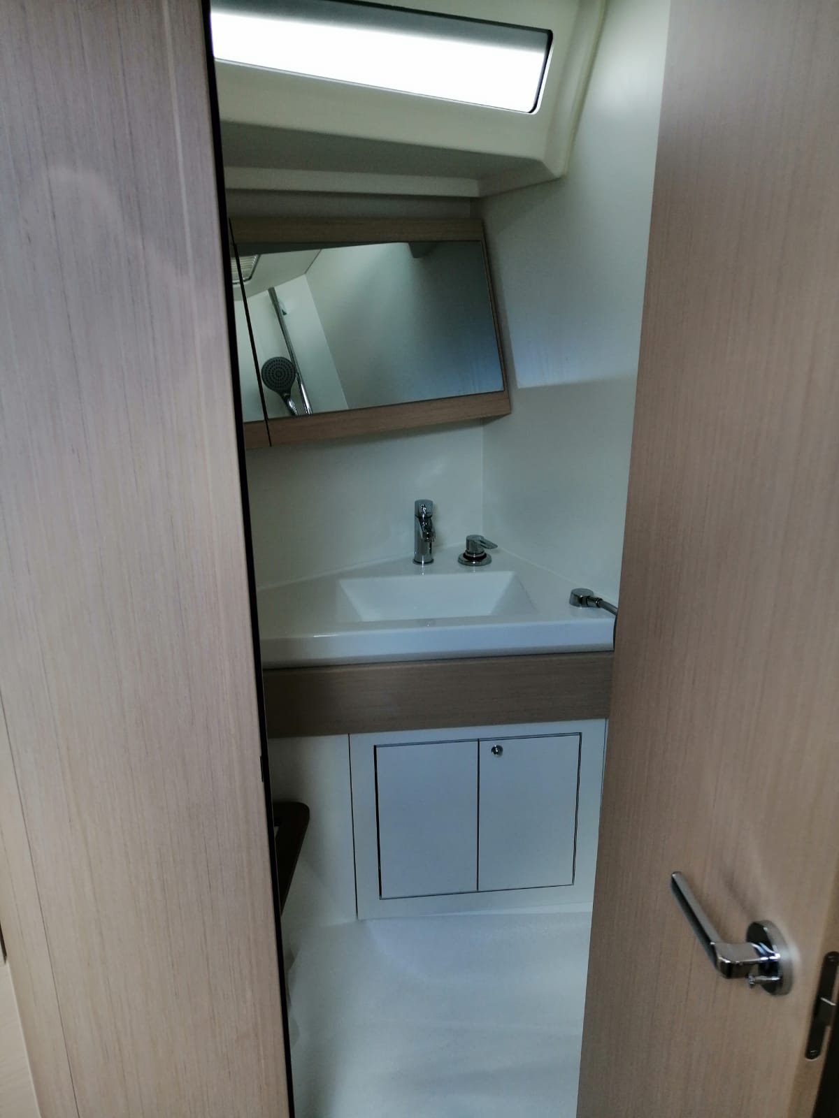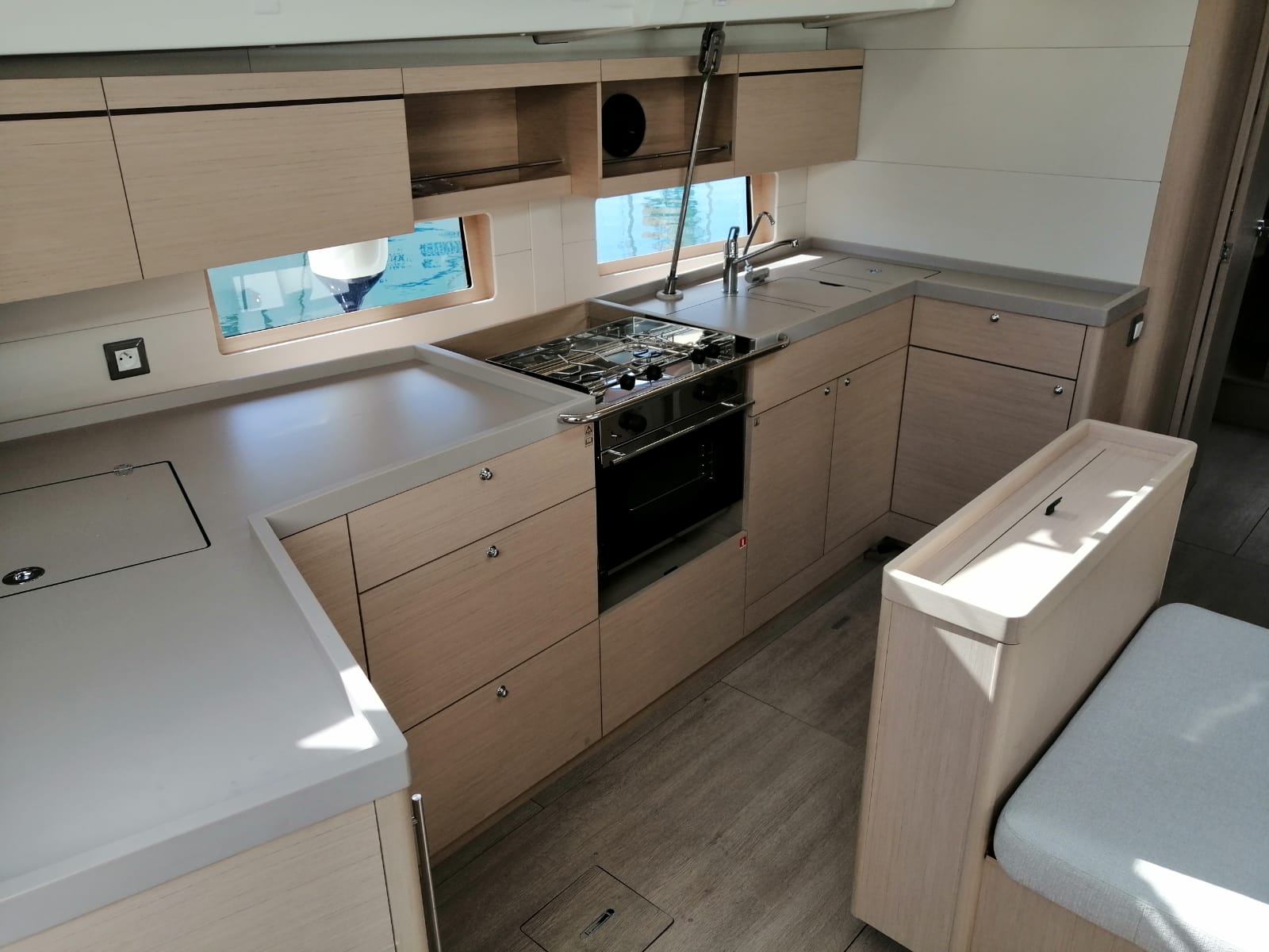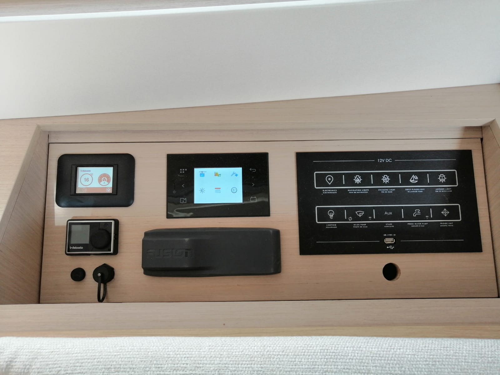 | Outside | 220 V-Landanschluss, Anker mit Kette, Badeplattform, Biminitop, Bootshaken, Cockpitdusche, Cockpitlautsprecher, Cockpitpolster, Cockpittisch, Delta-Anker, elektr. Ankerwinsch, Fender, Festmacherleinen, Gangway, Grill, Jambo Anker, Solaranlage, Sprayhood, Teak im Cockpit, Wasserschlauch, Winschen |