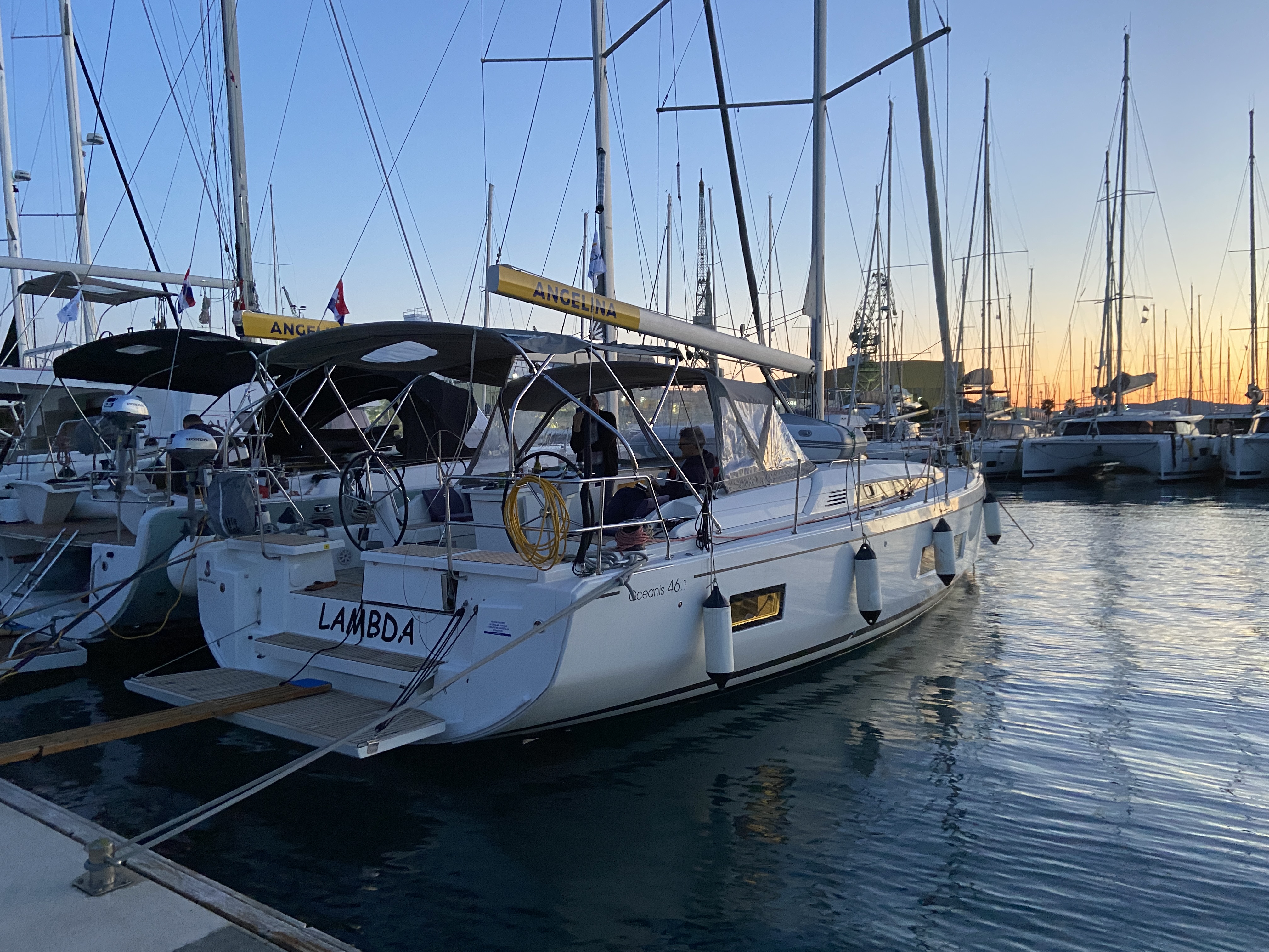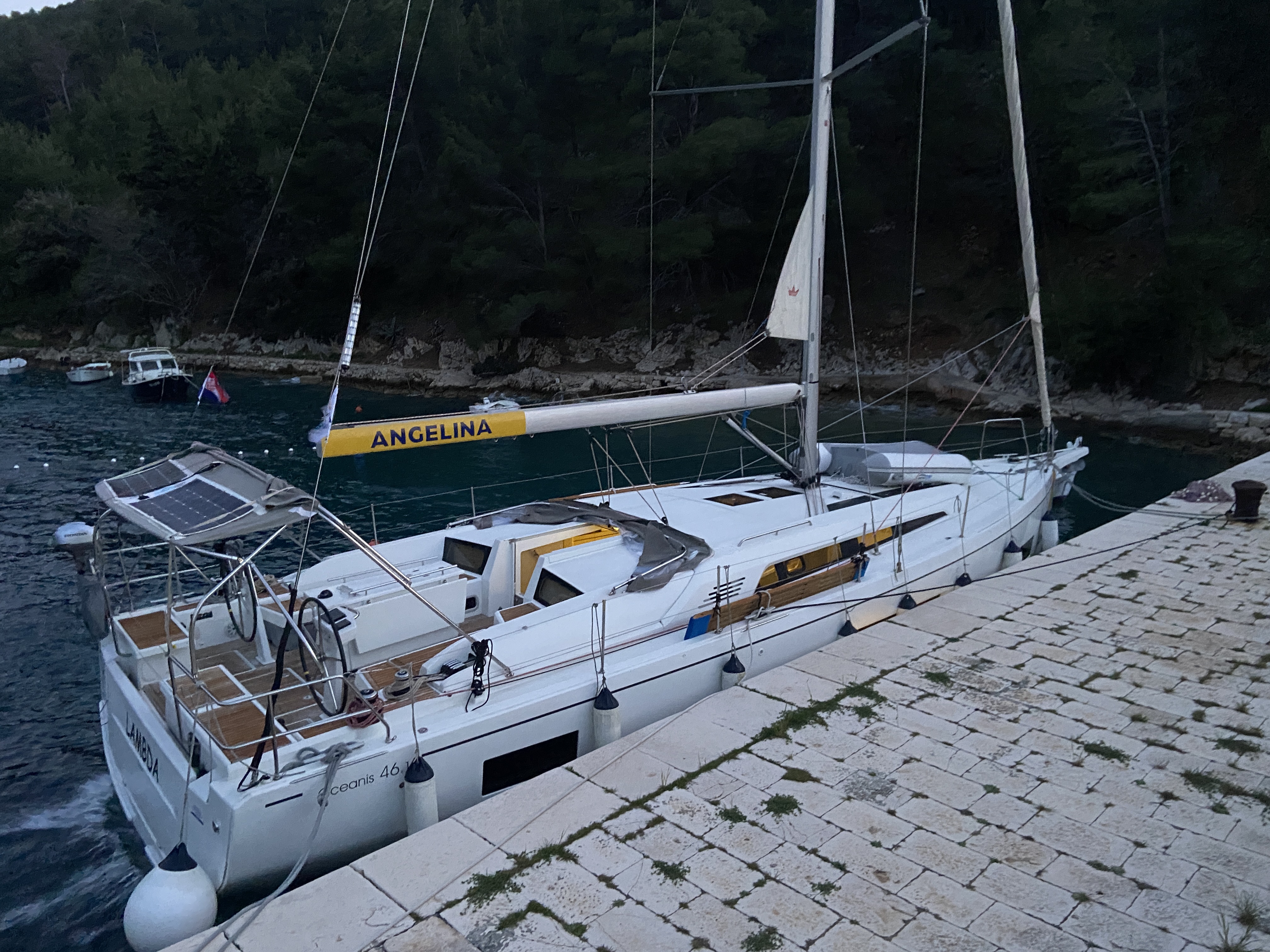 | Outside | 220 V-Landanschluss, Anker mit Kette, Badeplattform, Biminitop, Bootshaken, Cockpitdusche, Cockpitlautsprecher, Cockpitpolster, Cockpittisch, Delta-Anker, elektr. Ankerwinsch, Fender, Festmacherleinen, Gangway, Grill, Jambo Anker, Solaranlage, Sprayhood, Teak im Cockpit, Winschen |