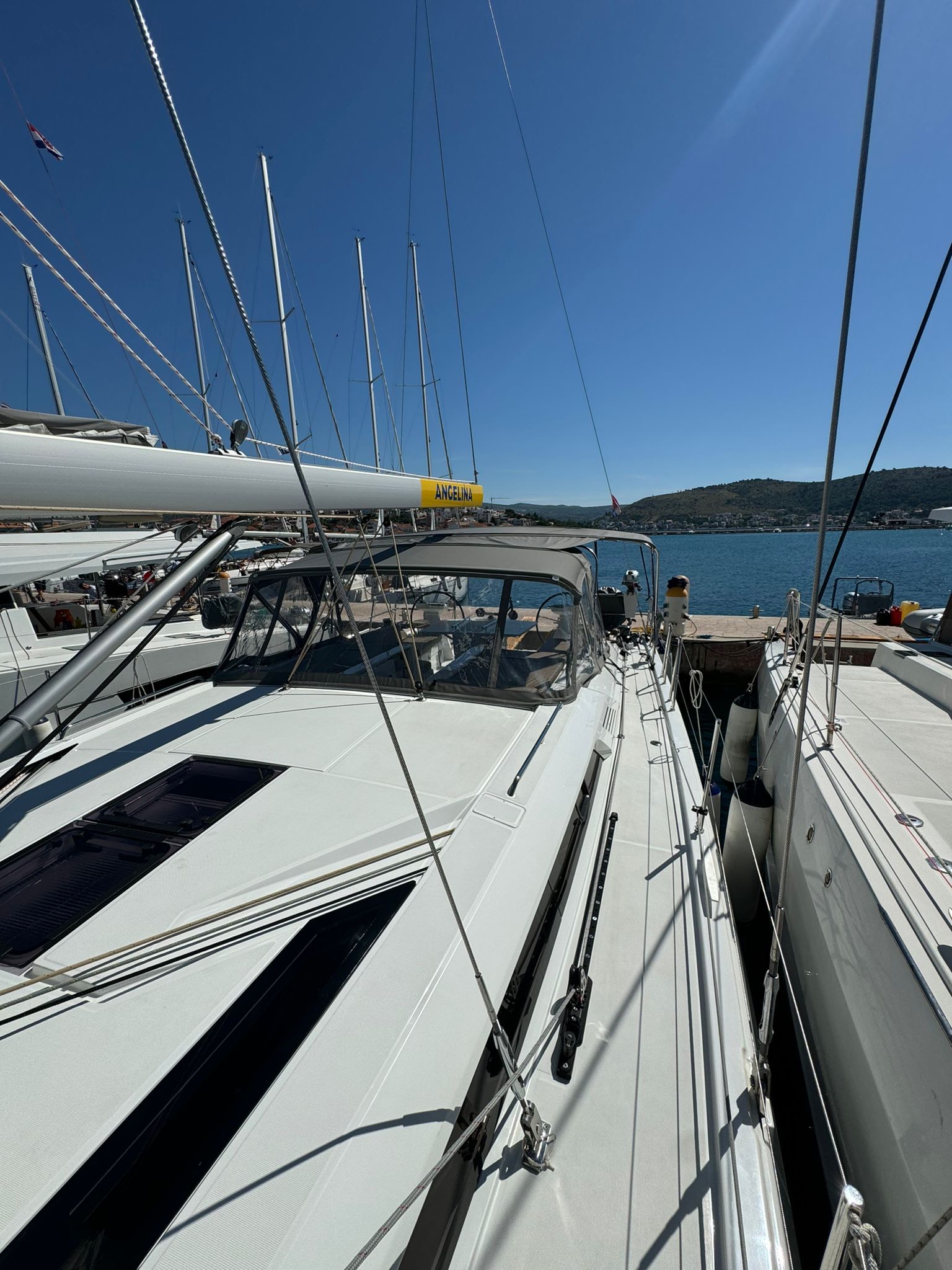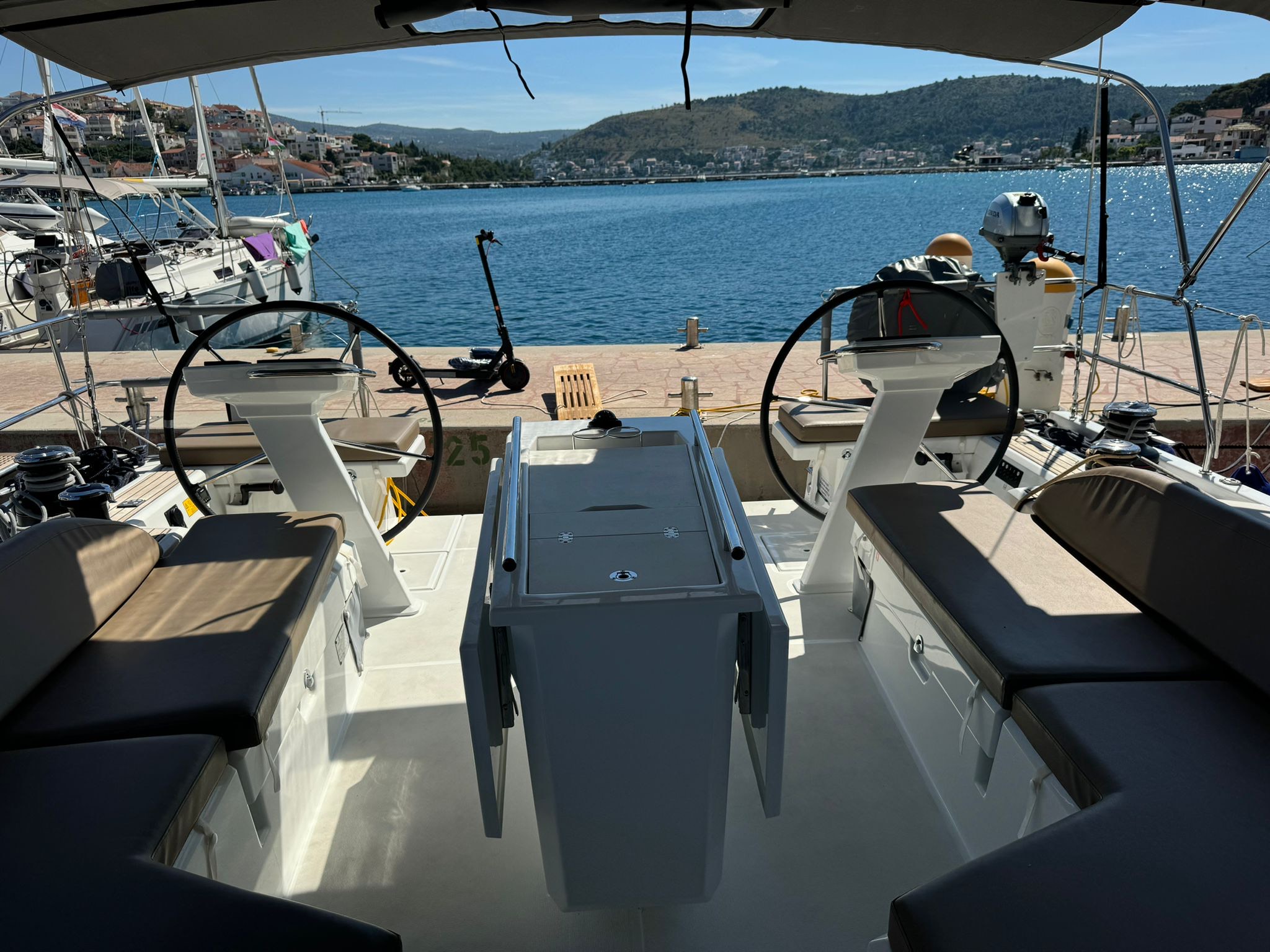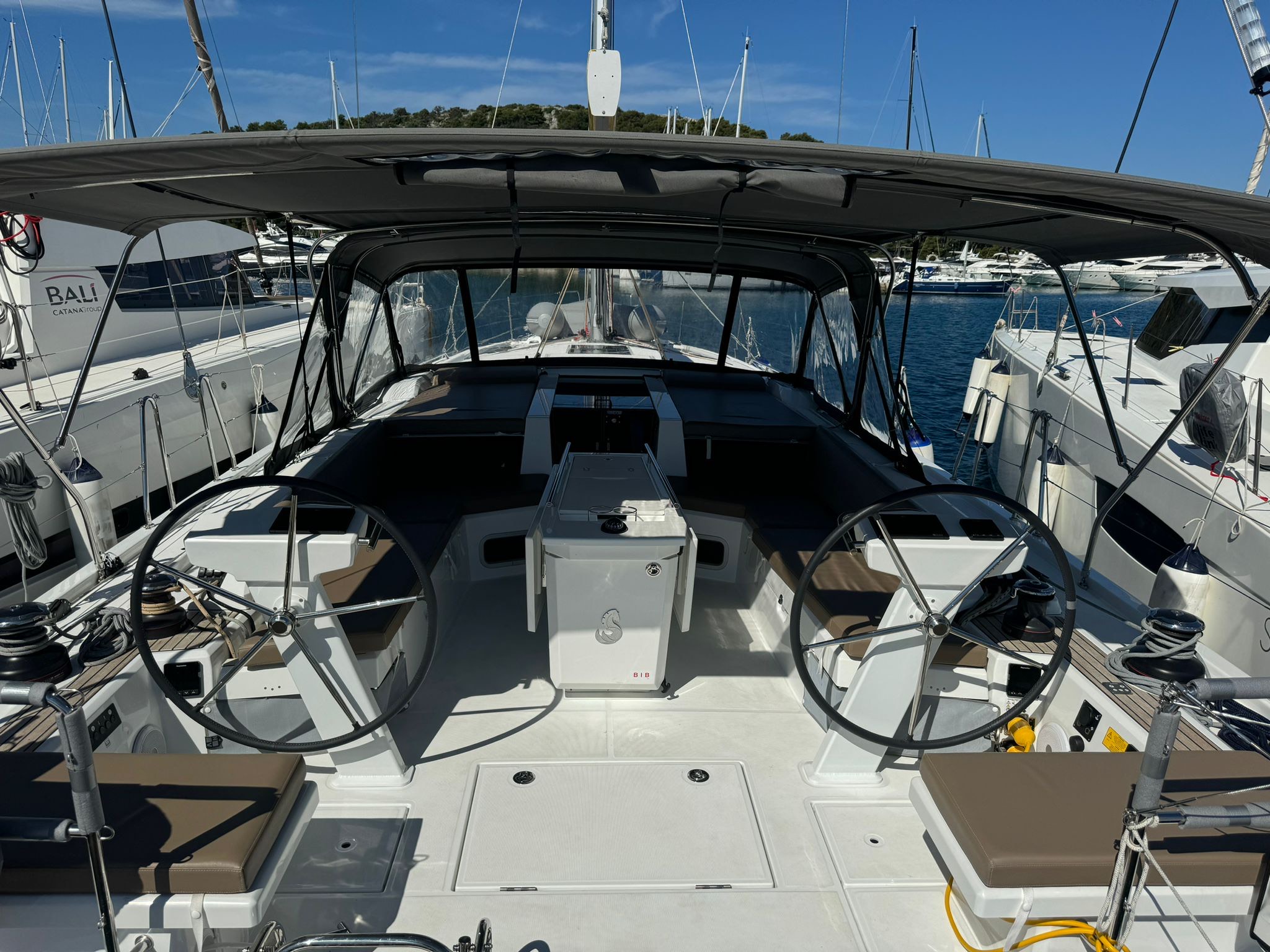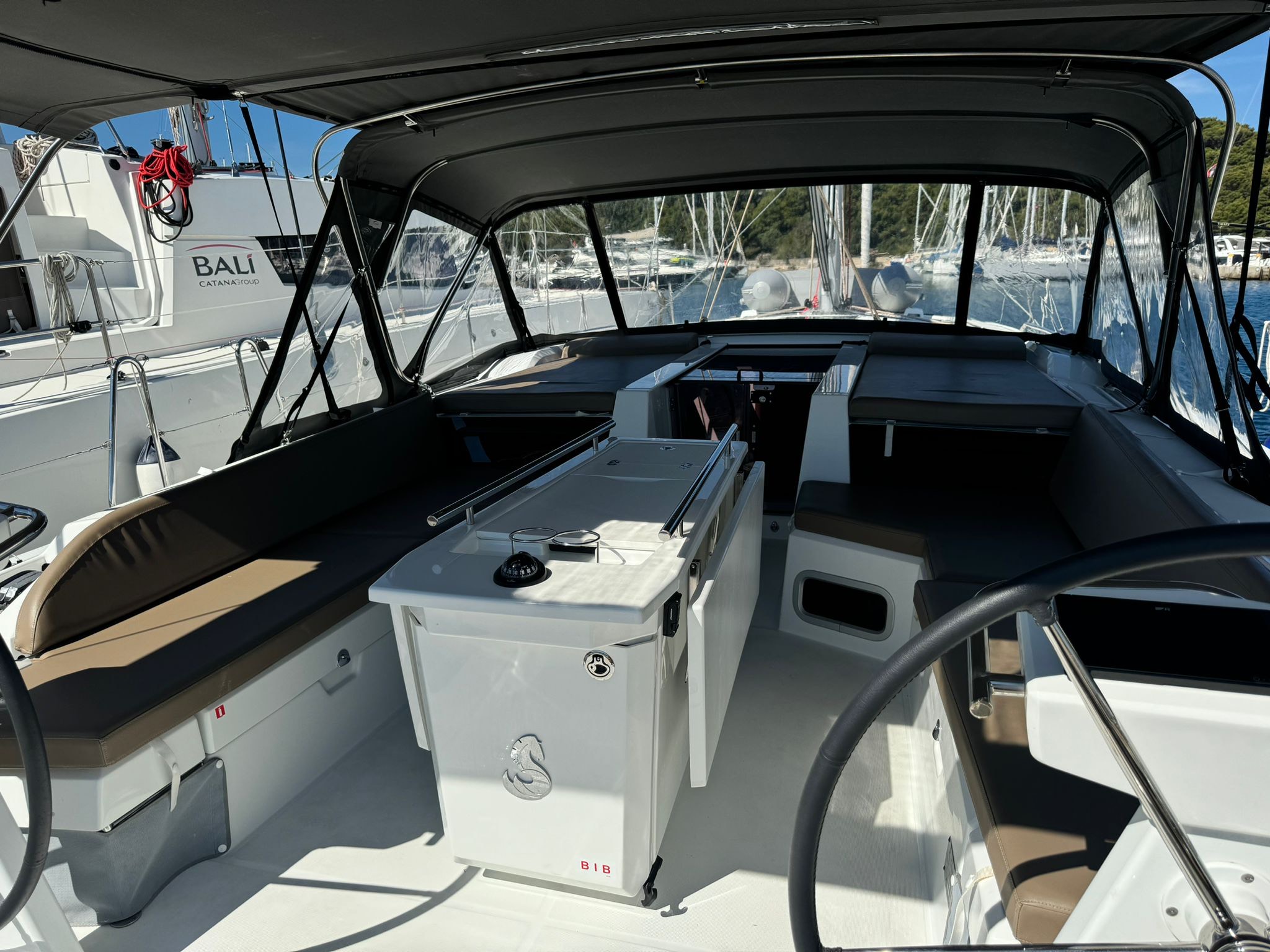 | Outside | 220 V-Landanschluss, Anker mit Kette, Badeplattform, Biminitop, Bootshaken, Cockpitdusche, Cockpitlautsprecher, Cockpitpolster, Cockpittisch mit Eisbox, Delta-Anker, elektr. Ankerwinsch, Fender, Festmacherleinen, Gangway, Jambo Anker, Solaranlage, Sprayhood, Teak im Cockpit, Wasserschlauch, Winschen |