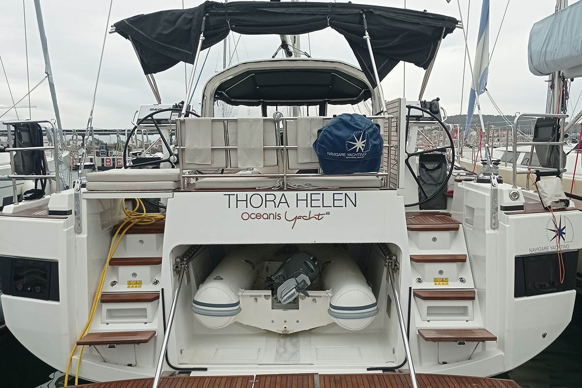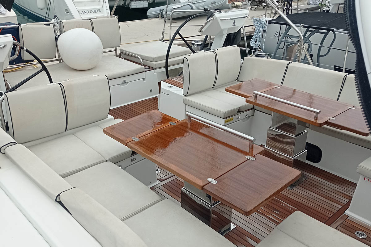 | Outside | 12 V-Anschluss, 220 V-Landanschluss, Anker mit Kette, Badeleiter, Badeplattform, Biminitop, Cockpitdusche, Cockpitlautsprecher, Cockpitpolster, Cockpittisch absenkbar, elektr. Ankerwinsch, elektr. Winsch, Sprayhood, Teak im Cockpit, Windex, Winschen |