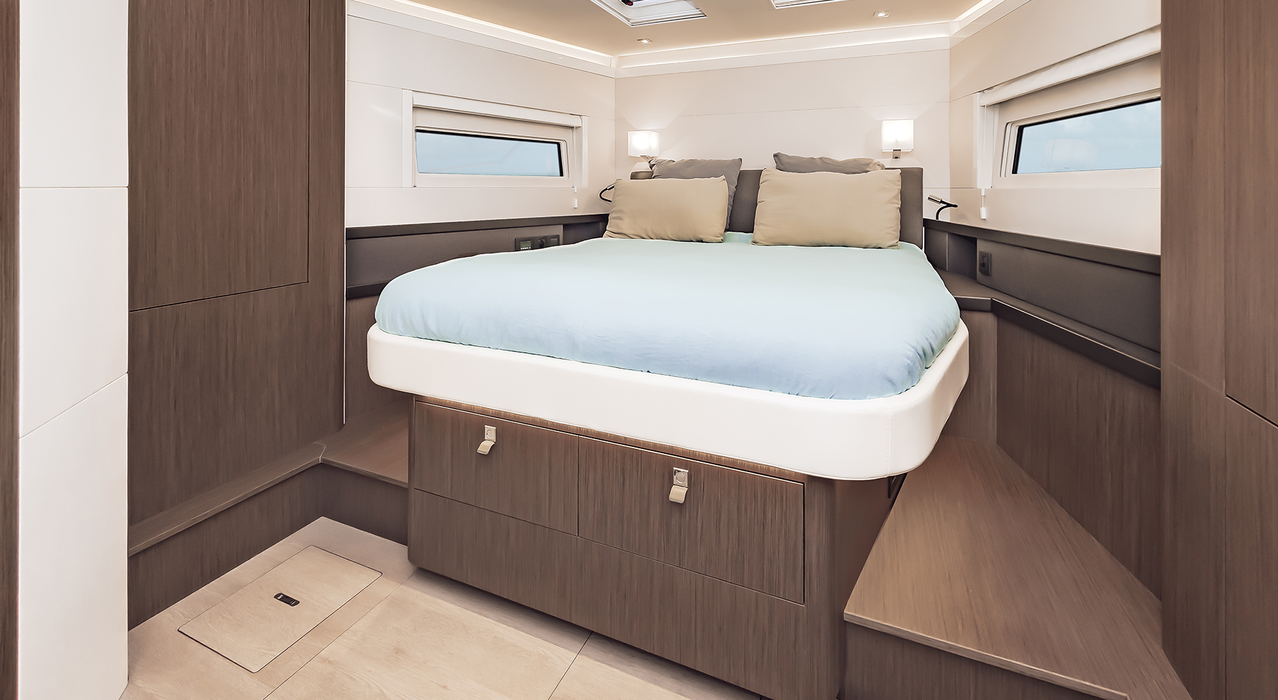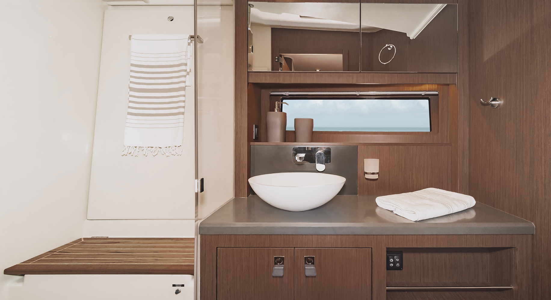 | Inside | Backofen, Eisbox, Fäkalientank, FUSION Sound System, Gasherd, Generator, Geschirrspüler, Inverter 12V/220V, Kaffeemaschine, Klimaanlage (ohne Landstrombedarf), Kühlschrank, Ladegerät, Lautsprecher im Salon, Mikrowelle, Moskitonetze, Pantryausstattung, Radio mit USB, Spülbecken, TV, USB Steckdosen in den Kabinen, Warmwasser, Watermaker, WC (elektr.), Weinkühlschrank |