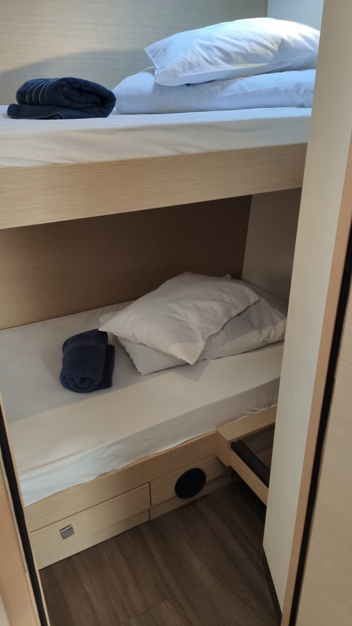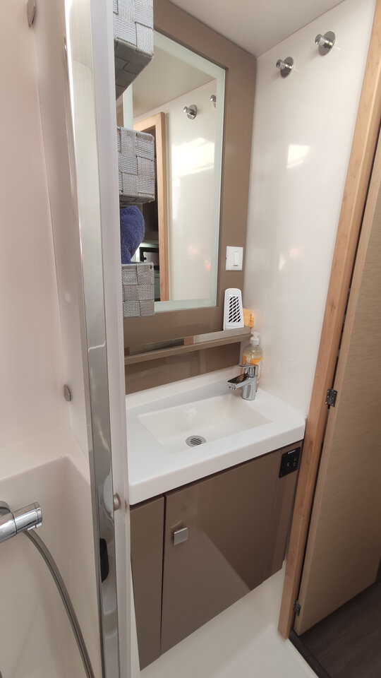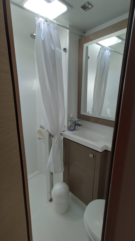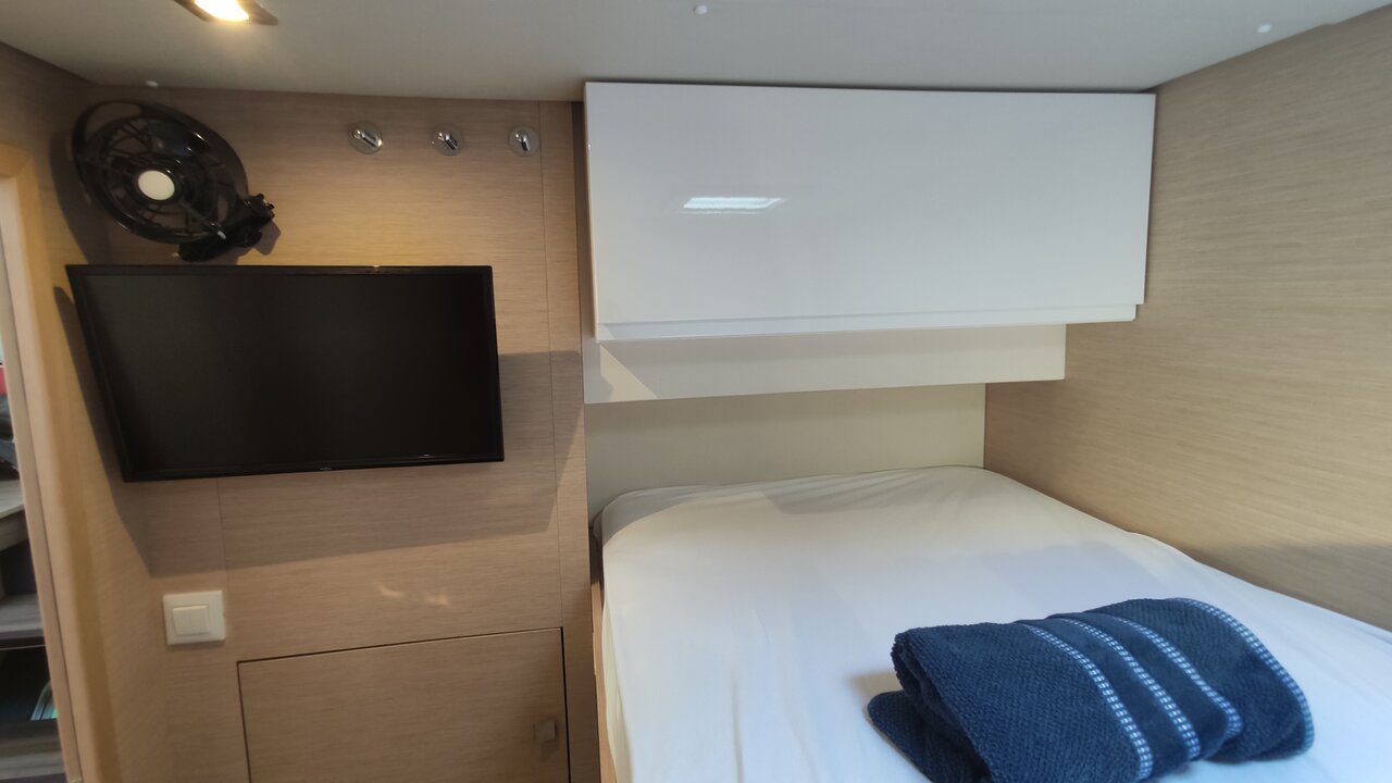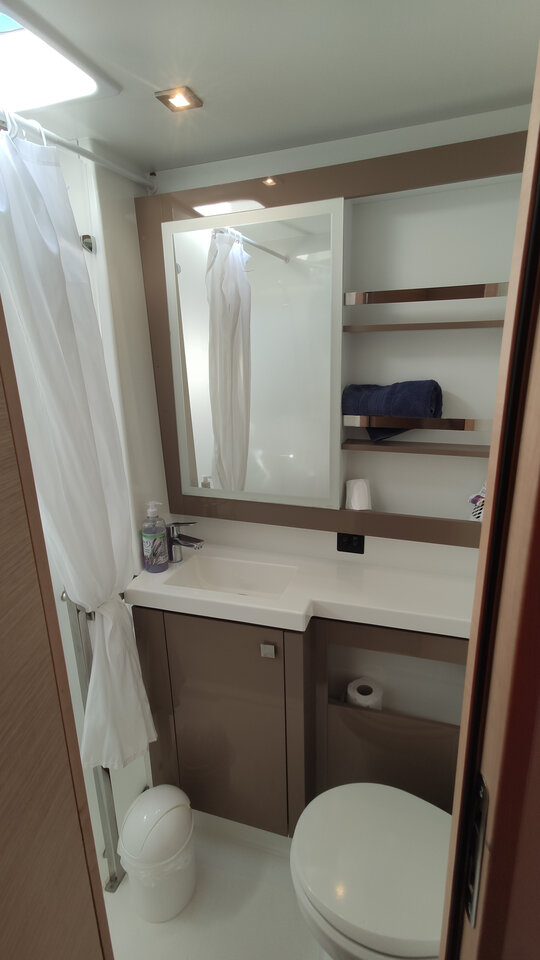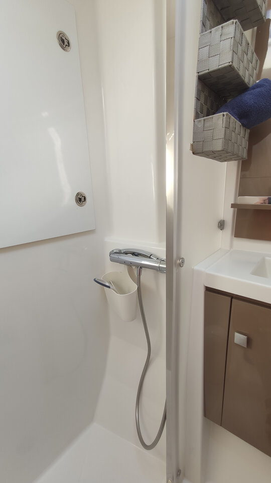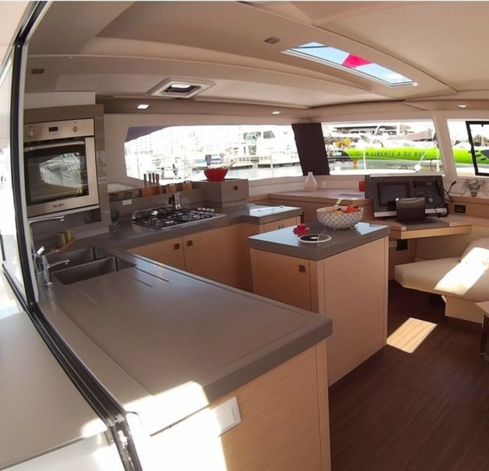 Inside Backofen, Borduhr, Dusche, Generator, Geschirrspüler, Heizung, Inverter 12V/220V, Klimaanlage (ohne Landstrombedarf), Kühlschrank, Ladegerät, Luftpumpe für Beiboot, Mikrowelle, Pantryausstattung, Radio, Salontisch absenkbar, Satelliten-TV, Ventilatoren in Kabinen, Warmwasser, WC (elektr.)