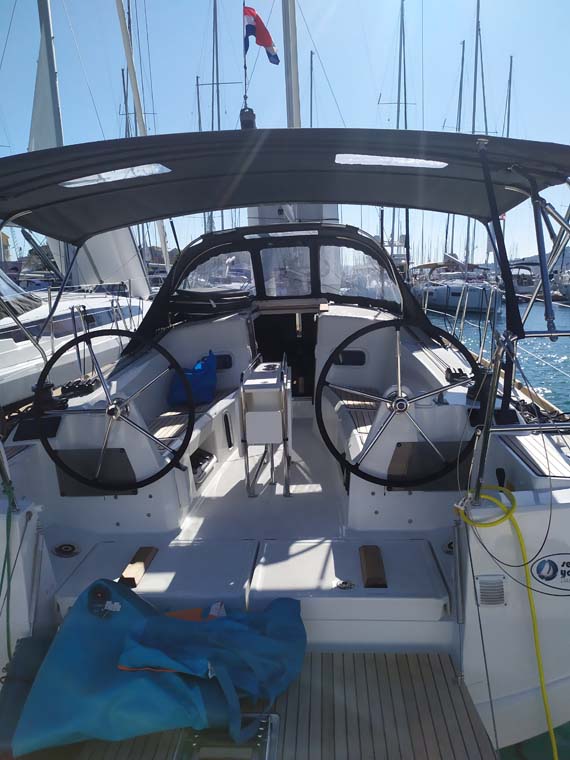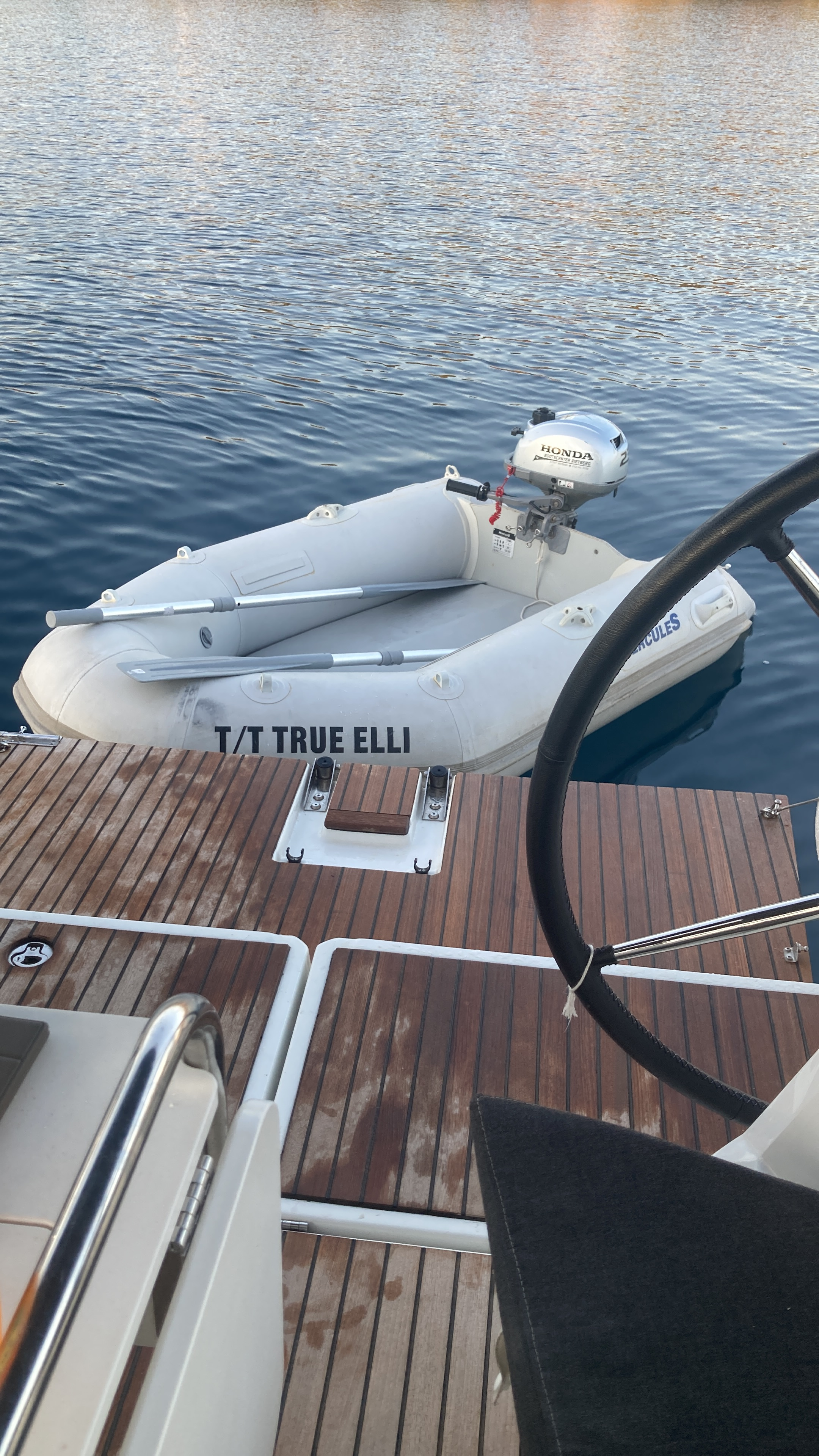 | Outside | 12 V-Anschluss, Anker mit Kette, Badeleiter, Badeplattform, Biminitop, Cockpitdusche, Cockpittisch, elektr. Ankerwinsch, Fender, Festmacherleinen, Gangway, Solaranlage, Sprayhood, Unterwasserbeleuchtung, Wasserschlauch, Windex |
