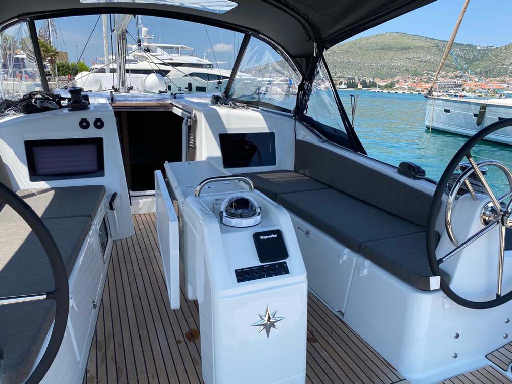 | Outside | 12 V-Anschluss, Anker mit Kette, Badeleiter, Badeplattform, Biminitop, Cockpitdusche, Cockpittisch, elektr. Ankerwinsch, elektr. Winsch, Fender, Festmacherleinen, Gangway, Solaranlage, Sprayhood, Teak im Cockpit, Unterwasserbeleuchtung, Wasserschlauch, Windex |