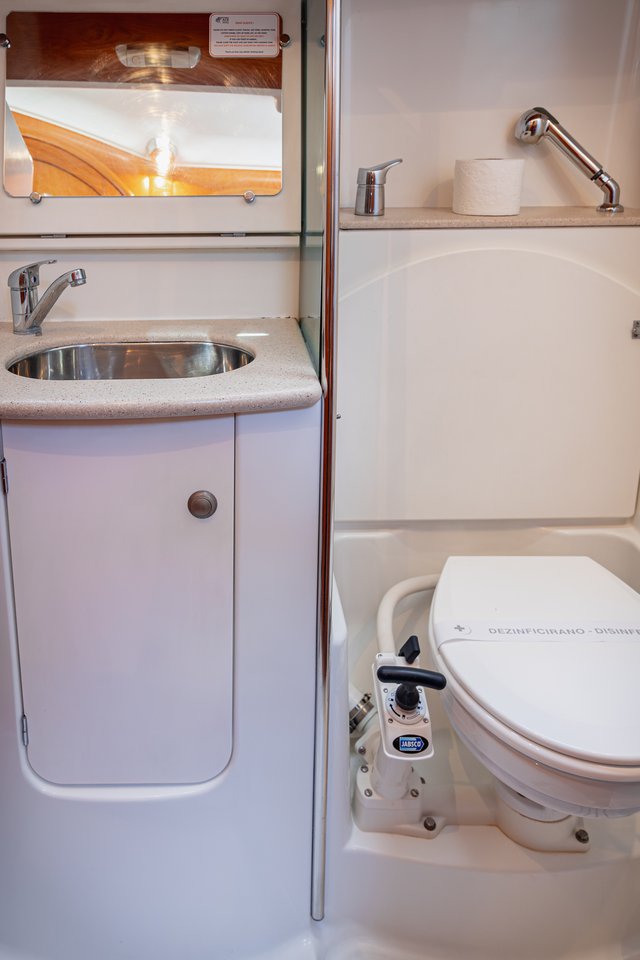 | Outside | 12 V-Anschluss, 220 V-Landanschluss, Anker mit Kette, Badeleiter, Biminitop, Cockpitdusche, Cockpitlautsprecher, Cockpitpolster, Cockpittisch, elektr. Ankerwinsch, Fender, Festmacherleinen, Sprayhood, Teak im Cockpit, Wantenschneider, Windex |