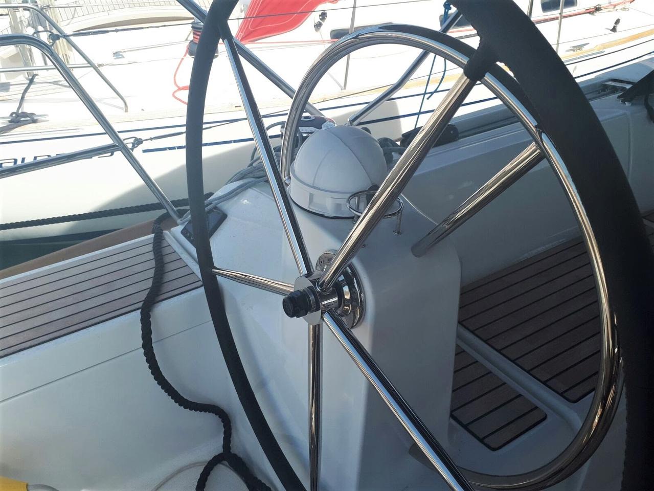 | Outside | 12 V-Anschluss, 220 V-Landanschluss, Anker mit Kette, Badeleiter, Badeplattform, Biminitop, Cockpitdusche, Cockpitlautsprecher, Cockpitpolster, Cockpittisch, elektr. Ankerwinsch, Fender, Festmacherleinen, Sprayhood, Teak im Cockpit, Windex |