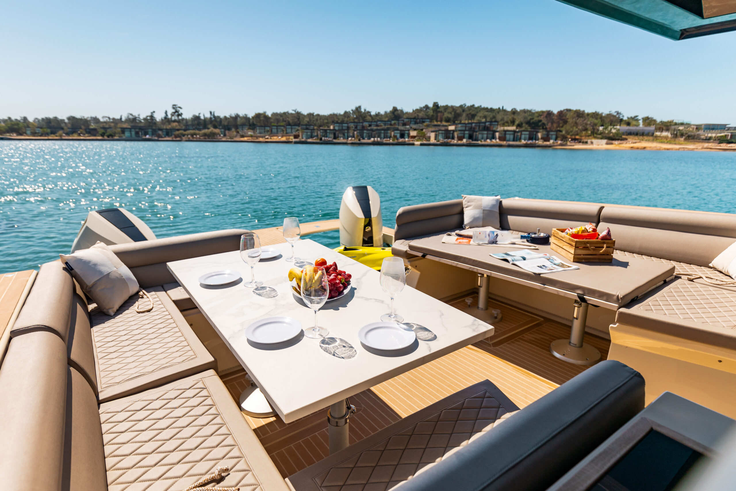 | Outside | Anker mit Kette, Biminitop, Cockpitdusche, Cockpitkühlschrank, elektr. Ankerwinsch, Grill |