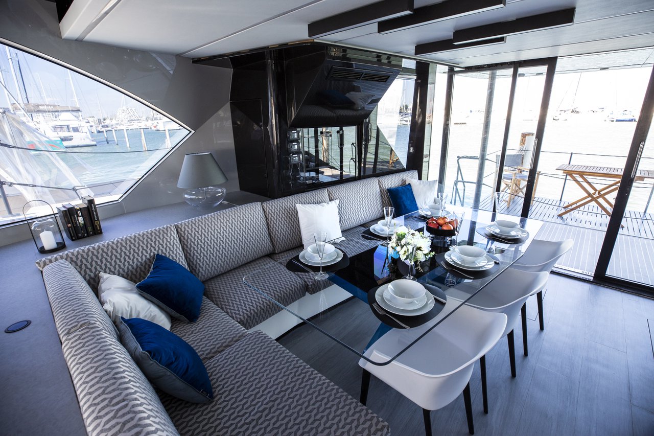 | Inside | Backofen, Eiswürfelmaschine, Gefrierschrank, Generator, Geschirrspüler, Heizung, Inverter 12V/220V, Kaffeemaschine, Klimaanlage (ohne Landstrombedarf), Kühlschrank, LCD Fernseher, Mikrowelle, Pantryausstattung, Radio, Safe für Wertsachen, Sound System, Tablet PC, Watermaker, WC (elektr.), Weinkühlschrank |