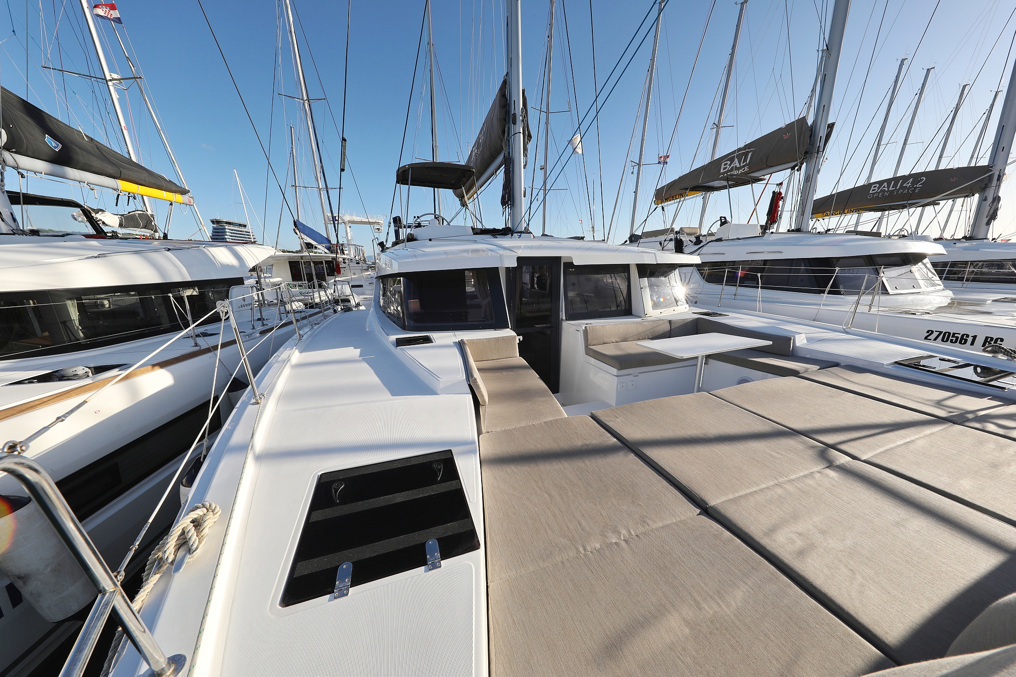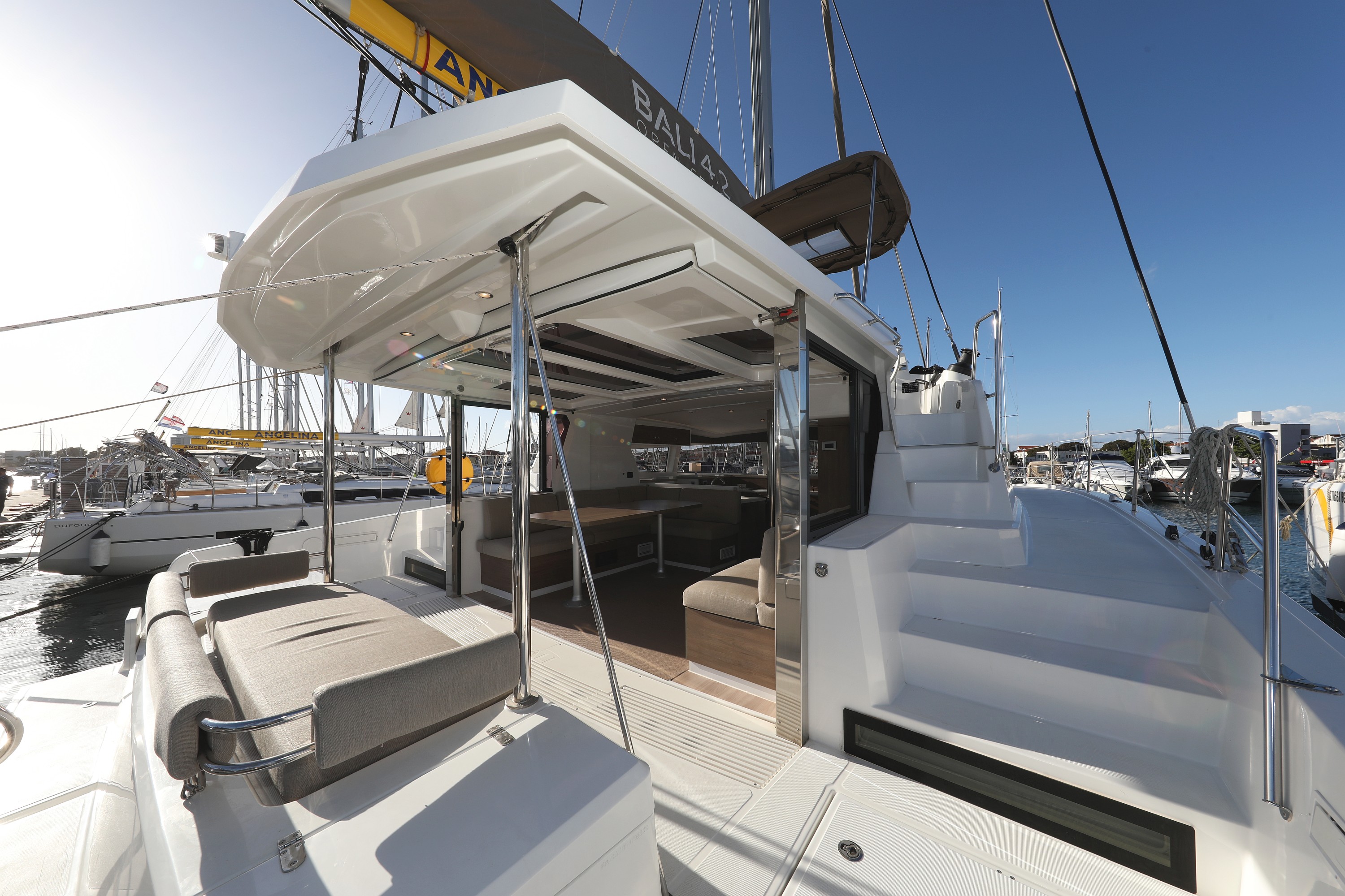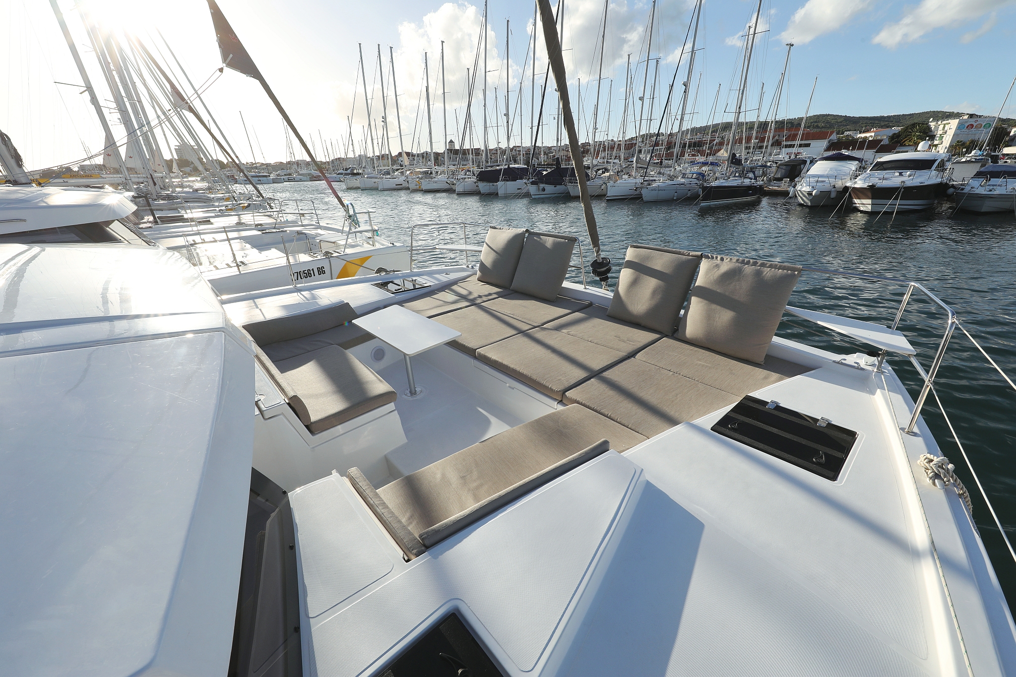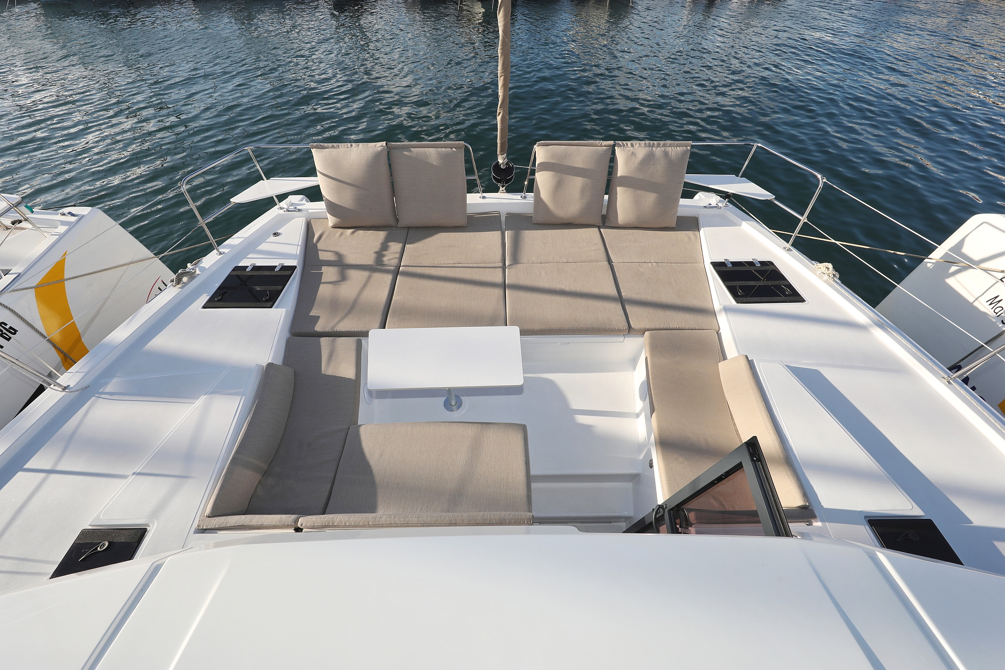 | Outside | 12 V-Anschluss, 220 V-Landanschluss, Anker mit Kette, Bootshaken, Cockpitdusche, Cockpitlautsprecher, Cockpitpolster, Cockpittisch, Deckpolster, elektr. Ankerwinsch, elektr. Winsch, Fender, Festmacherleinen, Gangway, Grill, Hardtop, Solaranlage, Sonnendeck, Wasserschlauch, Winschen |