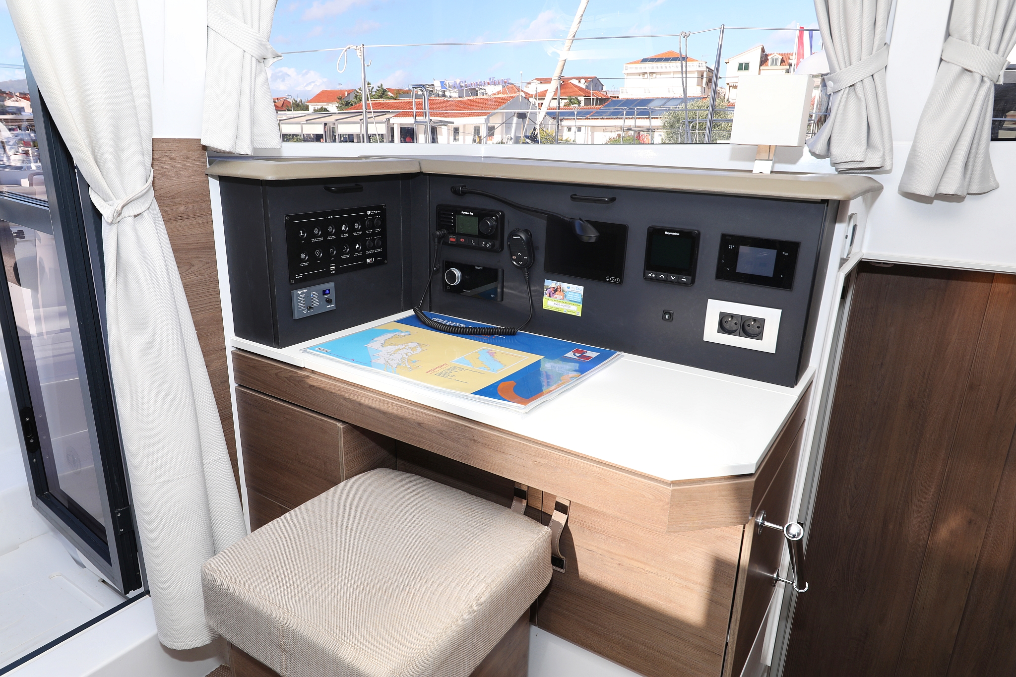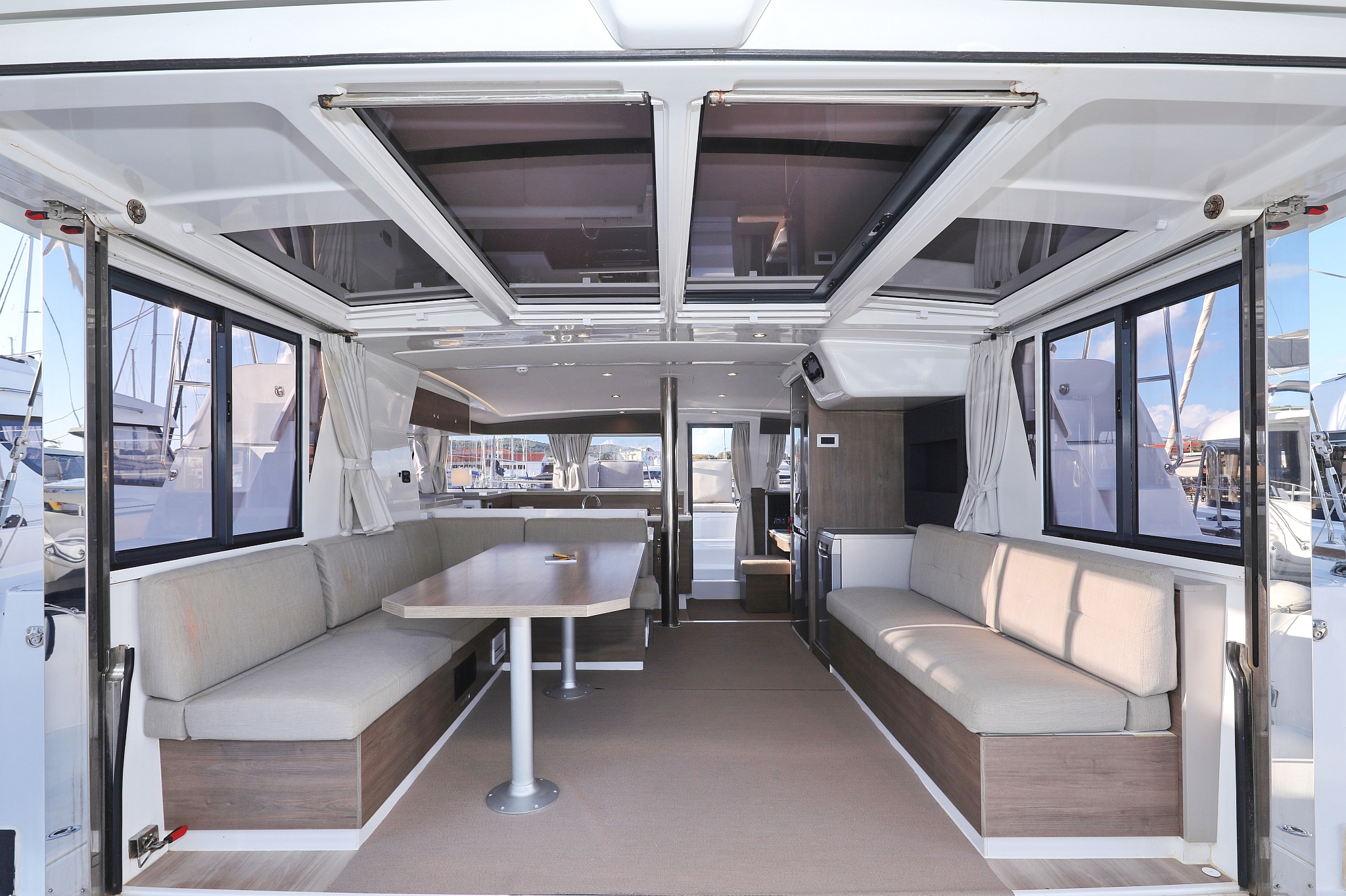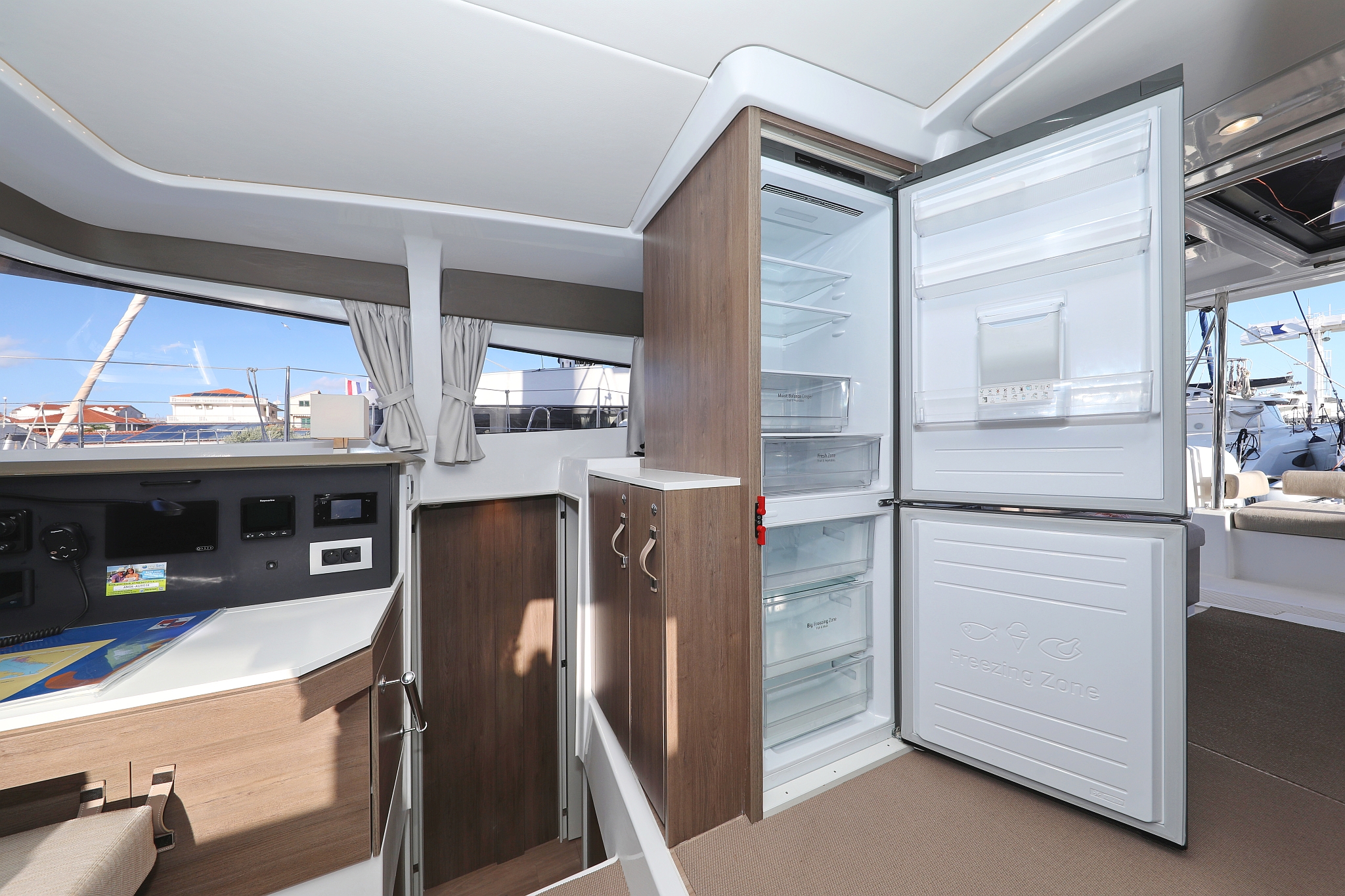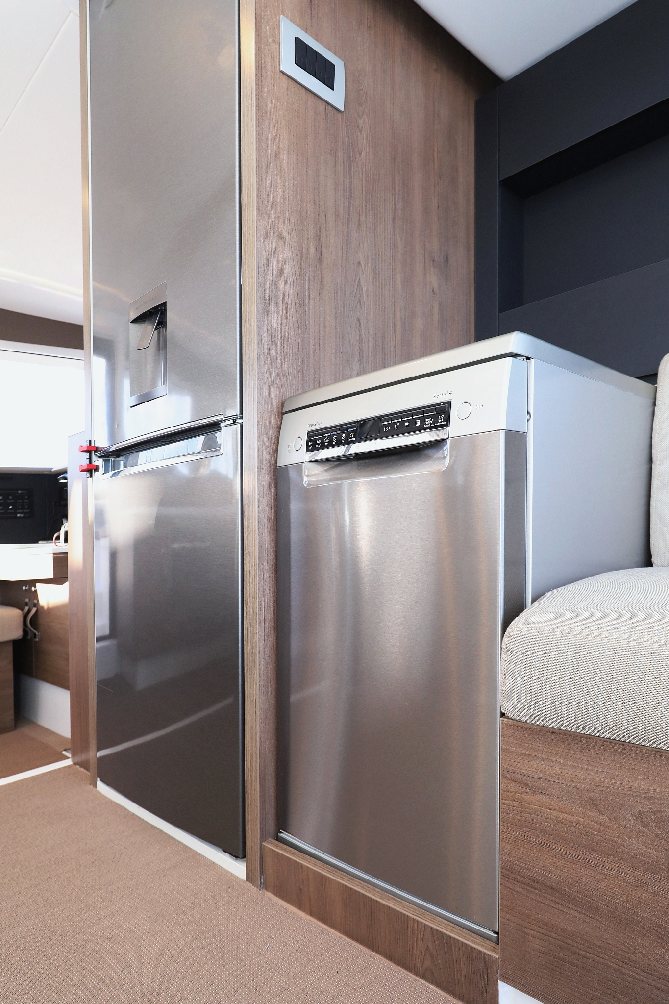 | Inside | 220V Steckdosen, Backofen, Fäkalientank, FUSION Sound System, Gasherd, Generator, Geschirrspüler, Heizung, Inverter 12V/220V, Klimaanlage (Landstrom), Kühlschrank mit Gefrierfach, Ladegerät, Mokkakanne, Moskitonetze, Pantryausstattung, Radio mit Bluetooth, Spülbecken, Wasserkocher, WC (elektr.) |