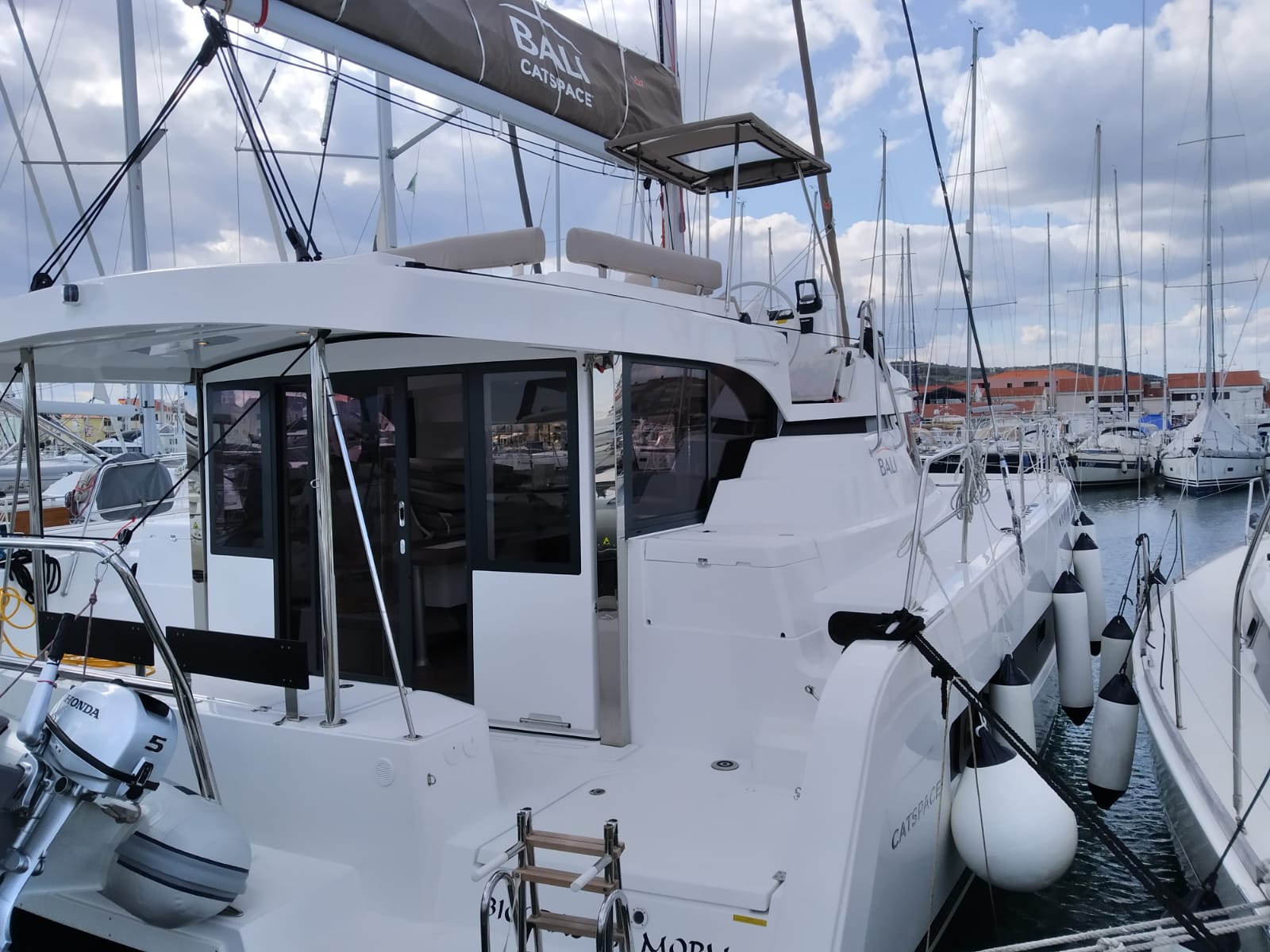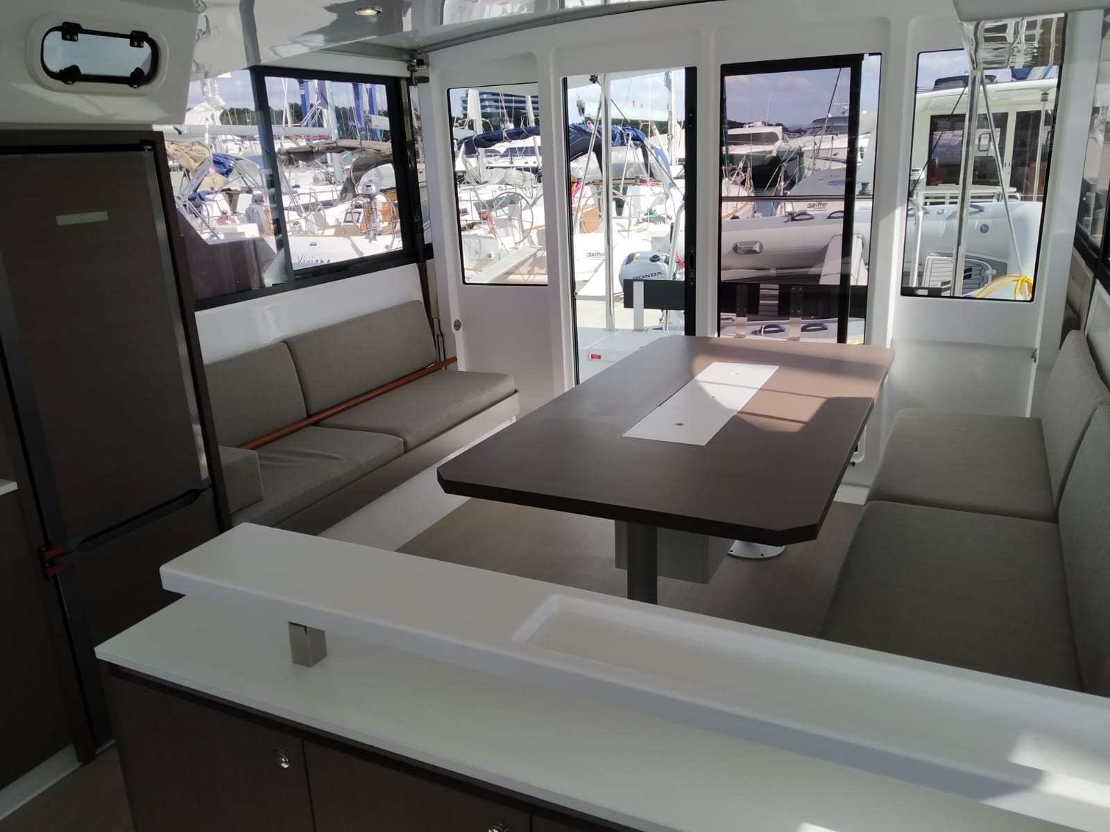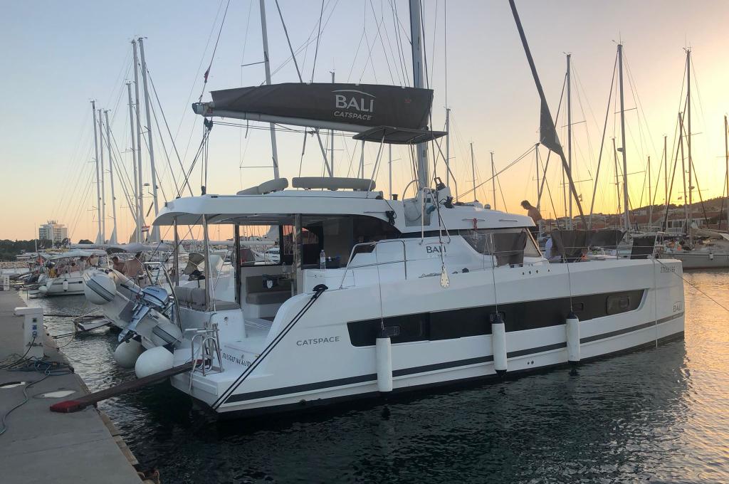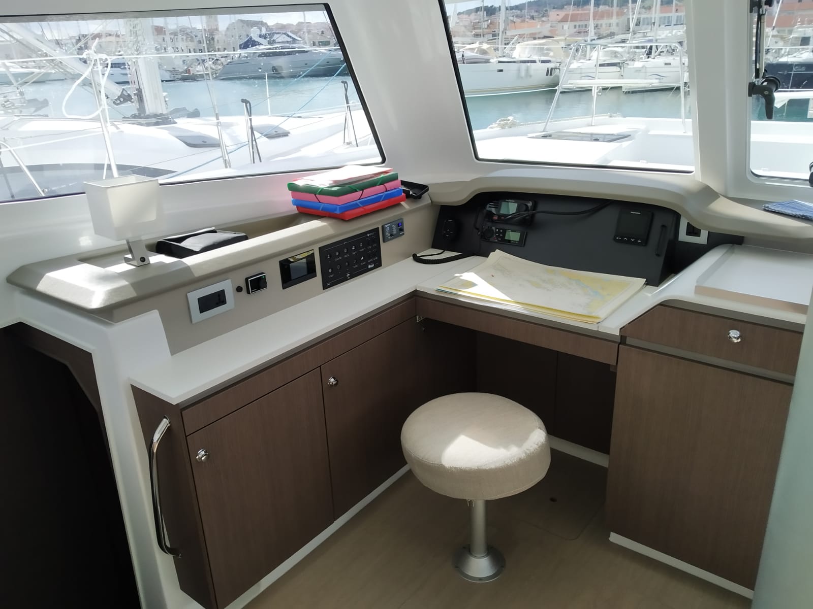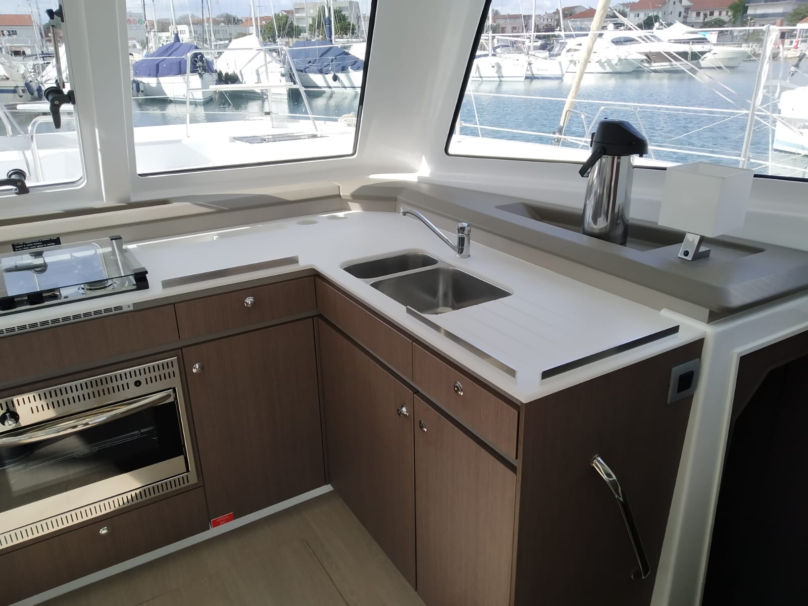 | Inside | 220V Steckdosen, Backofen, Fäkalientank, FUSION Sound System, Gasherd, Gefrierschrank, Heizung, Inverter 12V/220V, Klimaanlage (Landstrom), Kühlschrank, Ladegerät, Mokkakanne, Pantryausstattung, Radio mit Bluetooth, Spülbecken, USB Steckdosen in den Kabinen, Ventilatoren in Kabinen, Wasserkocher |