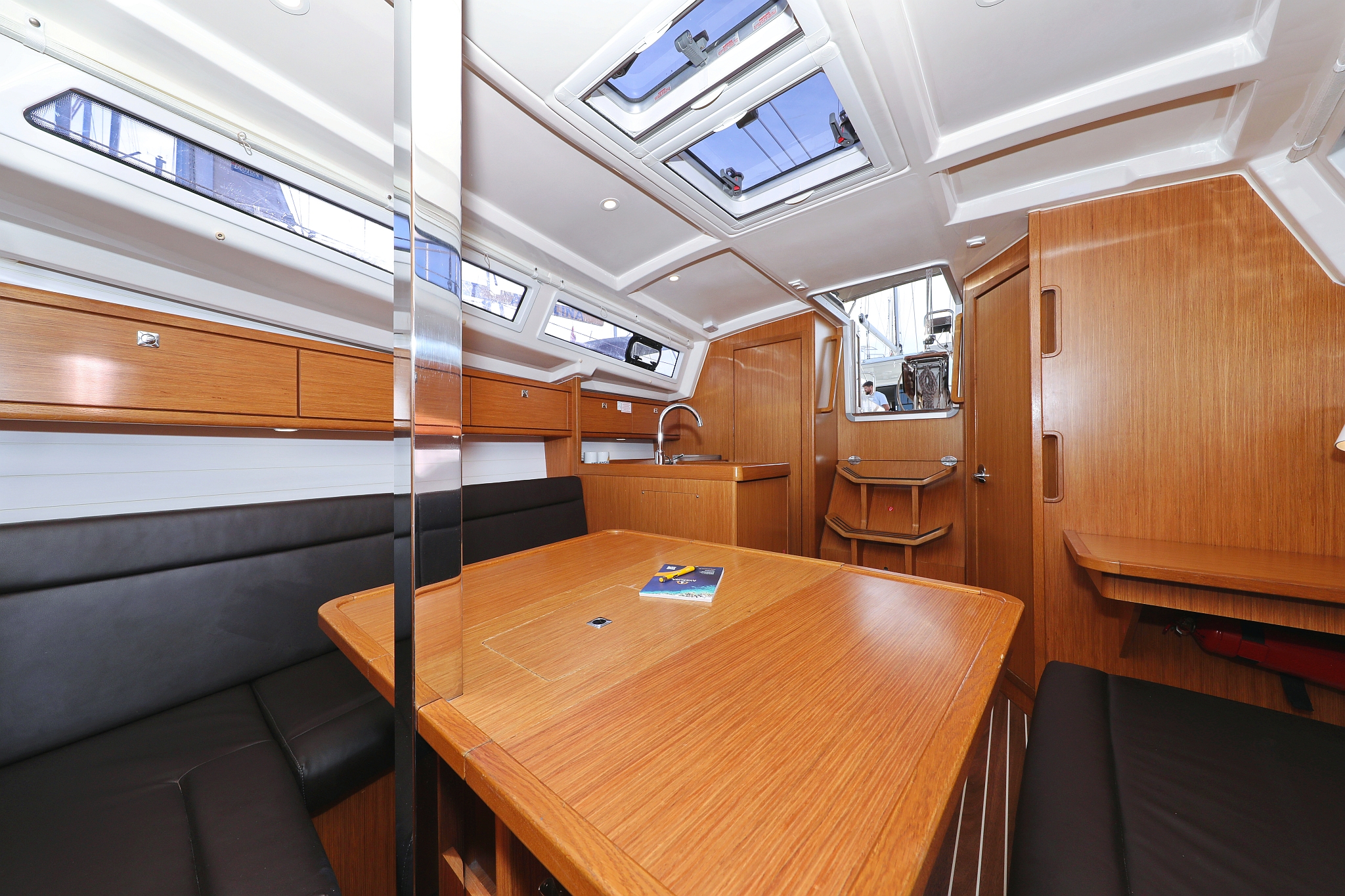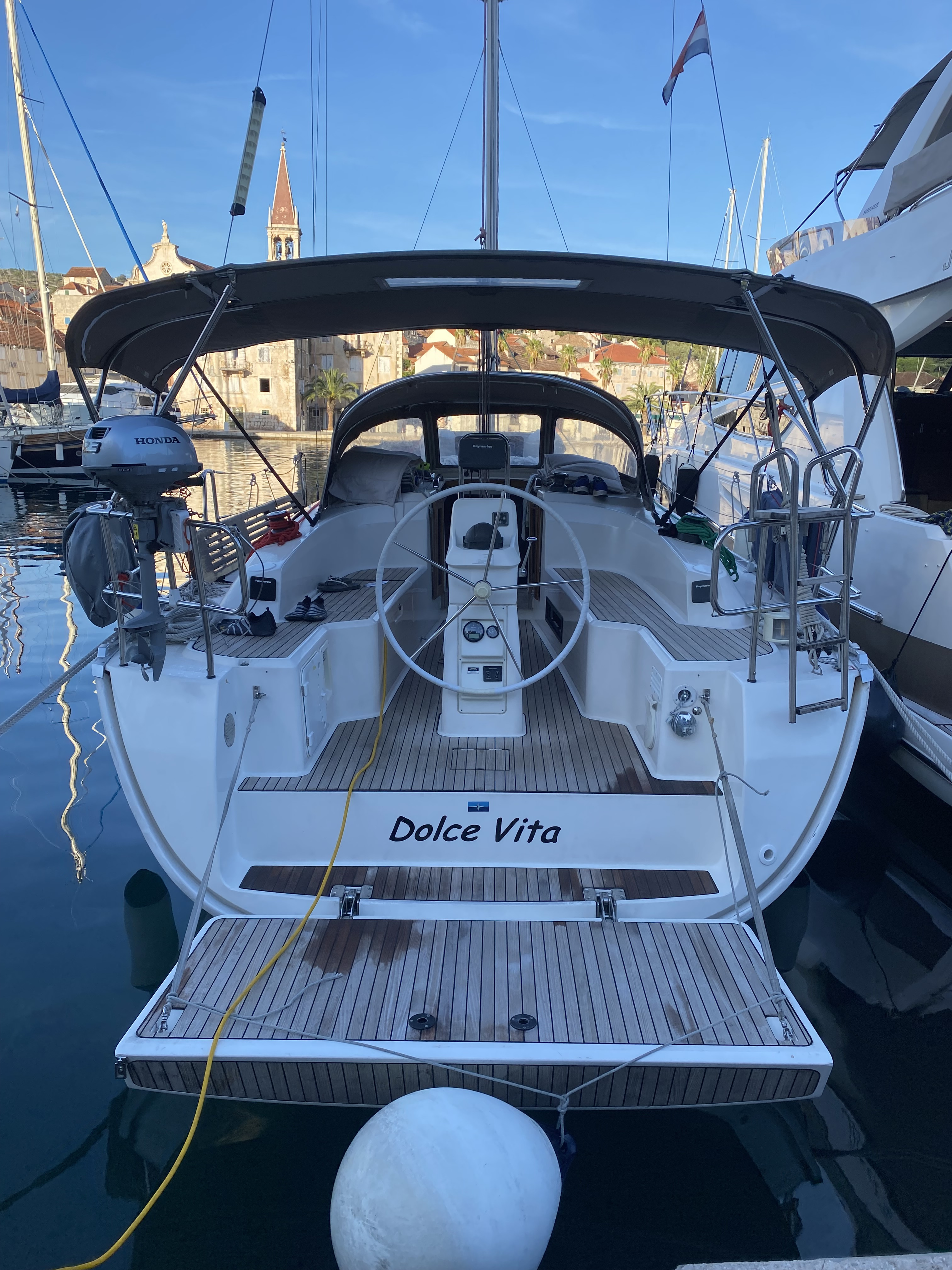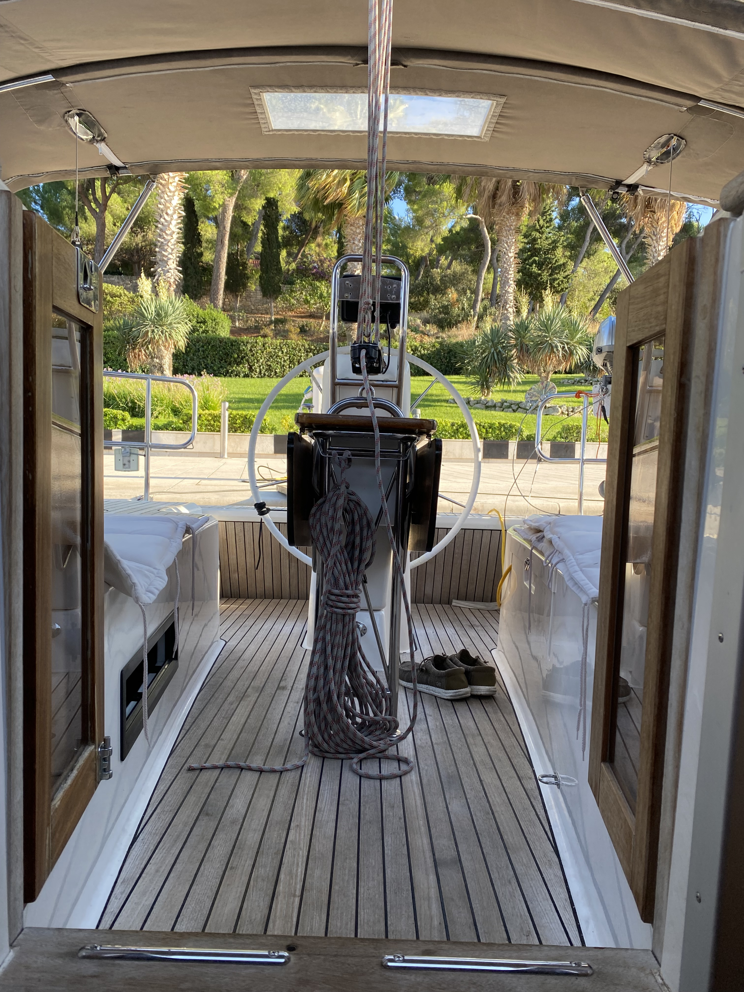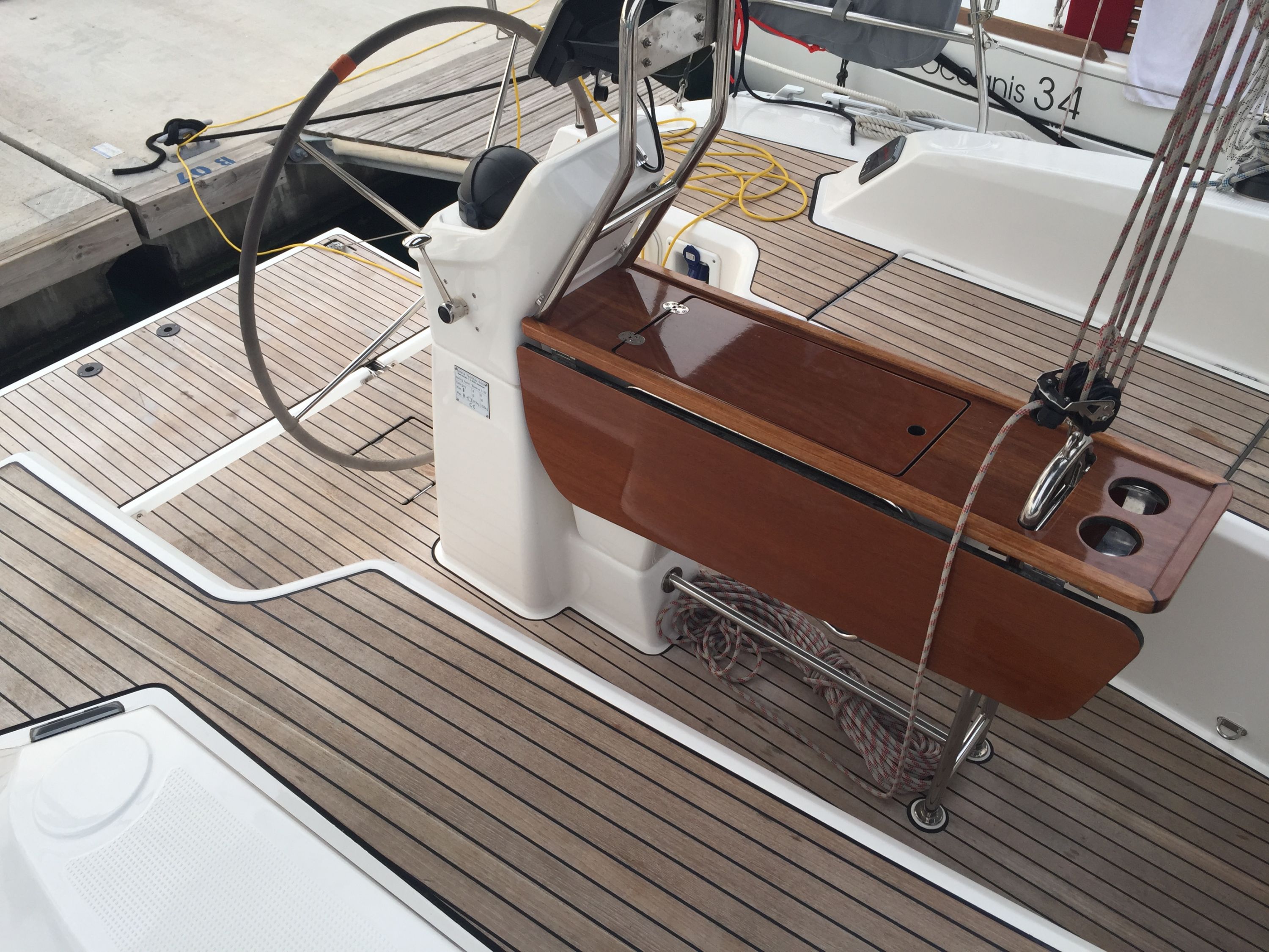 Outside 220 V-Landanschluss, Anker mit Kette, Badeplattform, Biminitop, Cockpitdusche, Cockpitlautsprecher, Cockpitpolster, Cockpittisch, elektr. Ankerwinsch, Fender, Gangway, Kugelfender, Sprayhood, Teak im Cockpit, Winschen