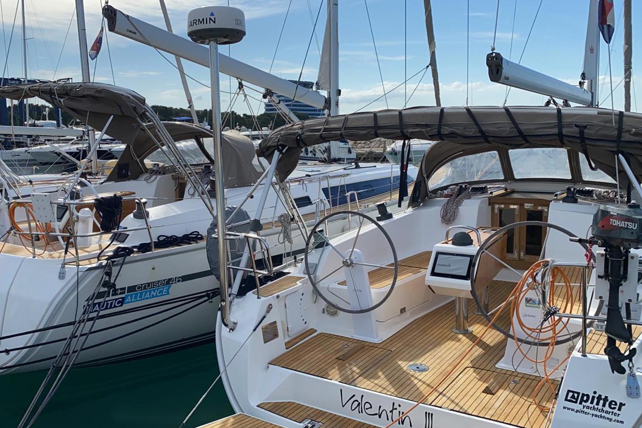 | Outside | 220 V-Landanschluss, Anker mit Kette, Ankerwinsch, Badeplattform, Biminitop, Bootshaken, Cockpitdusche, Cockpitlautsprecher, Cockpitpolster, Cockpittisch, Dieselkanister , elektr. Ankerwinsch, Fender, Festmacherleinen, Gangway, Kugelfender, Kunststoff-Eimer (Pütz), Sprayhood, Teak im Cockpit, Wantenschneider, Wasserkanister , Wasserschlauch, Windex |