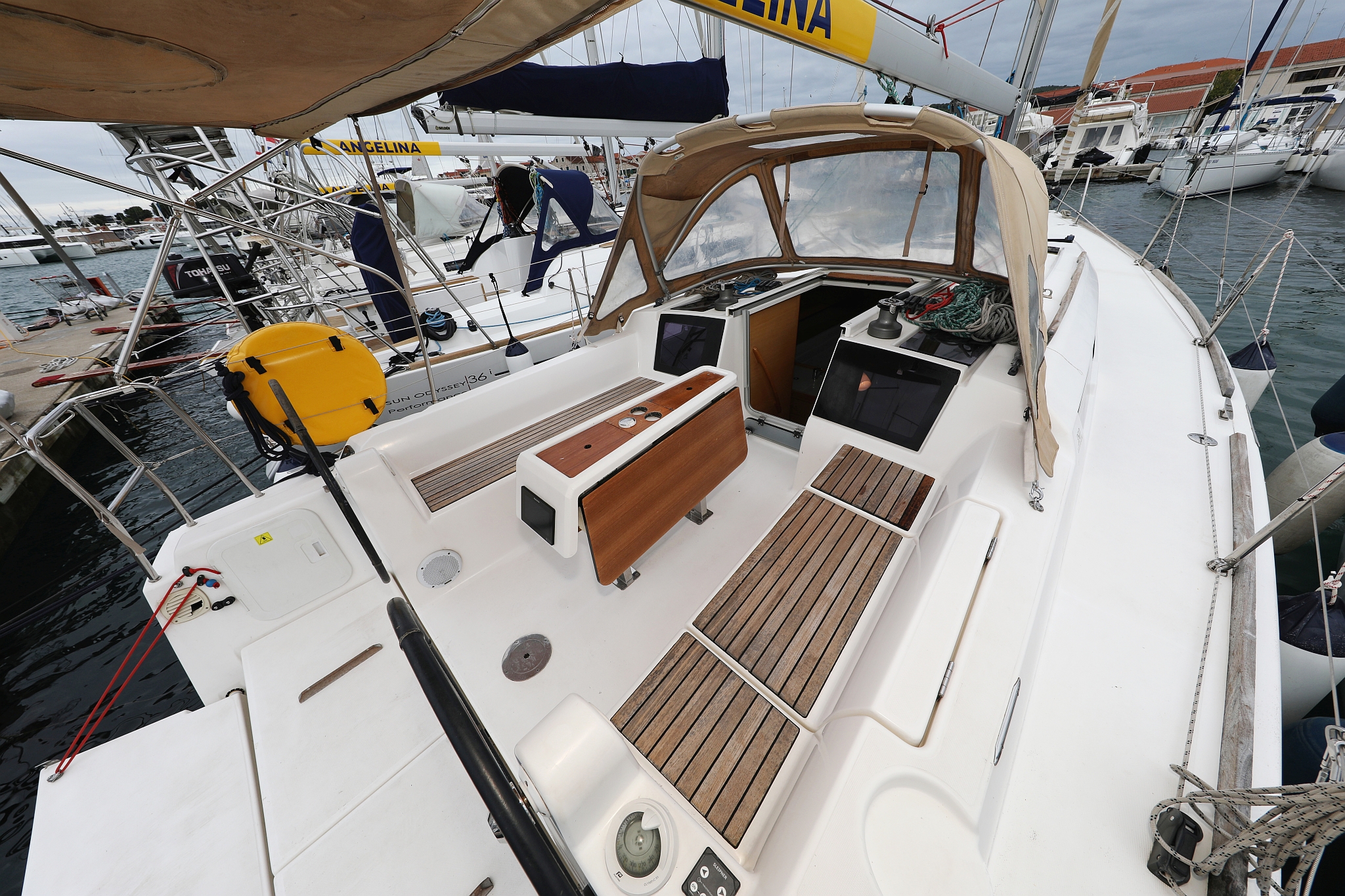 | Outside | 220 V-Landanschluss, Anker mit Kette, Badeplattform, Biminitop, Cockpitdusche, Cockpitlautsprecher, Cockpitpolster, Cockpittisch, elektr. Ankerwinsch, Fender, Gangway, Kugelfender, Sprayhood, Teak im Cockpit, Winschen |