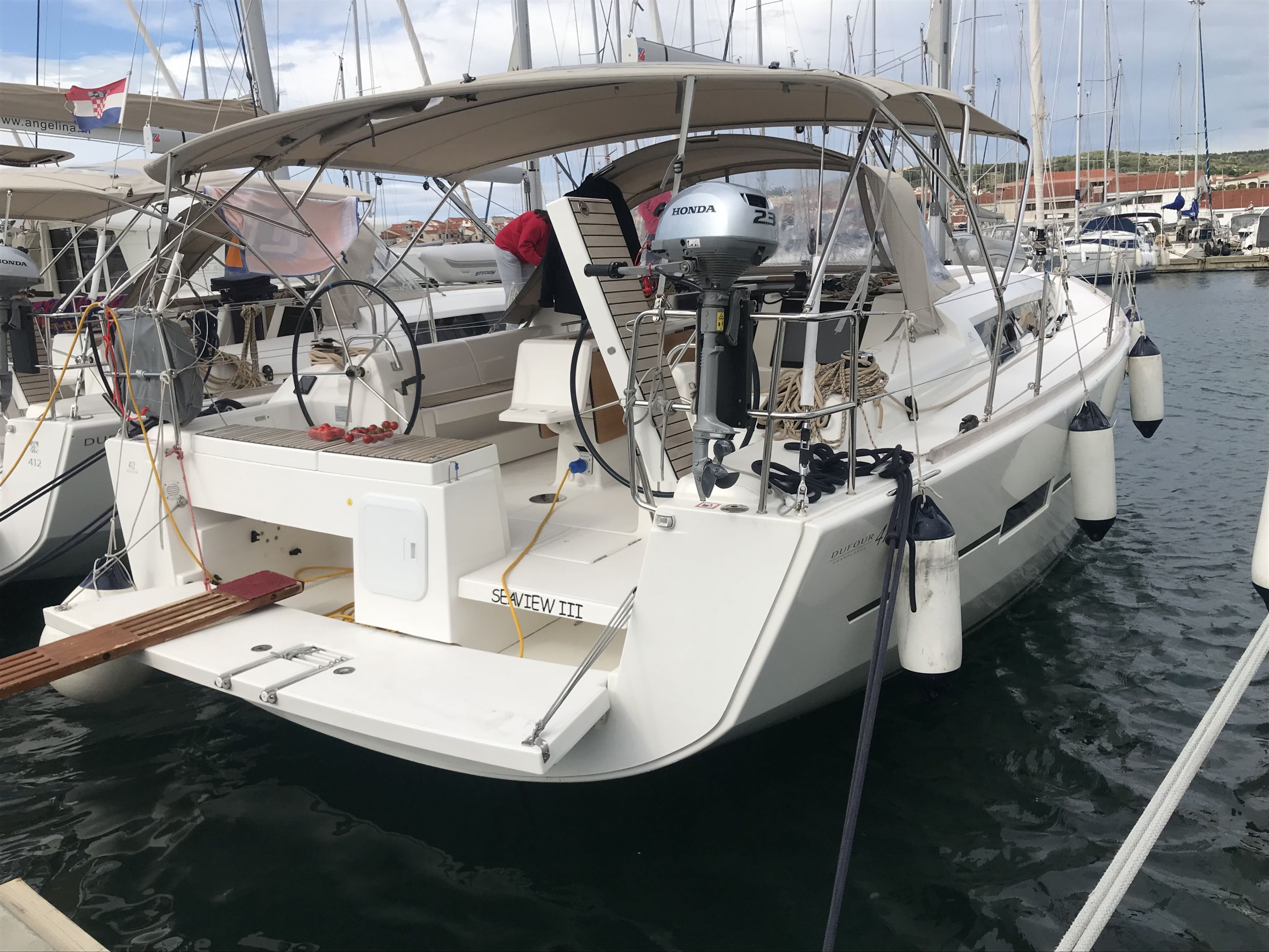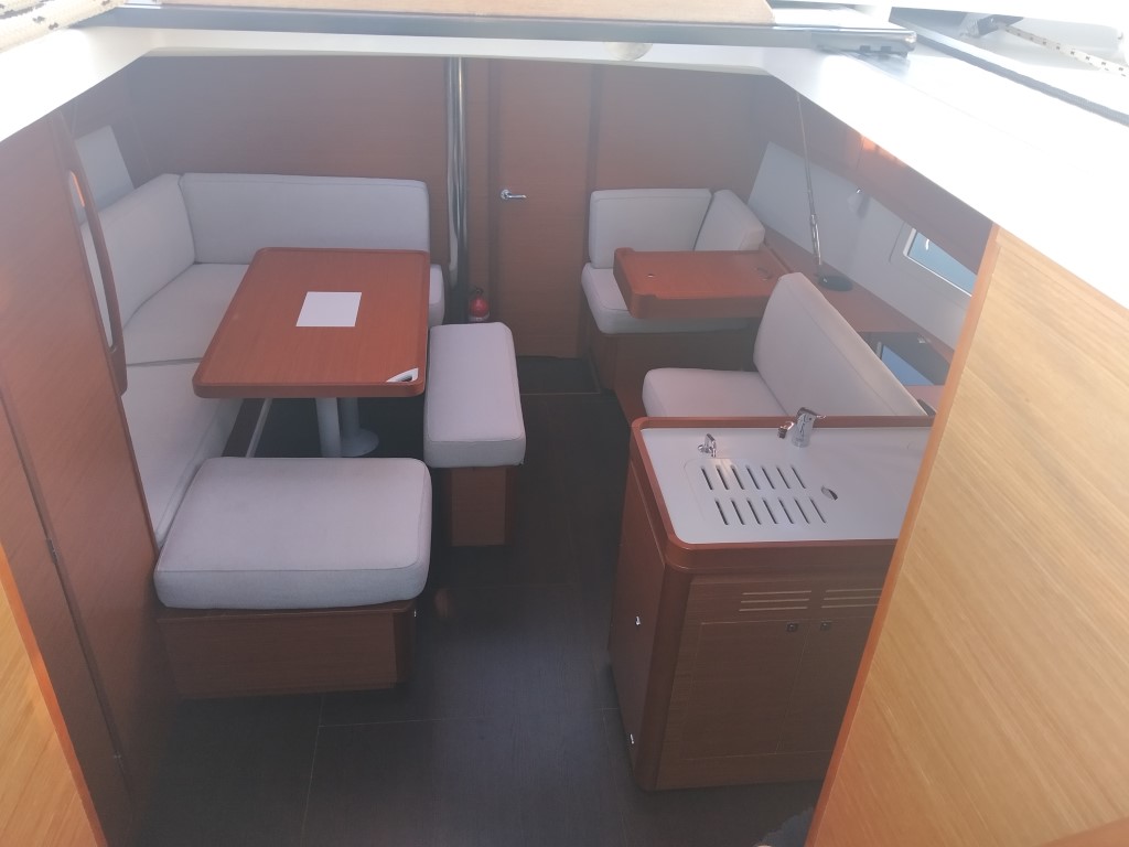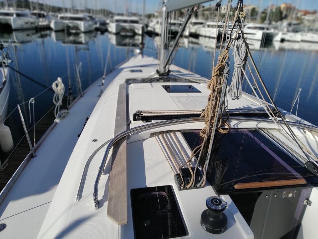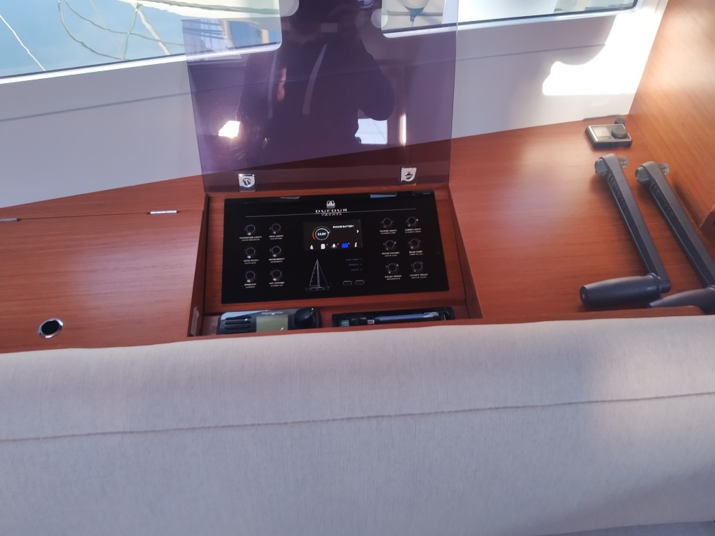 | Outside | 220 V-Landanschluss, Badeplattform, Biminitop, Bootshaken, Cockpitdusche, Cockpitlautsprecher, Cockpitpolster, Cockpittisch, Delta-Anker, elektr. Ankerwinsch, Fender, Festmacherleinen, Gangway, Grill, Sprayhood, Spülbecken im Cockpit, Teak im Cockpit, Wasserschlauch, Winschen |