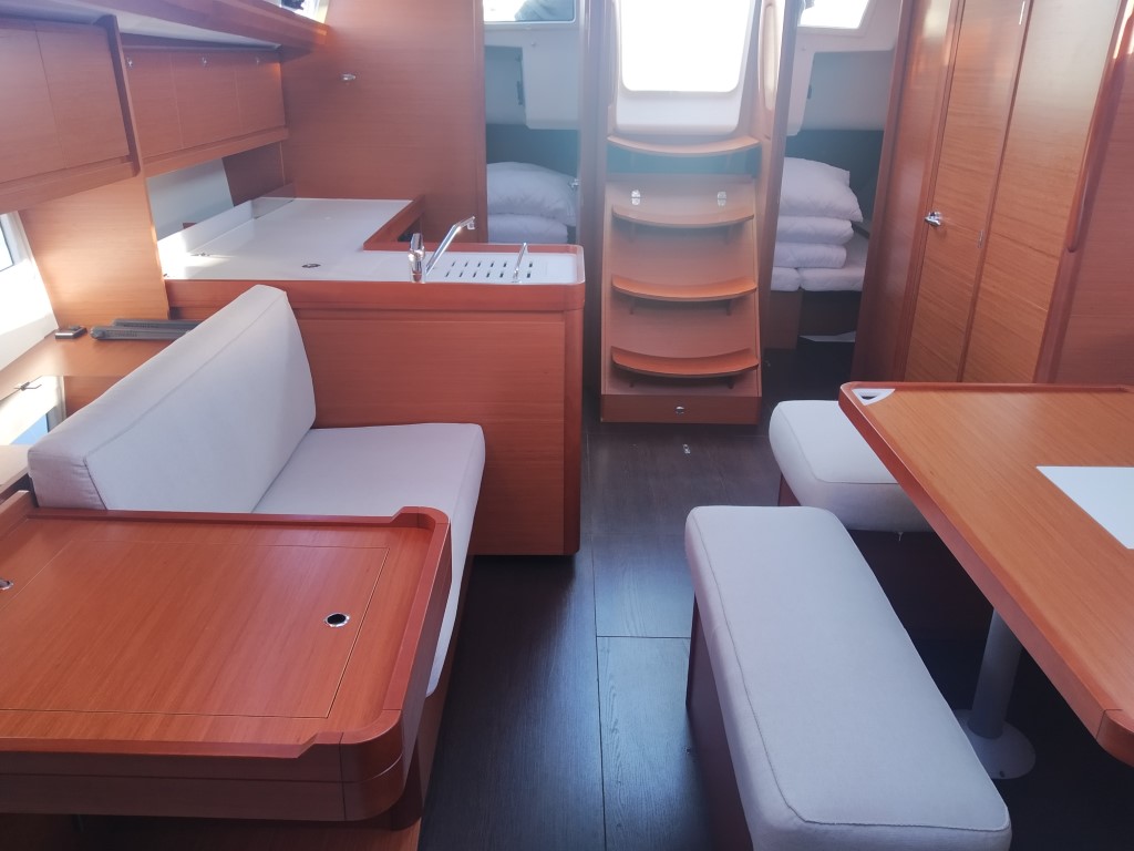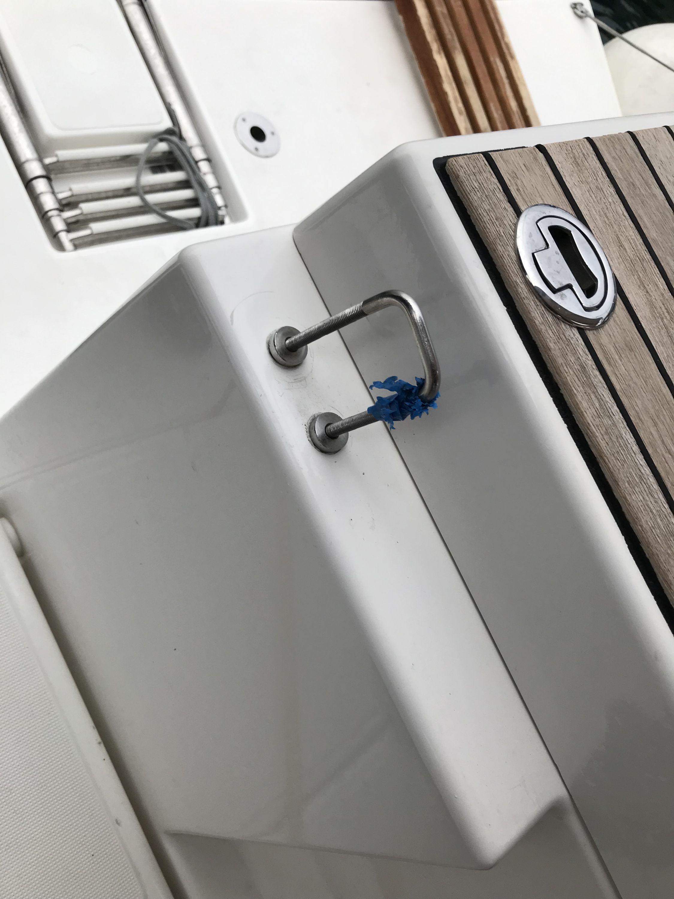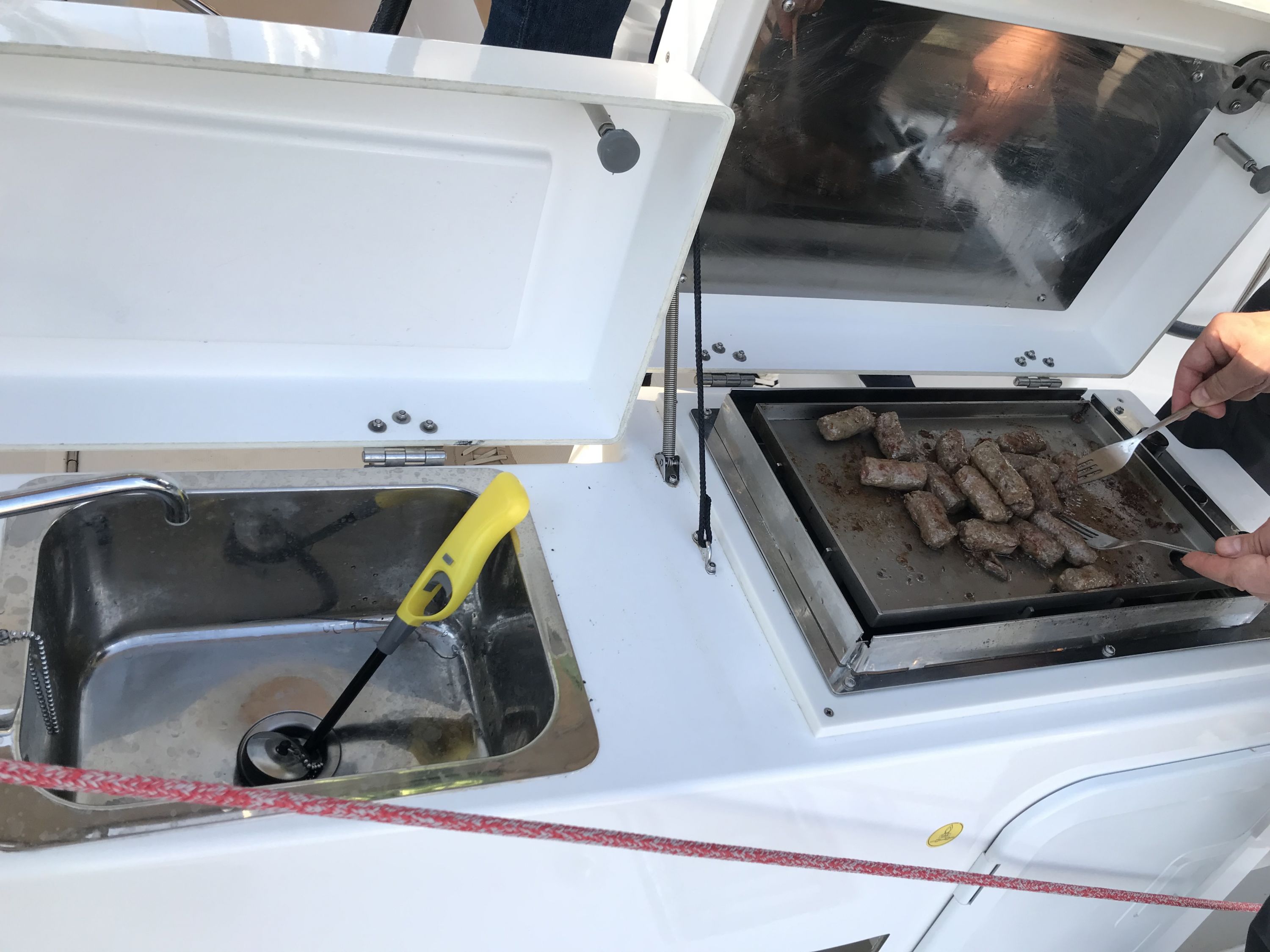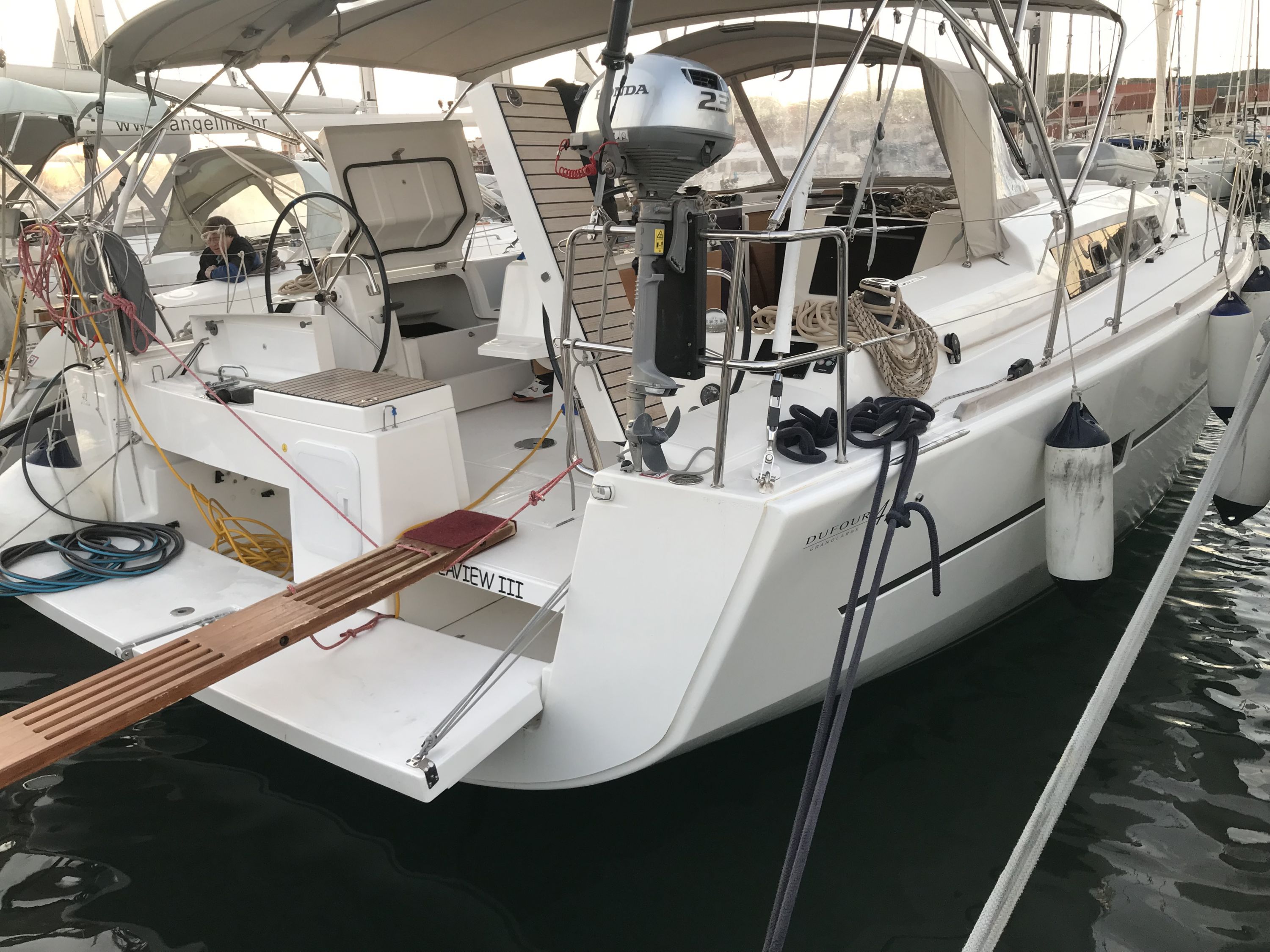 | Outside | 220 V-Landanschluss, Badeplattform, Biminitop, Bootshaken, Cockpitdusche, Cockpitlautsprecher, Cockpitpolster, Cockpittisch, Delta-Anker, elektr. Ankerwinsch, Fender, Festmacherleinen, Gangway, Grill, Sprayhood, Spülbecken im Cockpit, Teak im Cockpit, Wasserschlauch, Winschen |