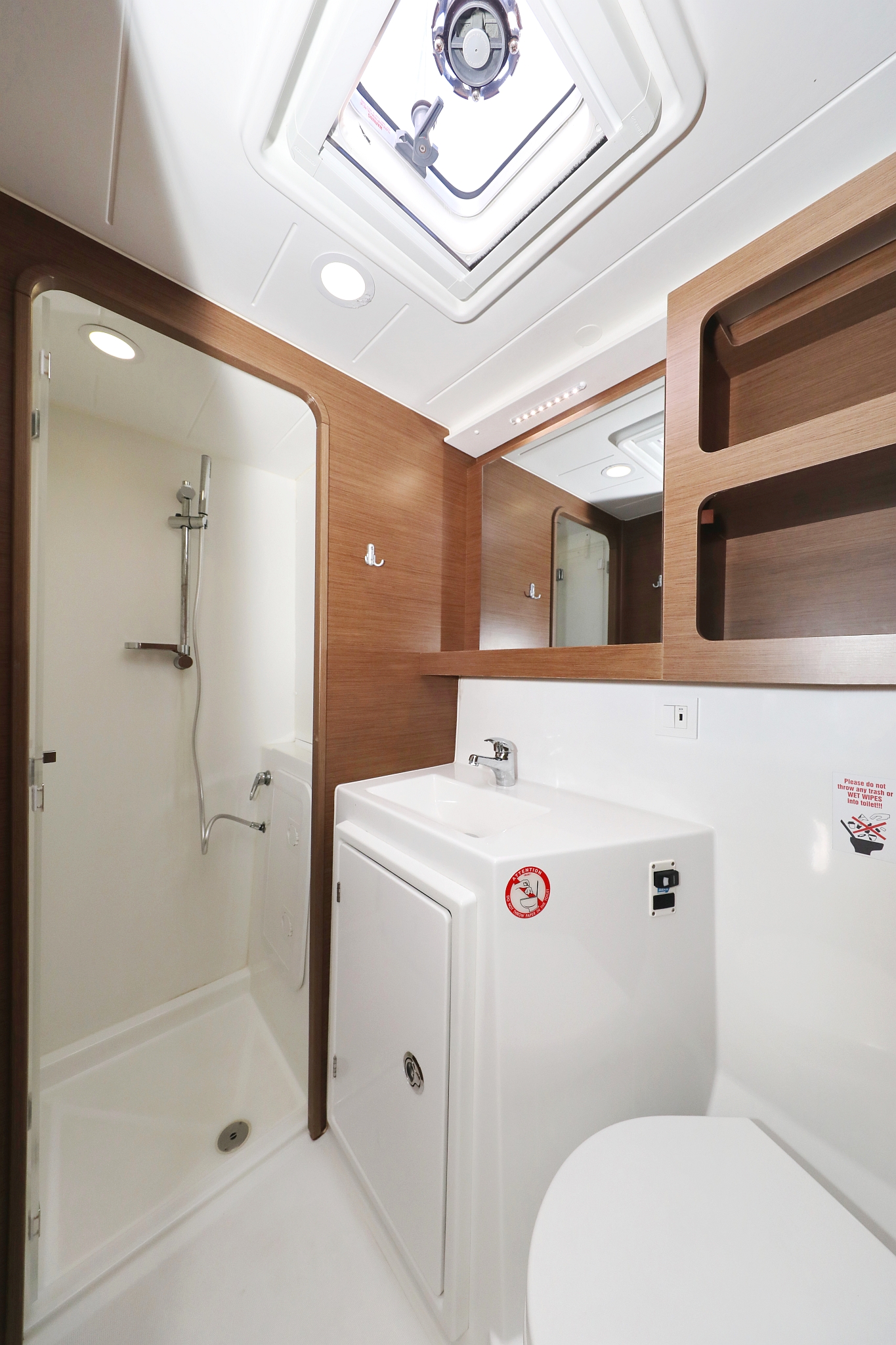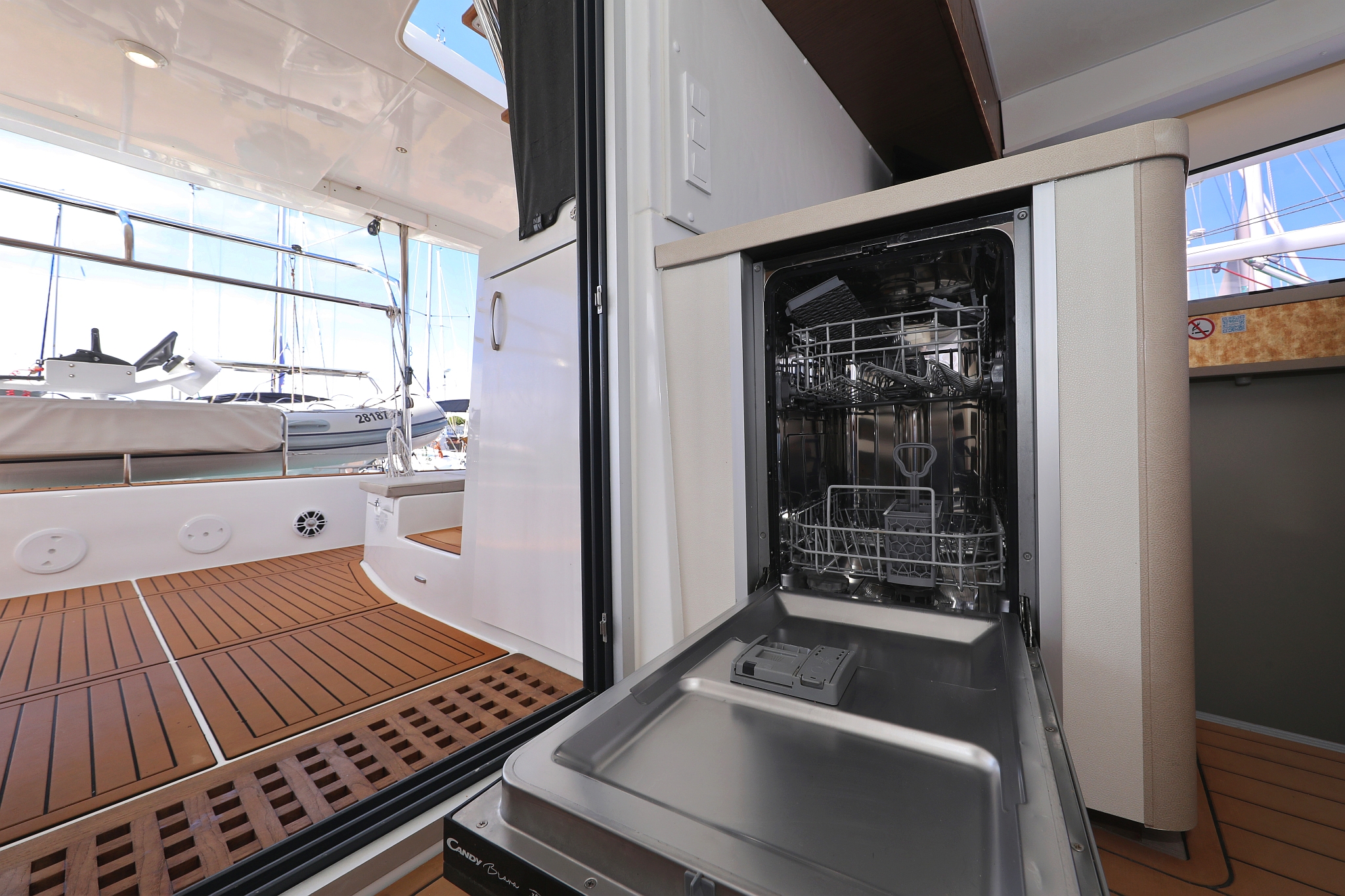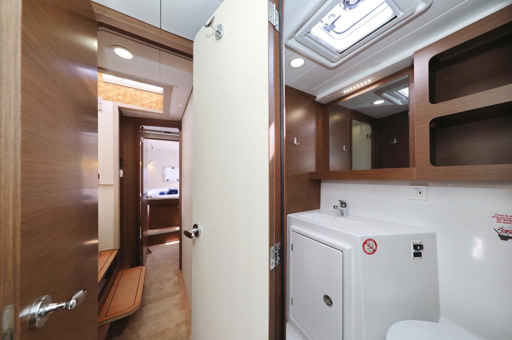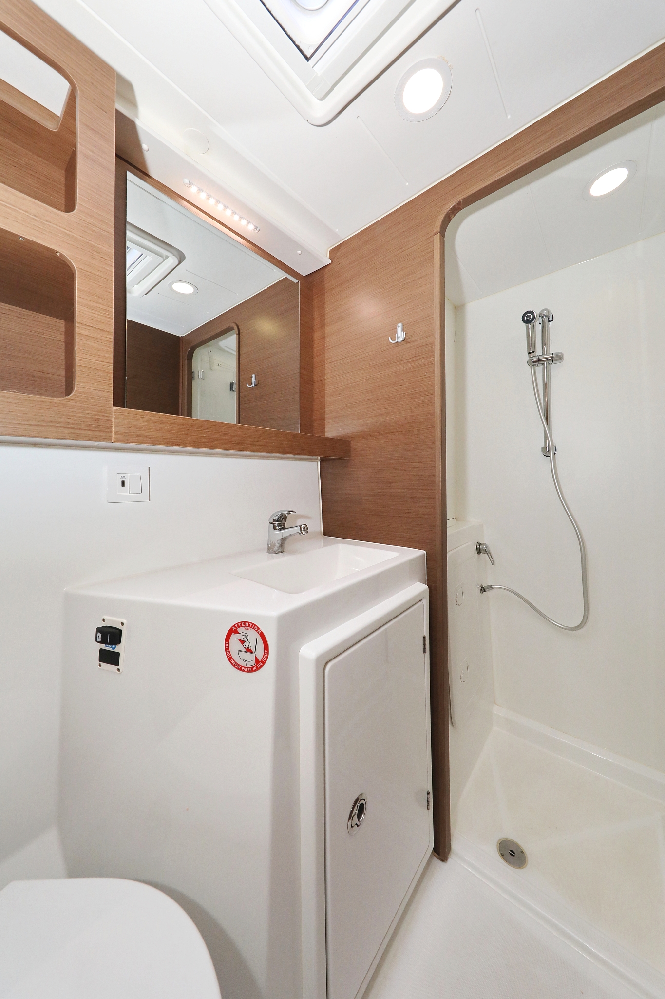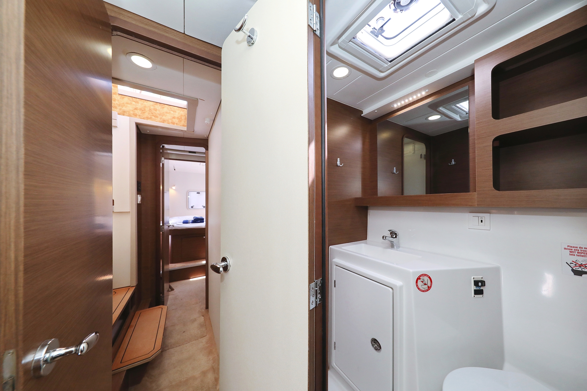 220V Steckdosen, Backofen, Eiswürfelmaschine, Fäkalientank, Generator, Geschirrspüler, Heizung, Inverter 12V/220V, Klimaanlage (ohne Landstrombedarf), Kühlschrank, Landstromkabel, Mokkakanne, Pantryausstattung, Radio mit USB, Bluetooth und AUX-In, Smart-TV, Spülbecken, USB Steckdose, Ventilatoren in Salon und Kabinen, Wasserkocher, Watermaker, WC (elektr.) |