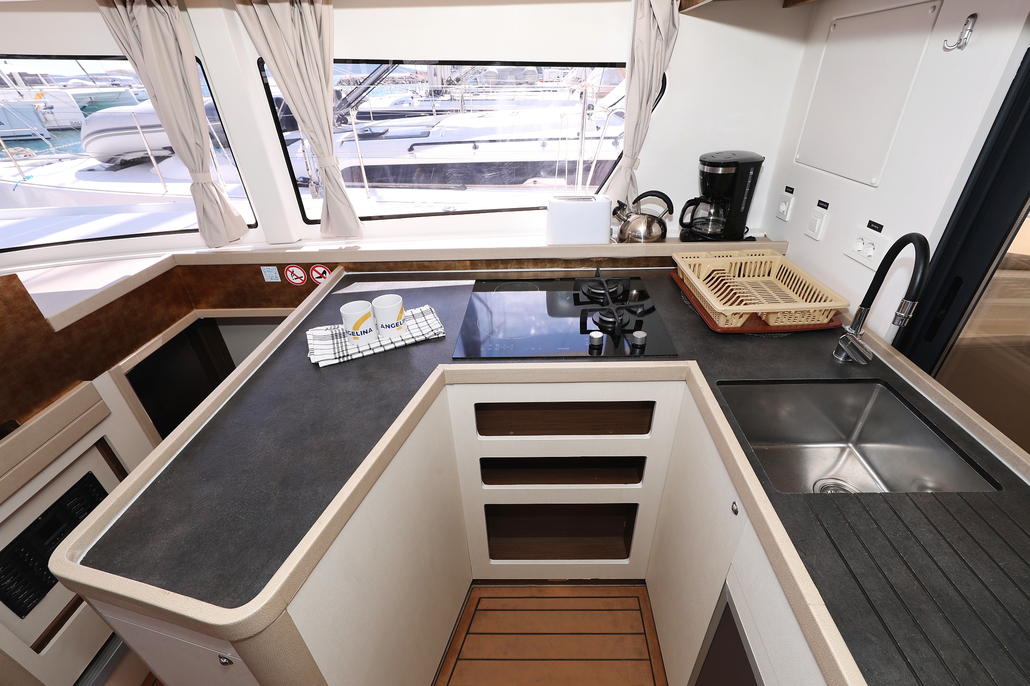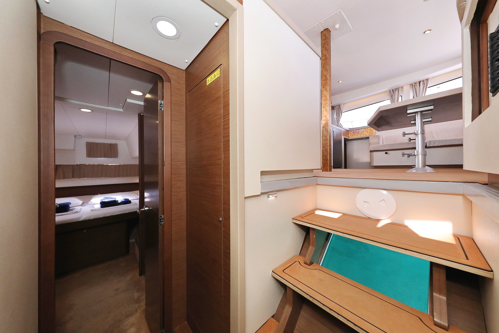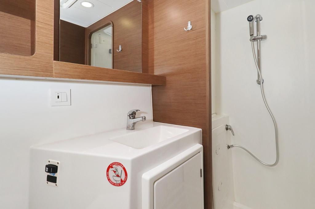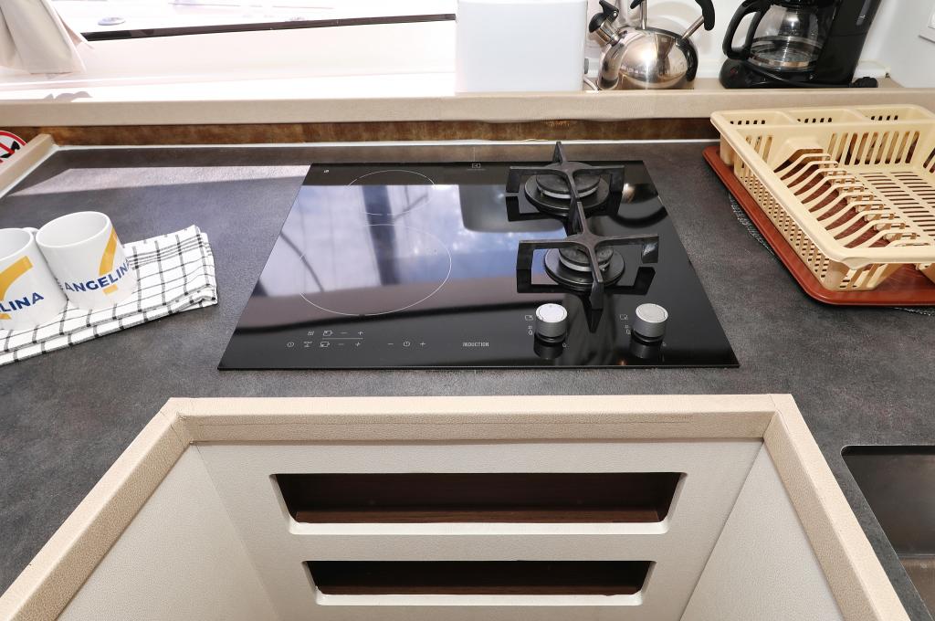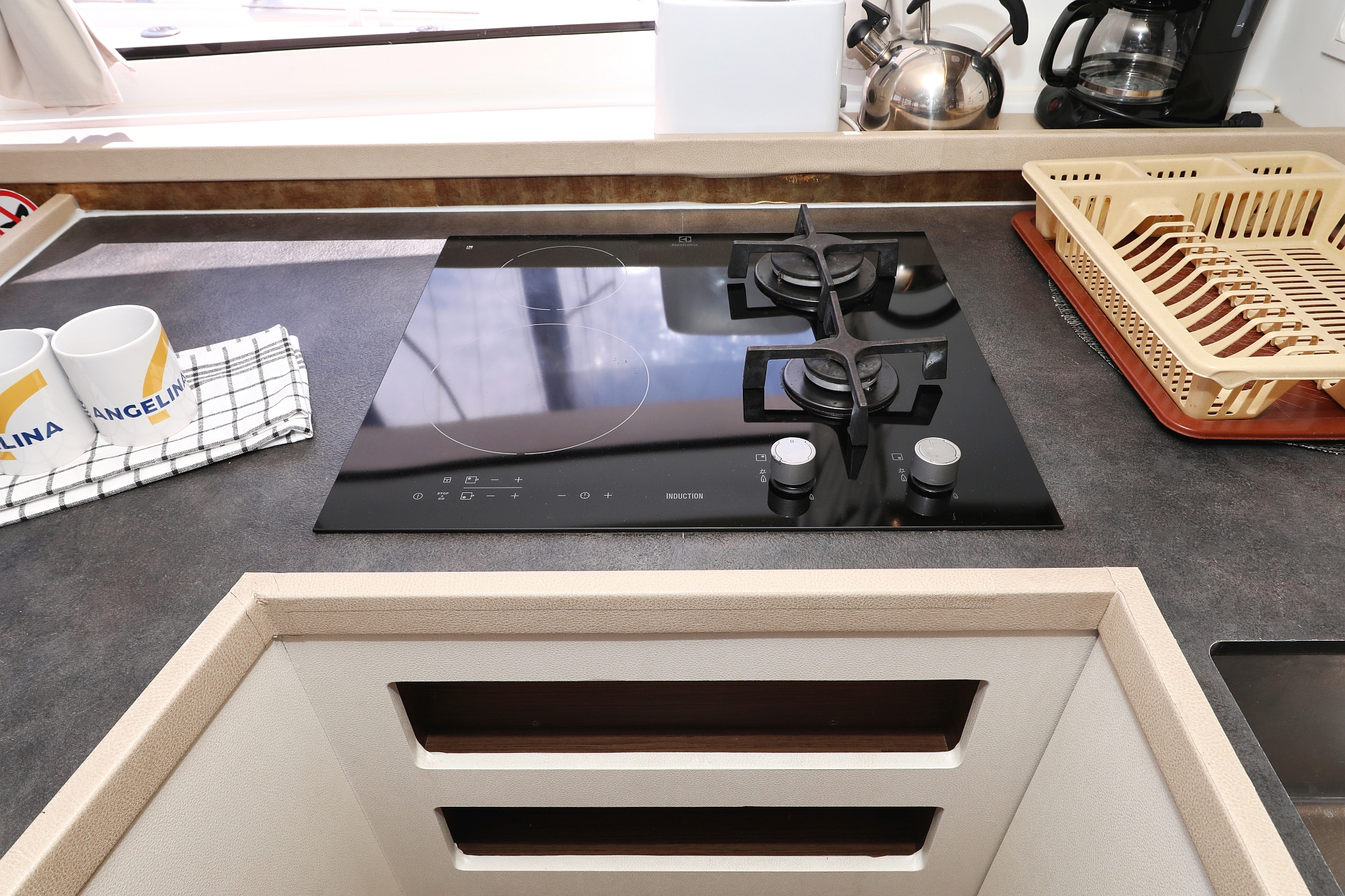 220V Steckdosen, Backofen, Eiswürfelmaschine, Fäkalientank, Generator, Geschirrspüler, Heizung, Inverter 12V/220V, Klimaanlage (ohne Landstrombedarf), Kühlschrank, Landstromkabel, Mokkakanne, Pantryausstattung, Radio mit USB, Bluetooth und AUX-In, Smart-TV, Spülbecken, USB Steckdose, Ventilatoren in Salon und Kabinen, Wasserkocher, Watermaker, WC (elektr.) |