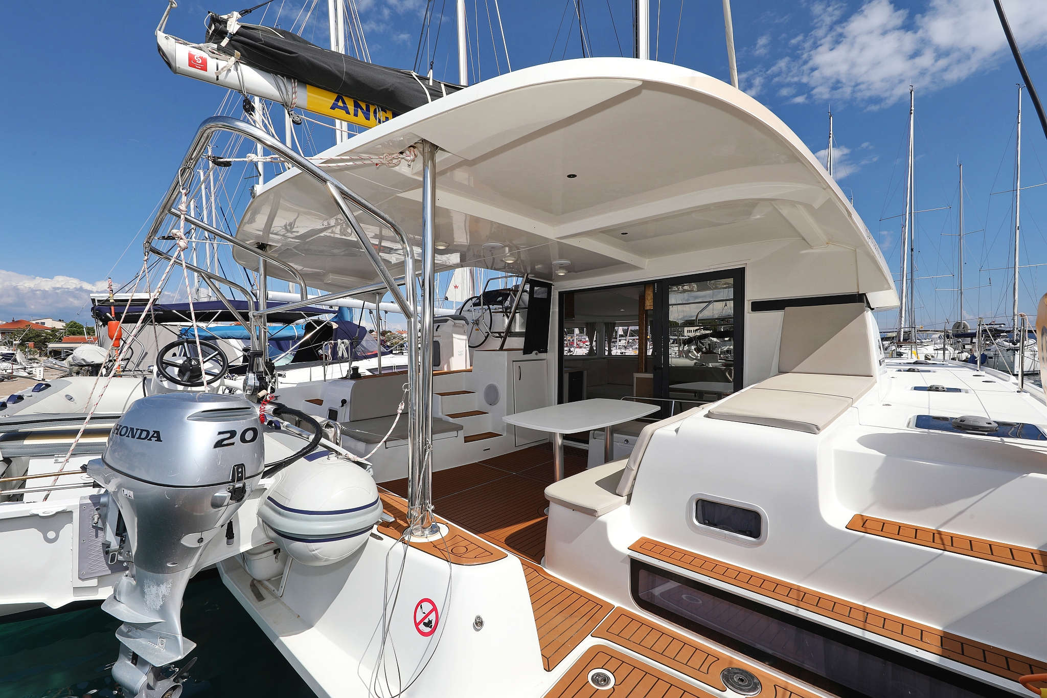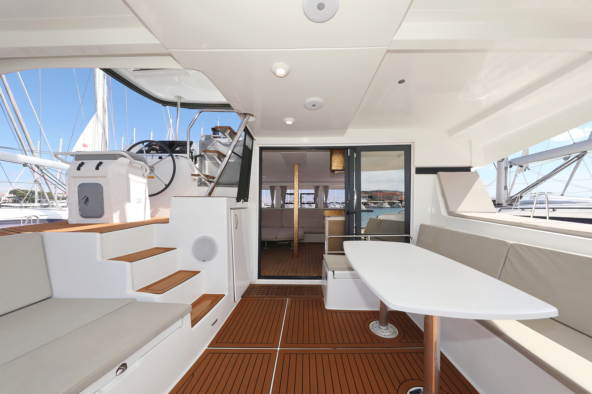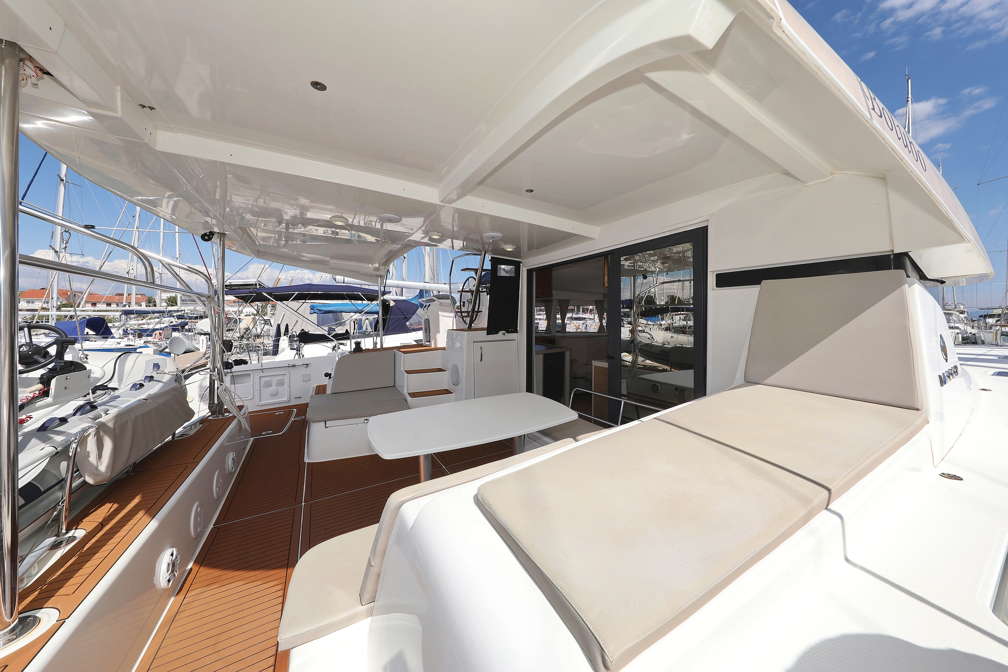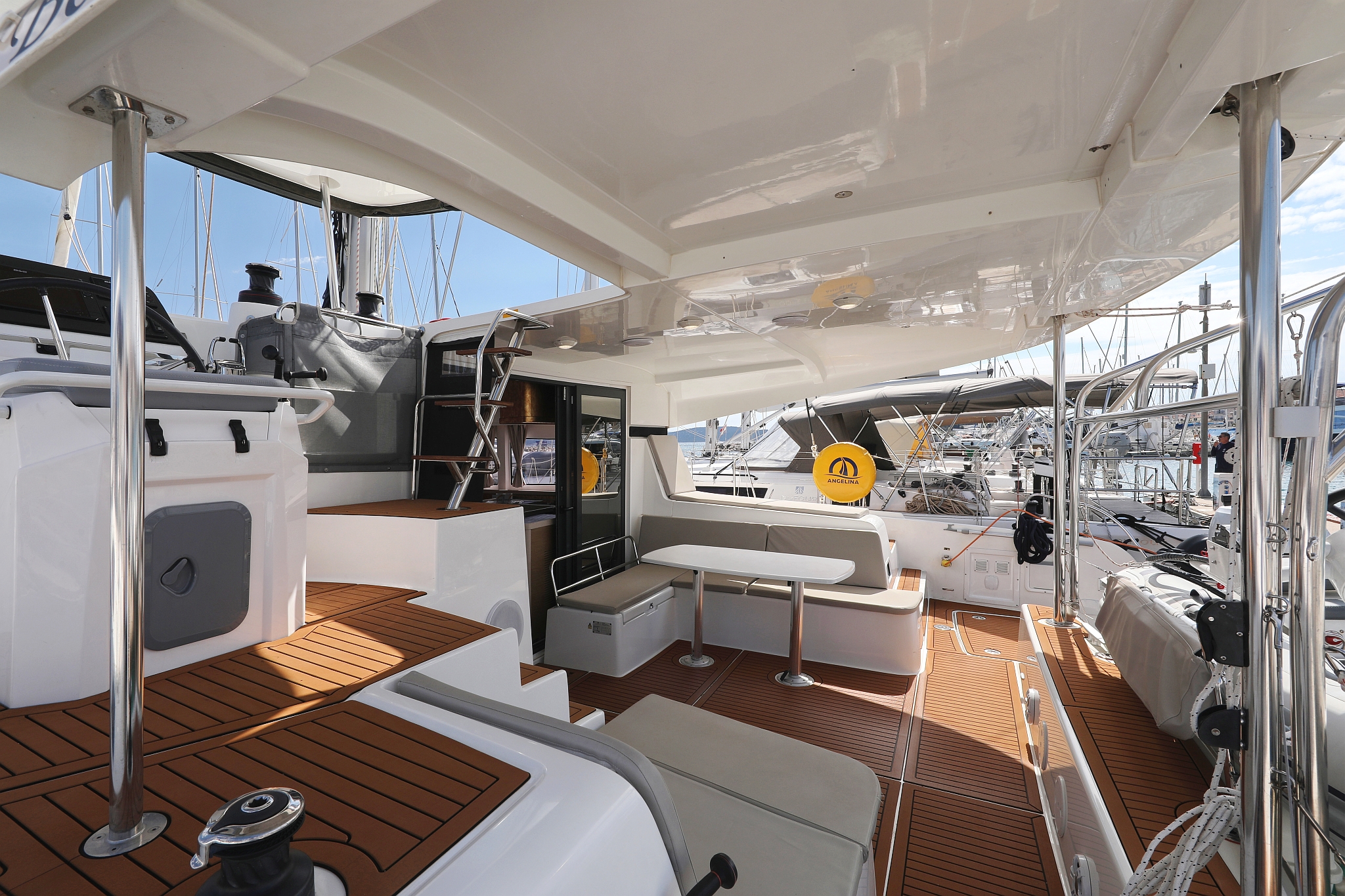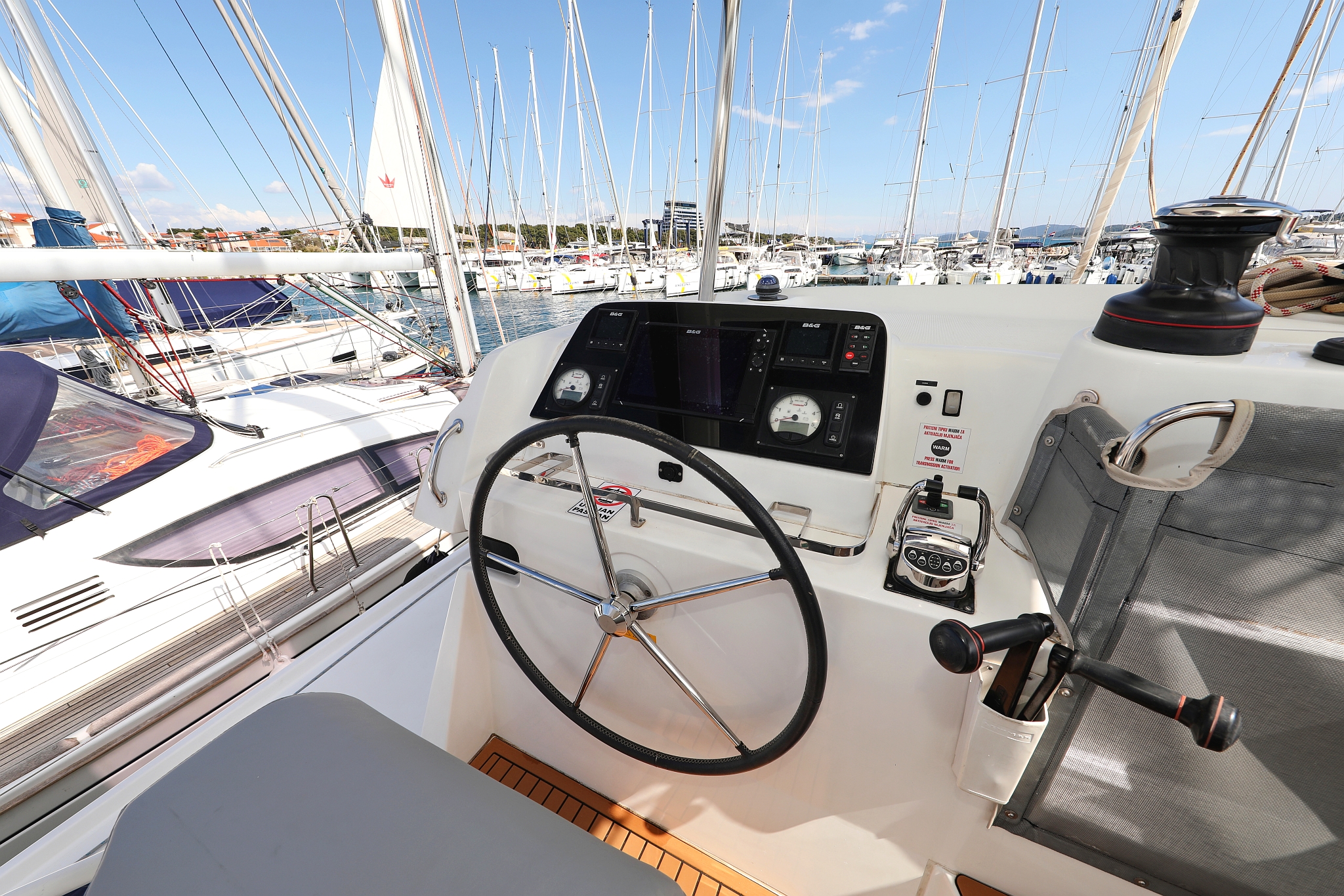 Anker mit Kette, Bootshaken, Cockpitdusche, Cockpitkühlschrank, Cockpitlautsprecher, Cockpitpolster, Cockpittisch, elektr. Ankerwinsch, elektr. Winsch, Fender, Festmacherleinen, Gangway, Grill, Hardtop, Solaranlage, Sonnendeck, Teak im Cockpit, Unterwasserbeleuchtung, Wasserschlauch, Windex, Winschen |