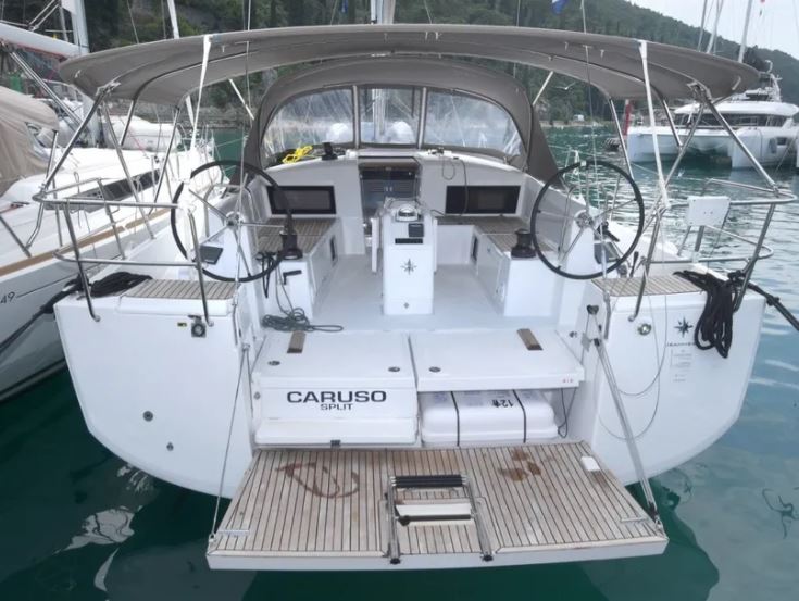 | Outside | 220 V-Landanschluss, Anker mit Kette, Badeplattform, Biminitop, Bootshaken, Cockpitdusche, Cockpitlautsprecher, Cockpitpolster, Cockpittisch, elektr. Ankerwinsch, Fender, Festmacherleinen, Gangway, Sprayhood, Teak im Cockpit, Wasserschlauch, Winschen |