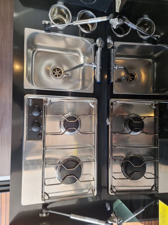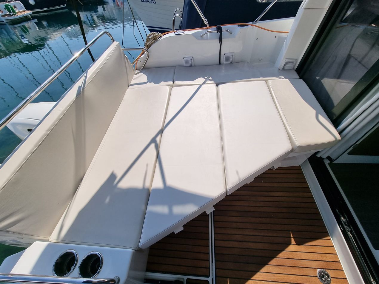 | Outside | Anker mit Kette, Badeleiter, Biminitop, Cockpitdusche, Cockpitlautsprecher, Cockpitpolster, Cockpittisch, Deckpolster, elektr. Ankerwinsch, Festmacherleinen |