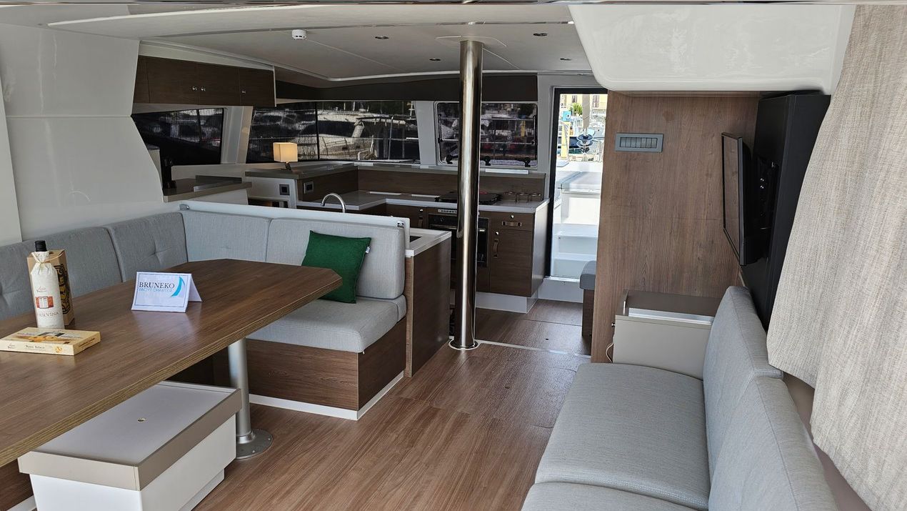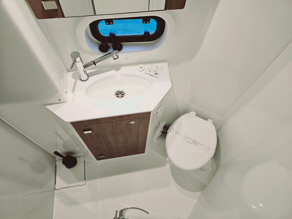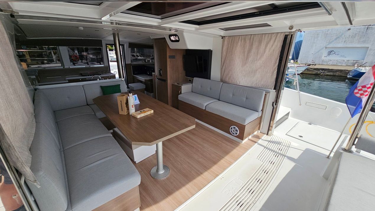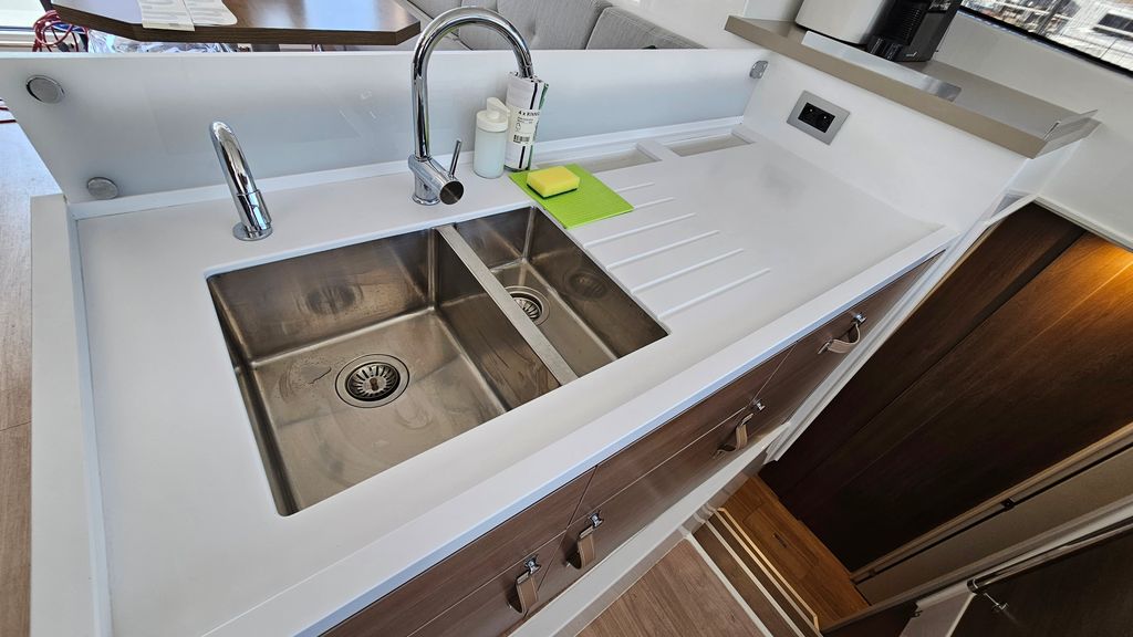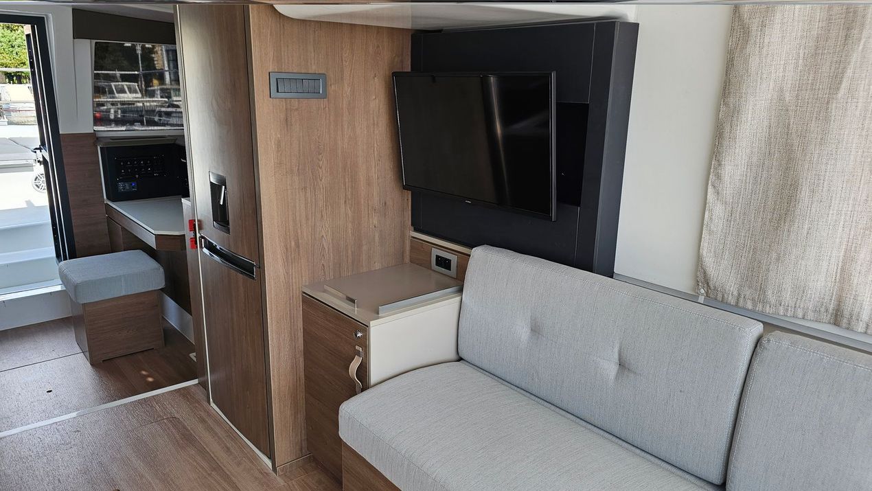 | Outside | Anker mit Kette, Badeleiter, Badeplattform, Biminitop, Cockpitdusche, Cockpitlautsprecher, Cockpitpolster, Cockpittisch, Deckpolster, elektr. Ankerwinsch, Fender, Festmacherleinen, Flybridge, Gangway, Grill, Solaranlage, Sprayhood, Wasserschlauch |