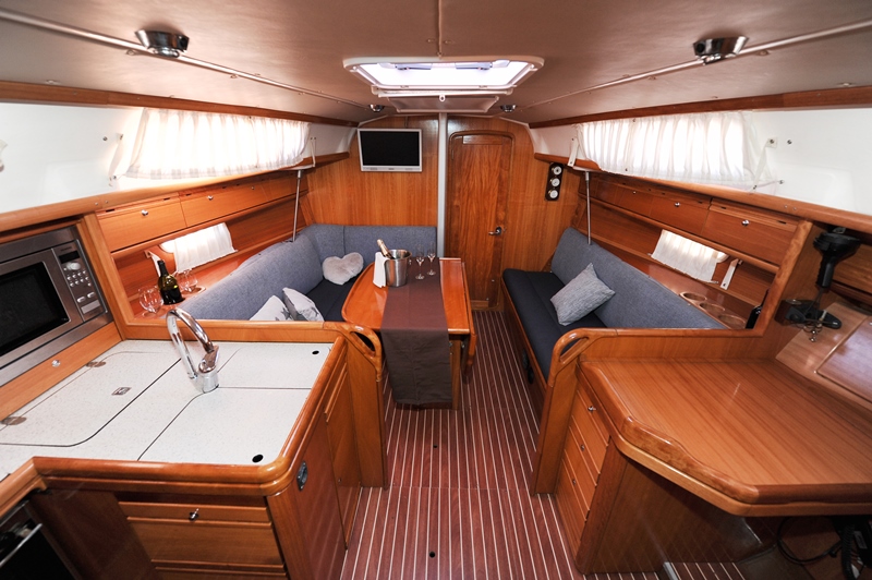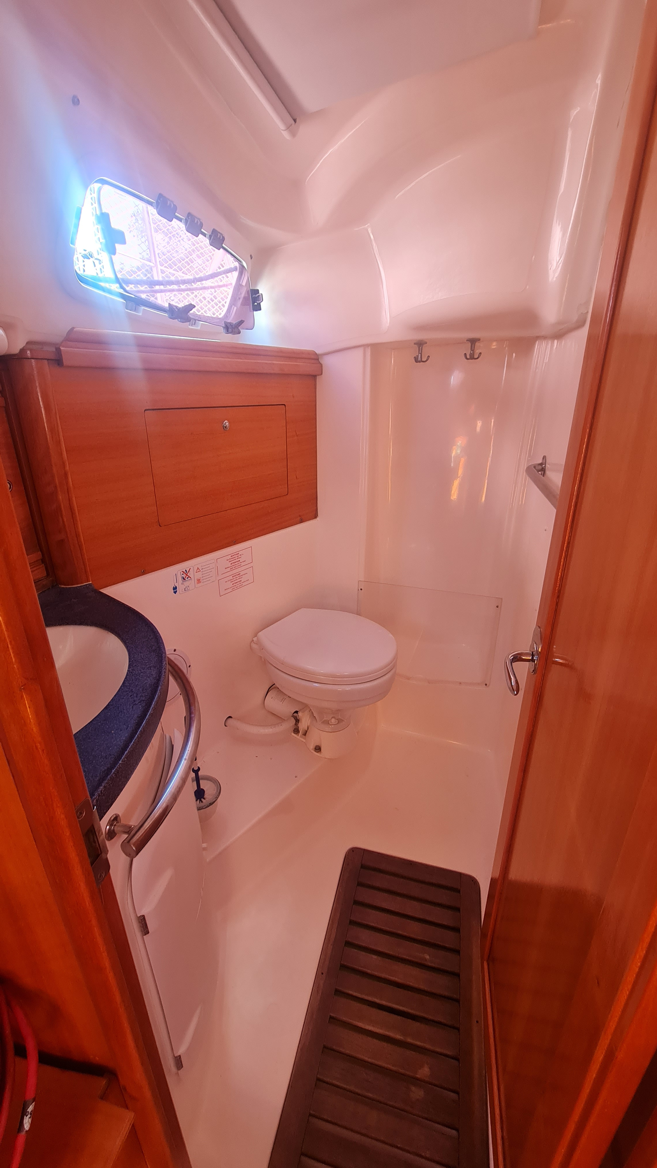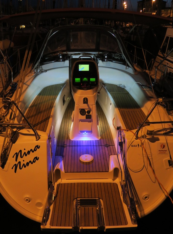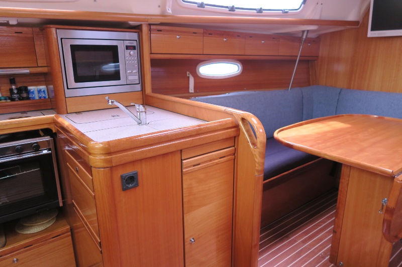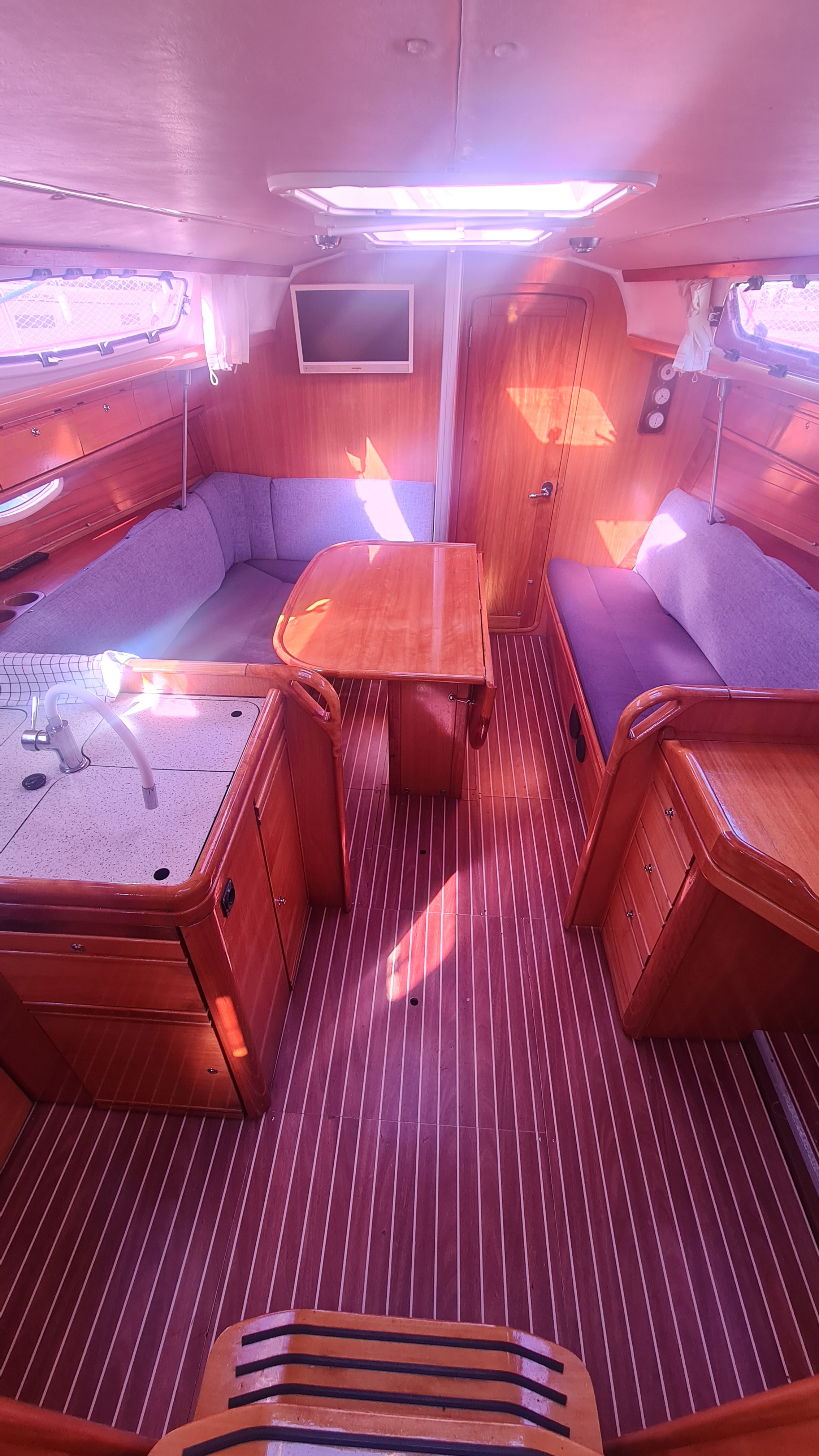 | Outside | Anker mit Kette, Badeleiter, Badeplattform, Biminitop, Cockpitdusche, Cockpitlautsprecher, Cockpittisch, elektr. Ankerwinsch, Festmacherleinen, Gangway, Solaranlage, Sprayhood, Windex |