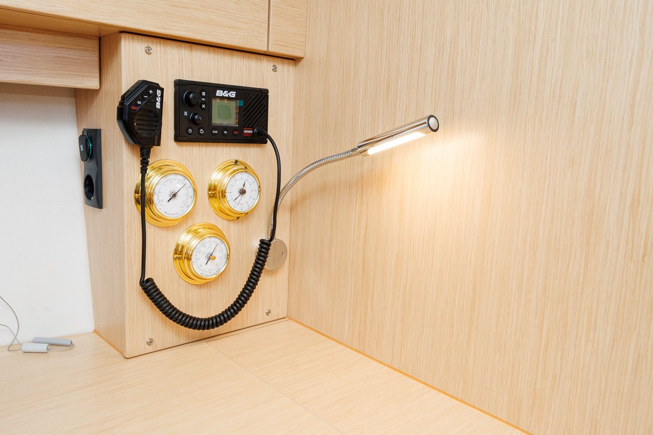 | Navigation | Barometer, Fernglas, GPS mit Kartenplotter im Cockpit, Hafenhandbücher, Handpeilkompass, Seekarten, Tridata (Log, Echolot, Windm.), Windmesser |