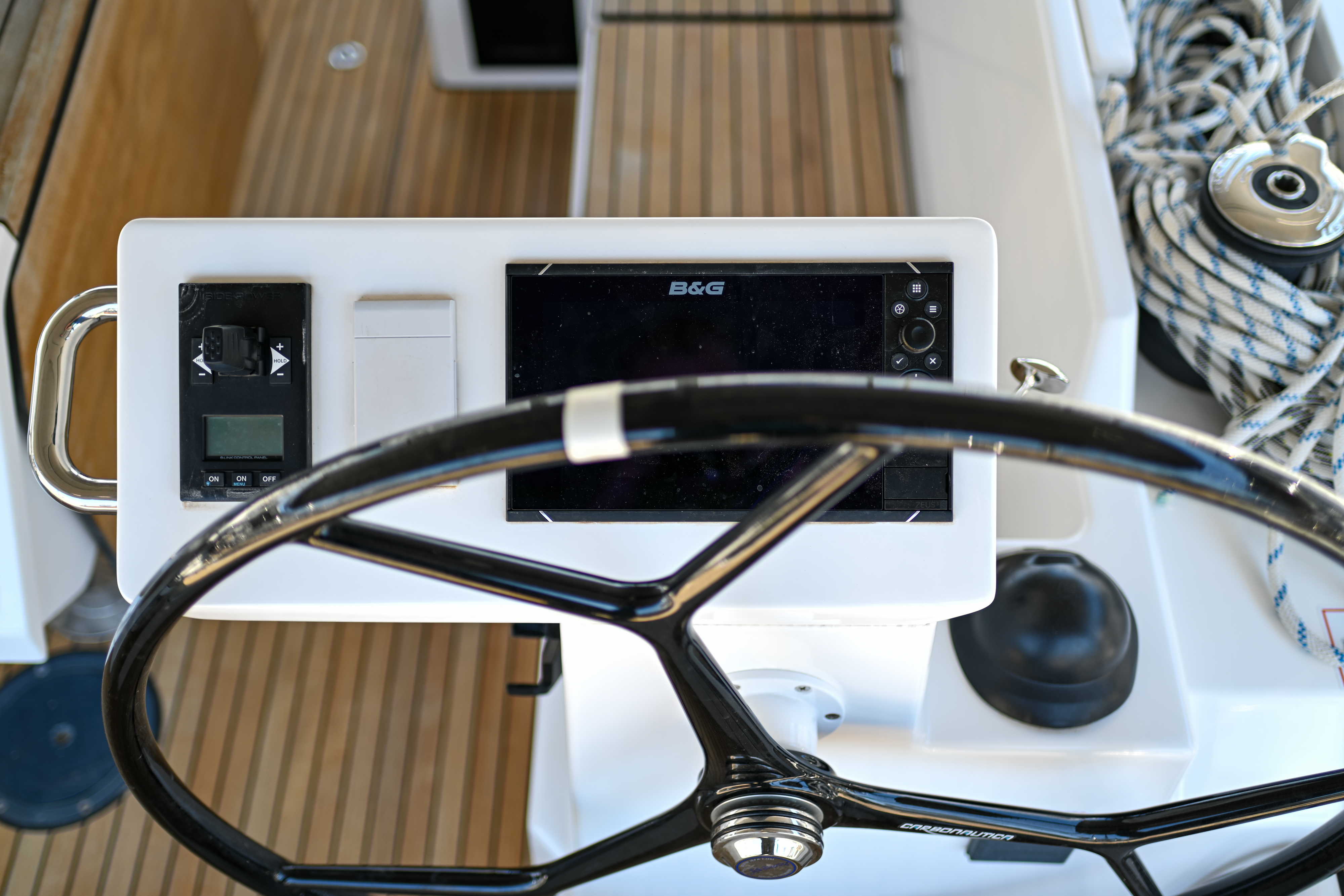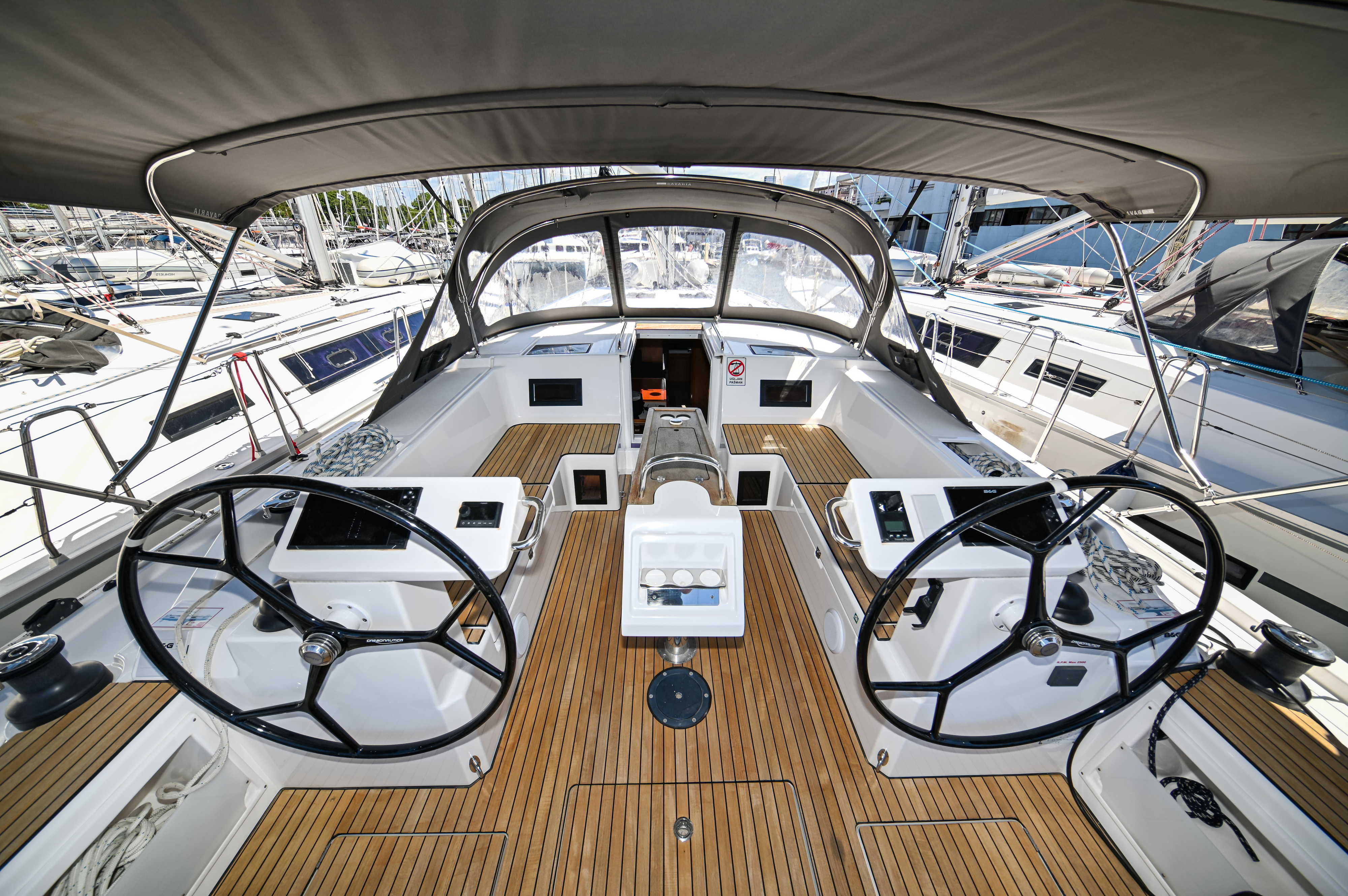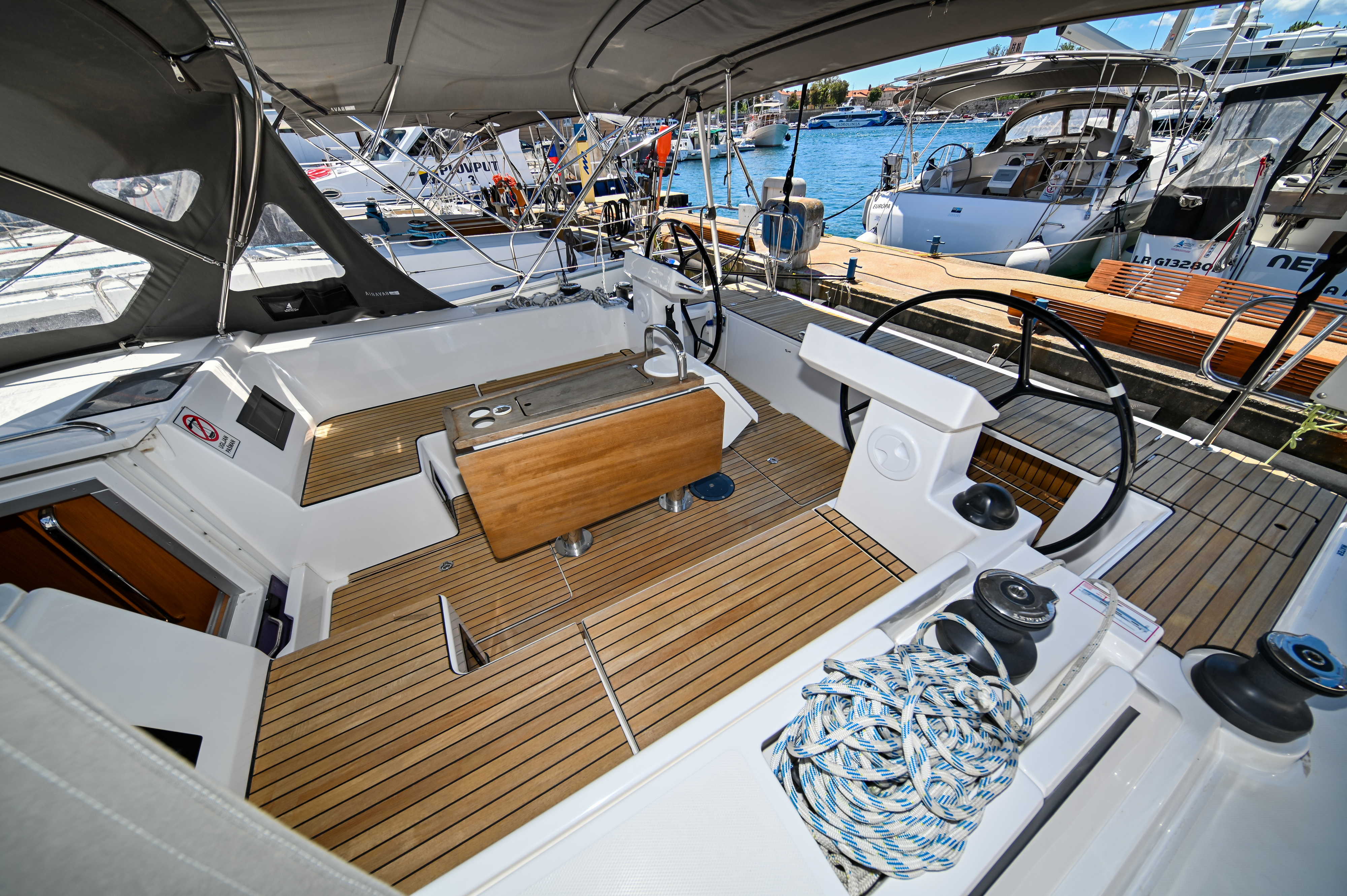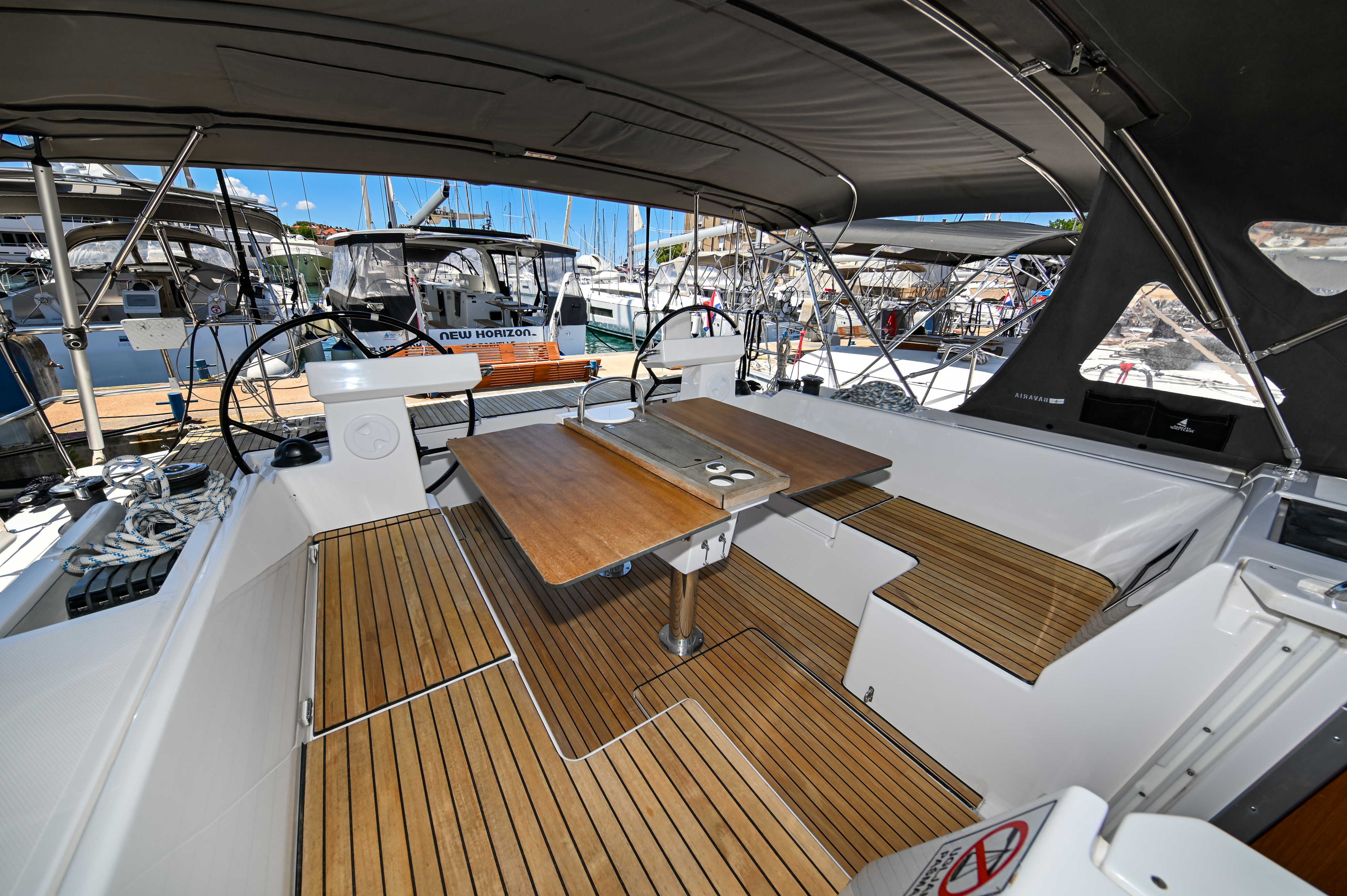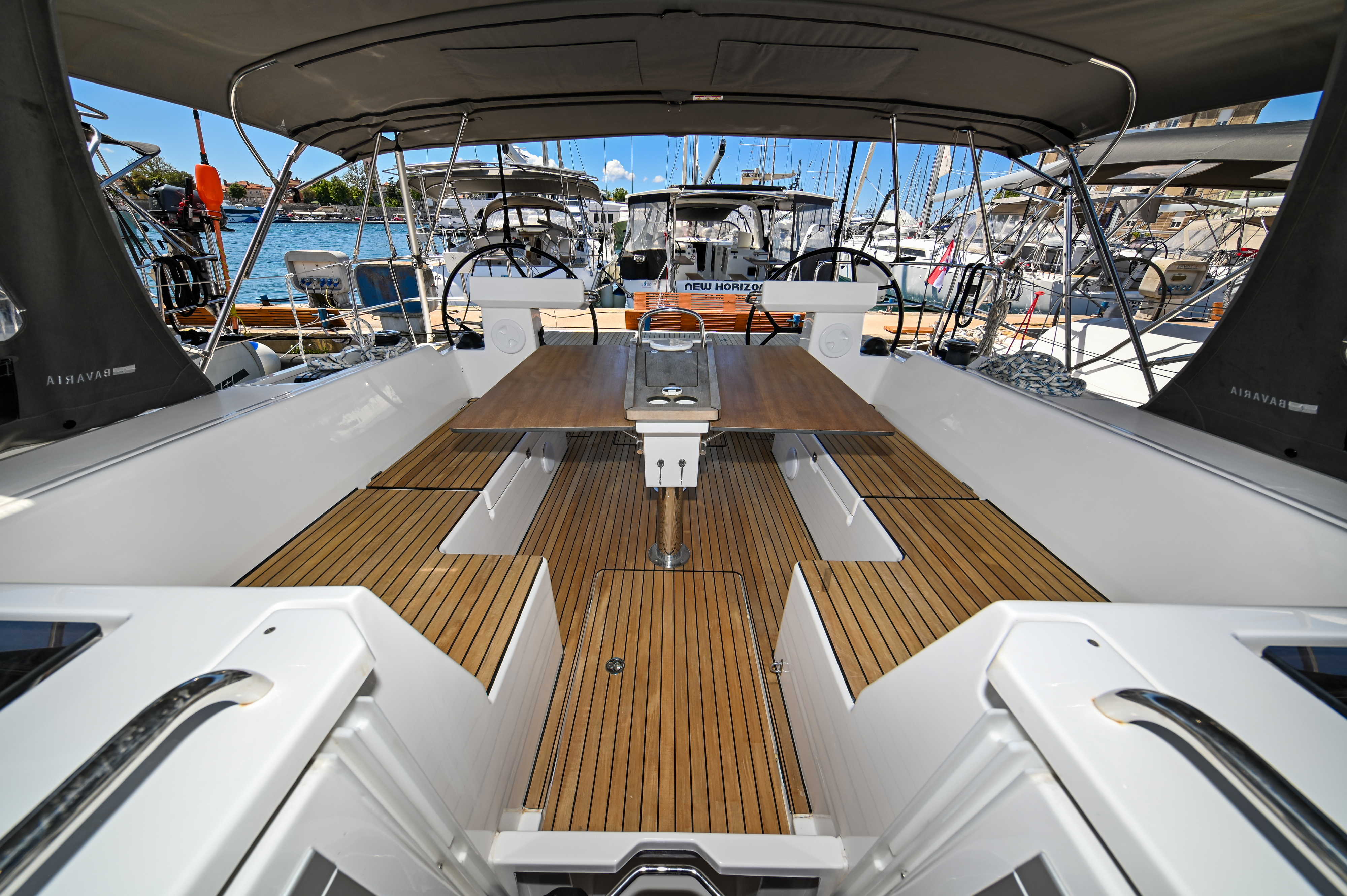 | Outside | Badeplattform, Biminitop, Bootshaken, Cockpitdusche, Cockpitlautsprecher, Cockpitpolster, Cockpittisch, elektr. Ankerwinsch, Fender, Festmacherleinen, Seereling, Solaranlage, Sprayhood, Teak im Cockpit, Windex |