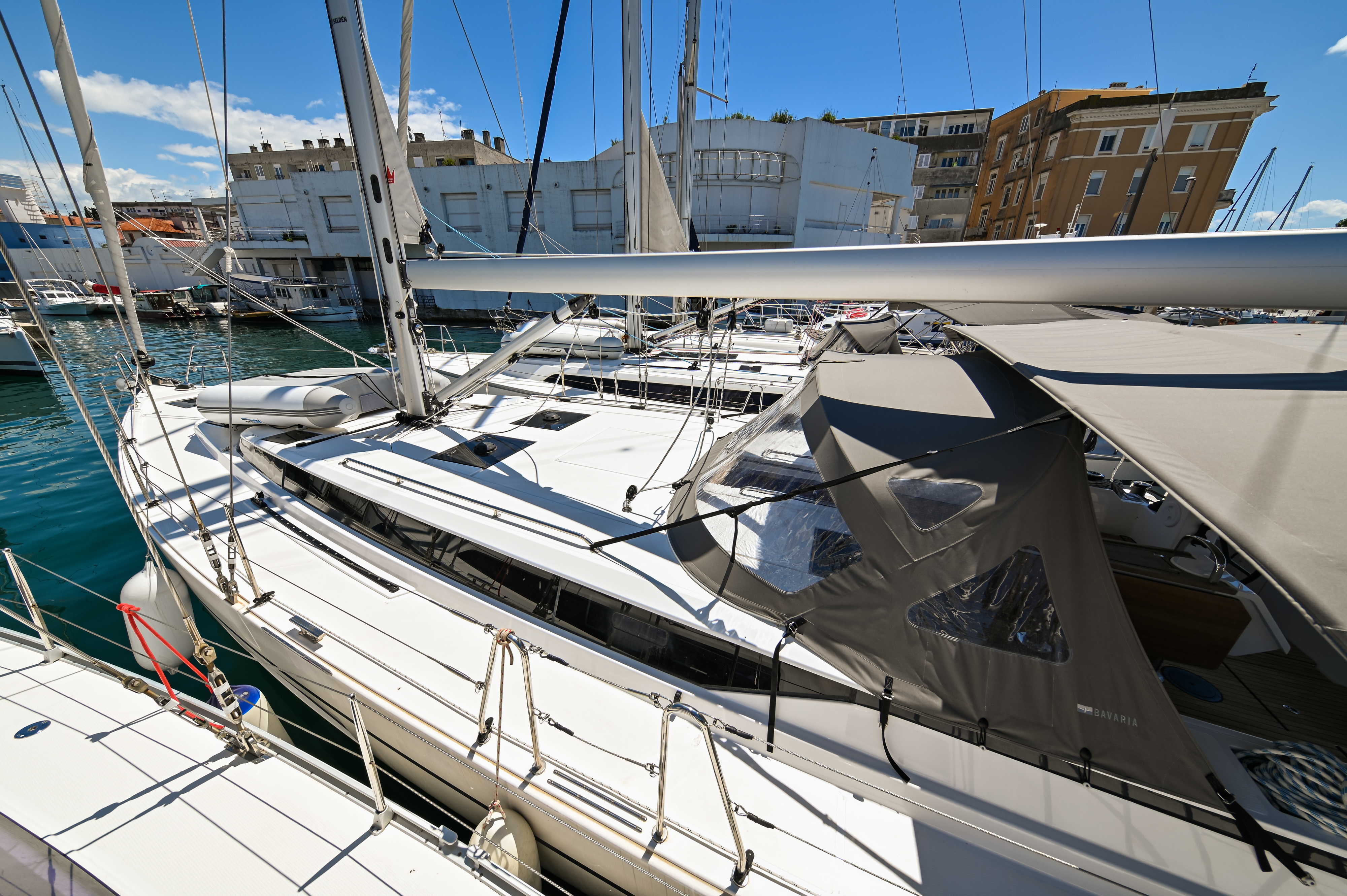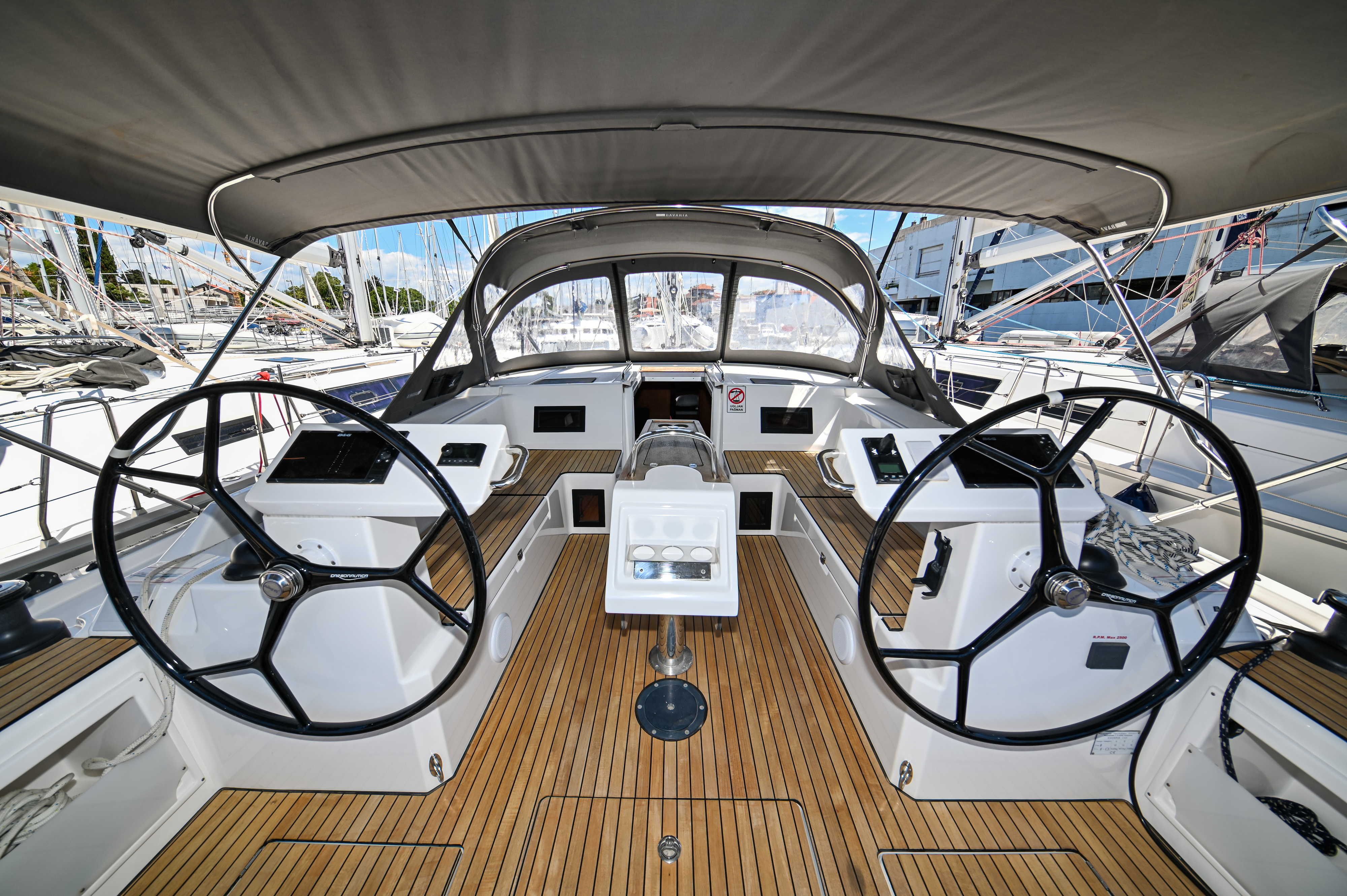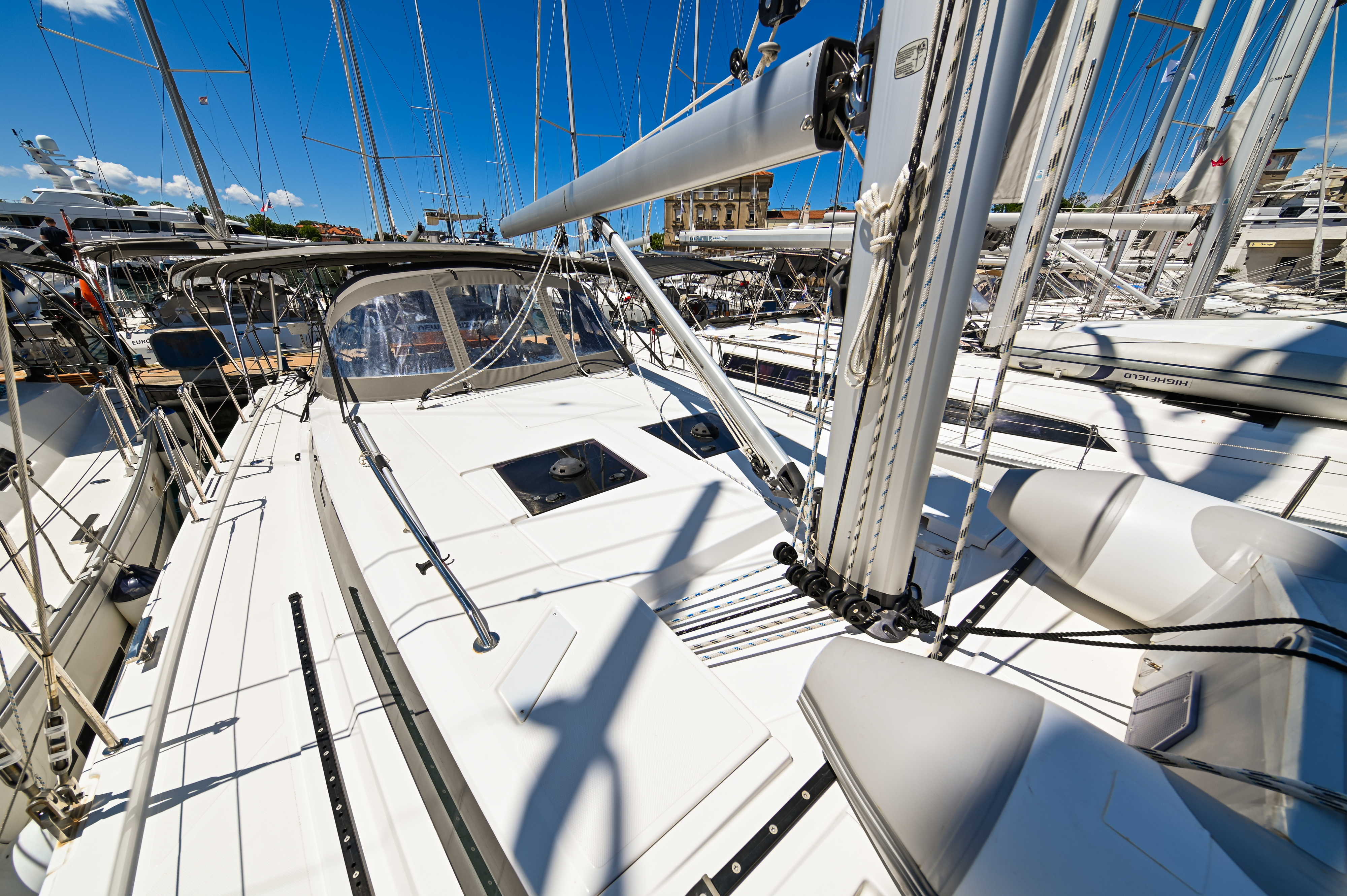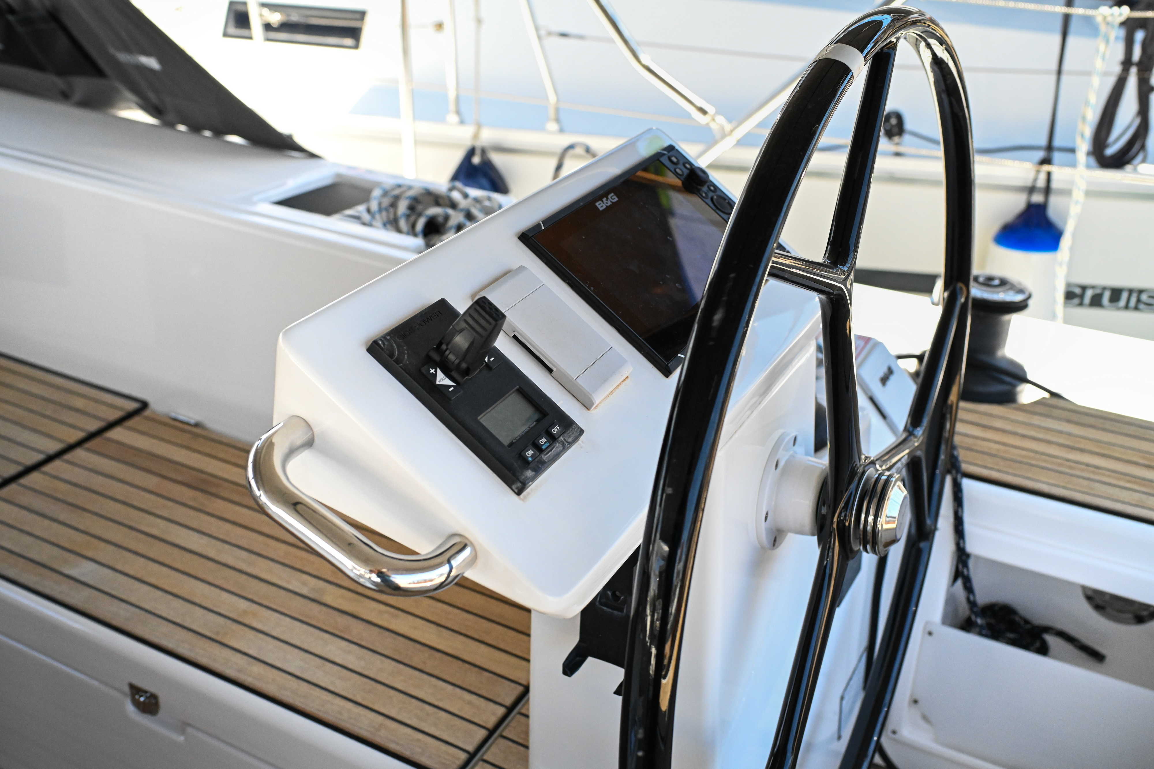| Outside | Badeplattform, Biminitop, Bootshaken, Cockpitdusche, Cockpitlautsprecher, Cockpitpolster, Cockpittisch, elektr. Ankerwinsch, Fender, Festmacherleinen, Seereling, Solaranlage, Sprayhood, Teak im Cockpit, Windex |