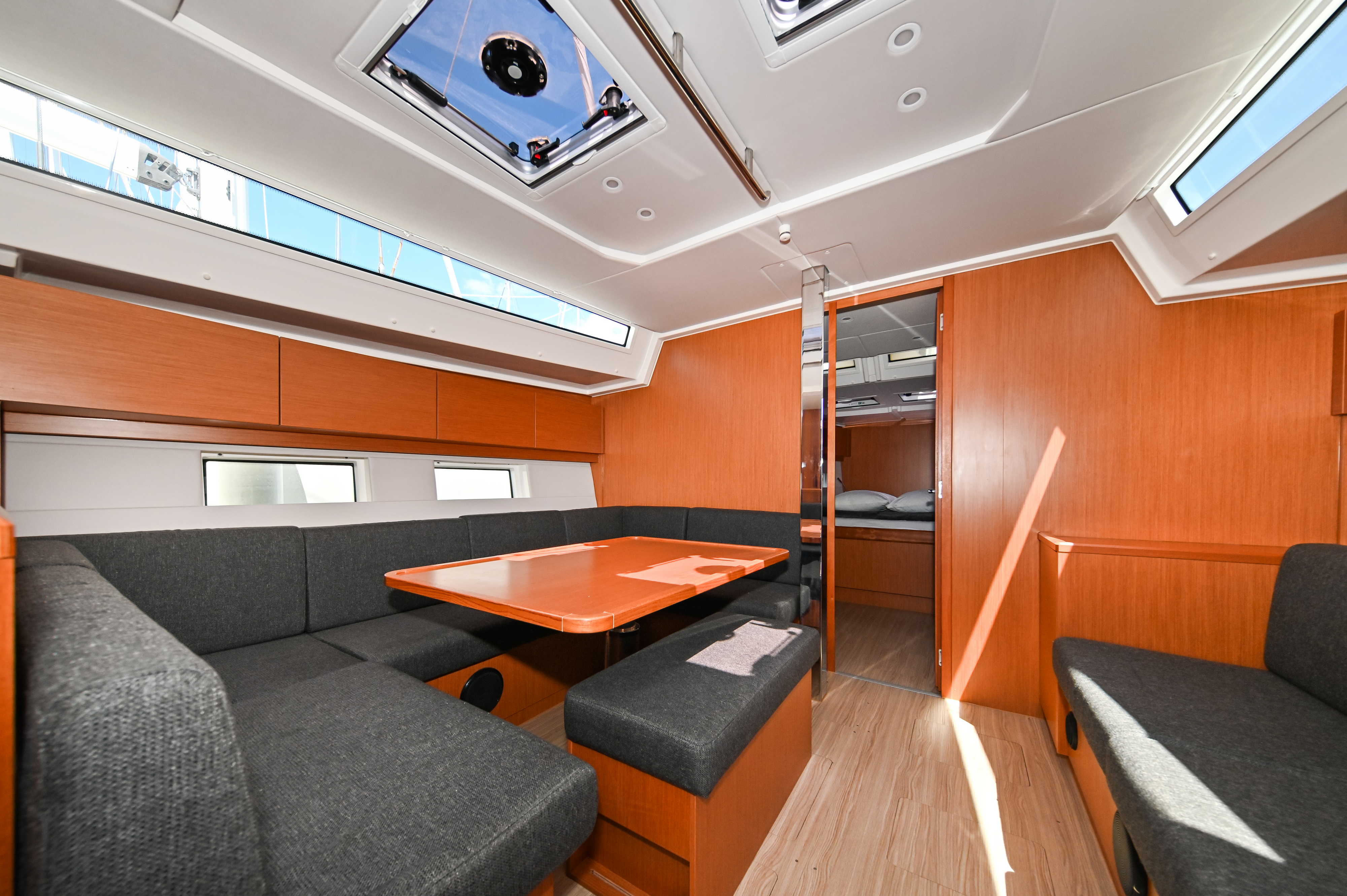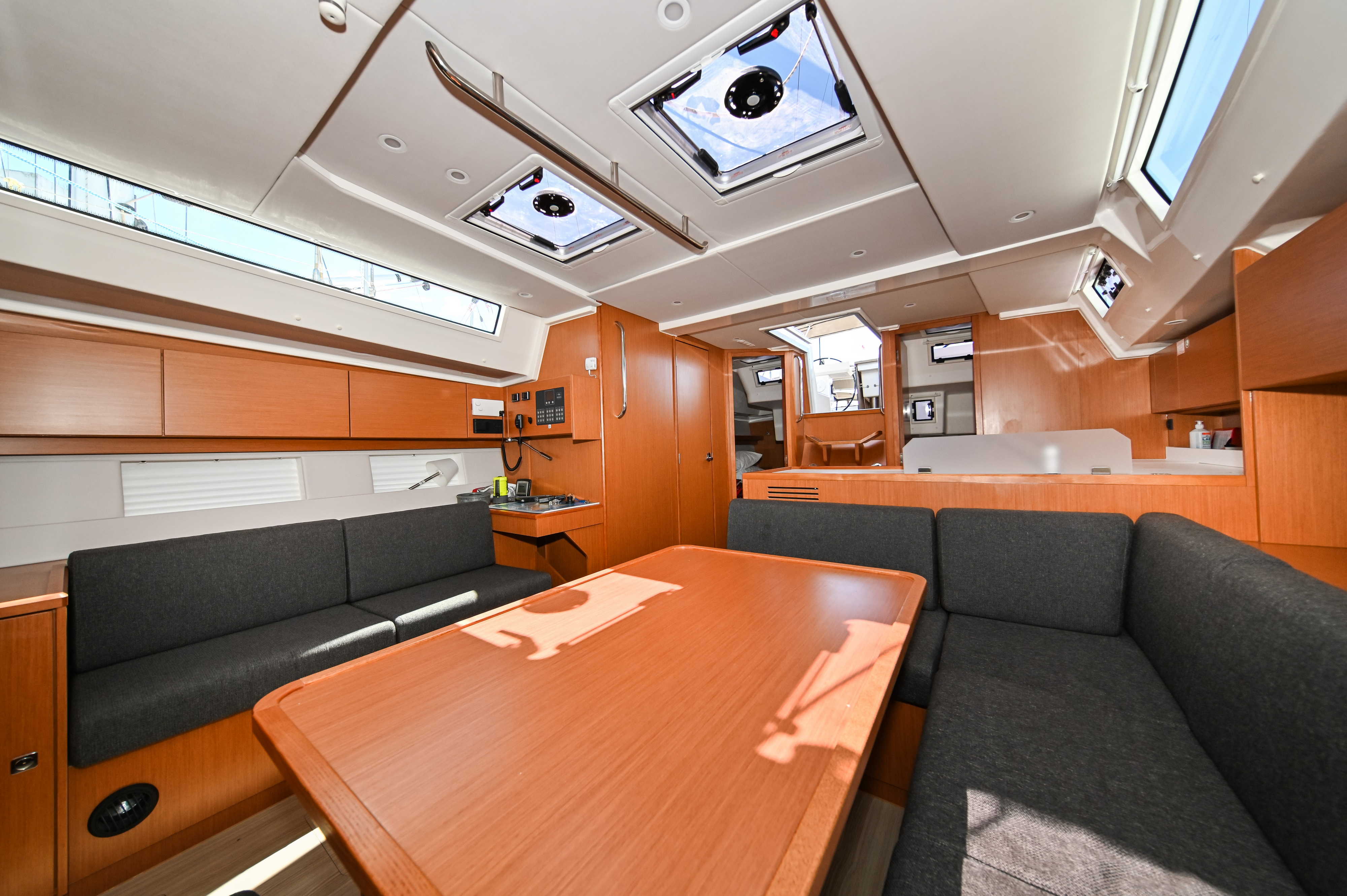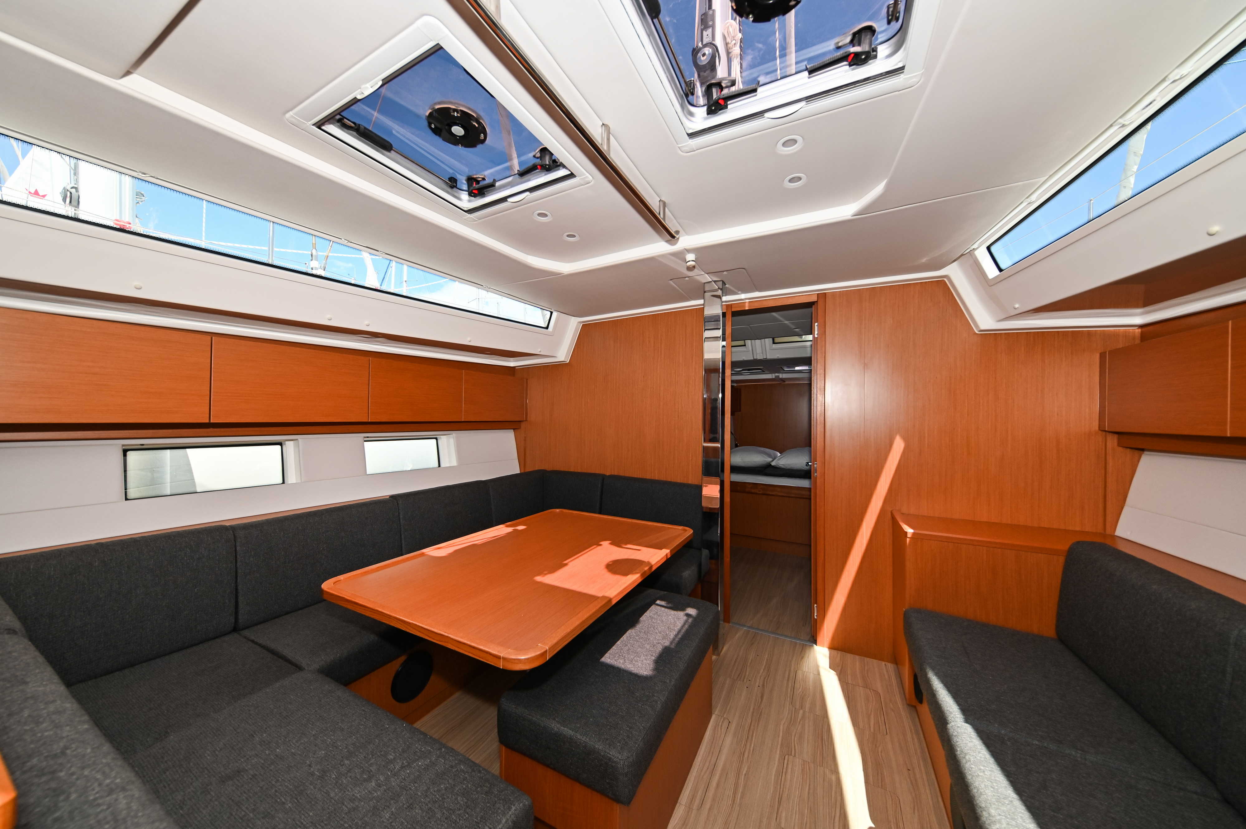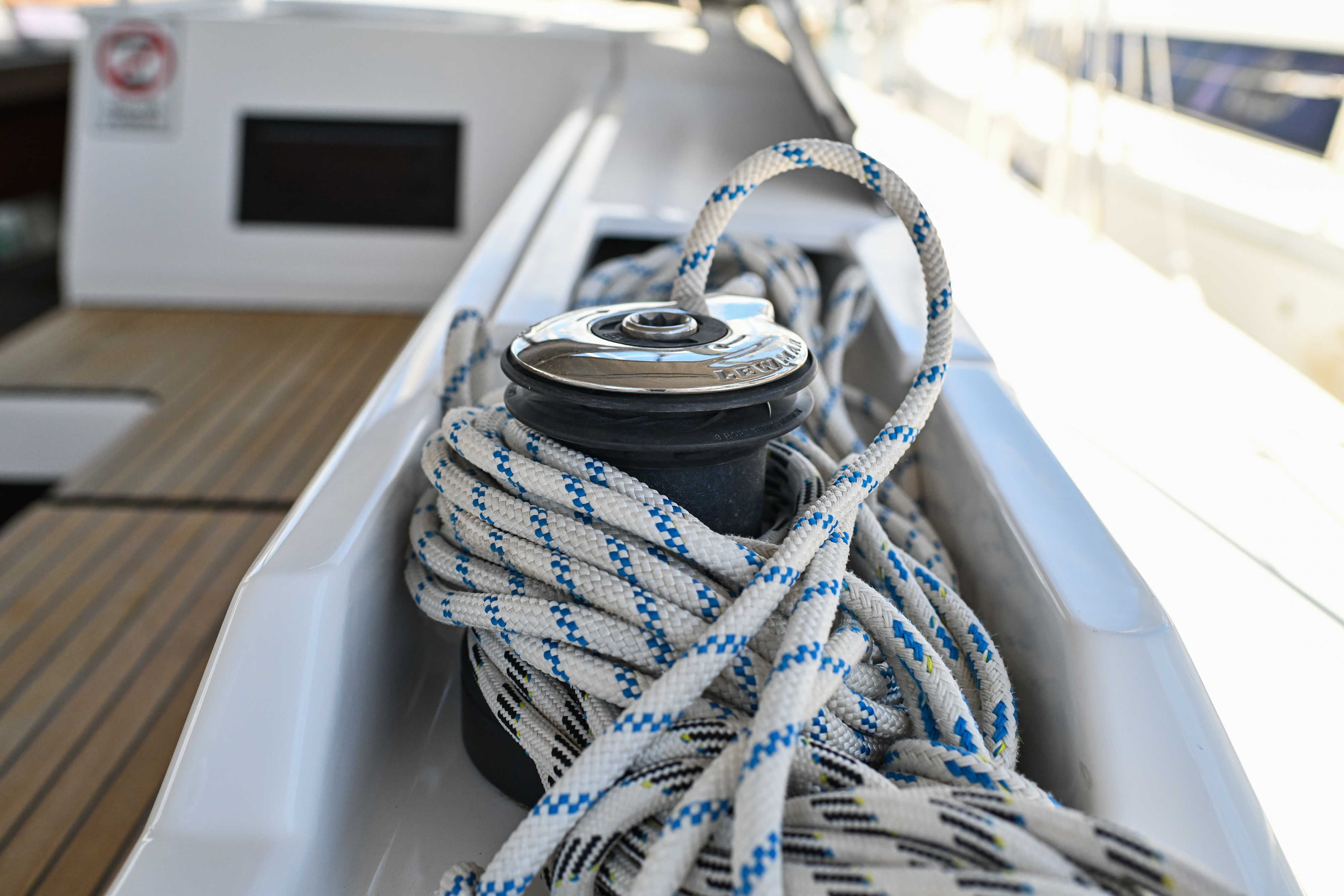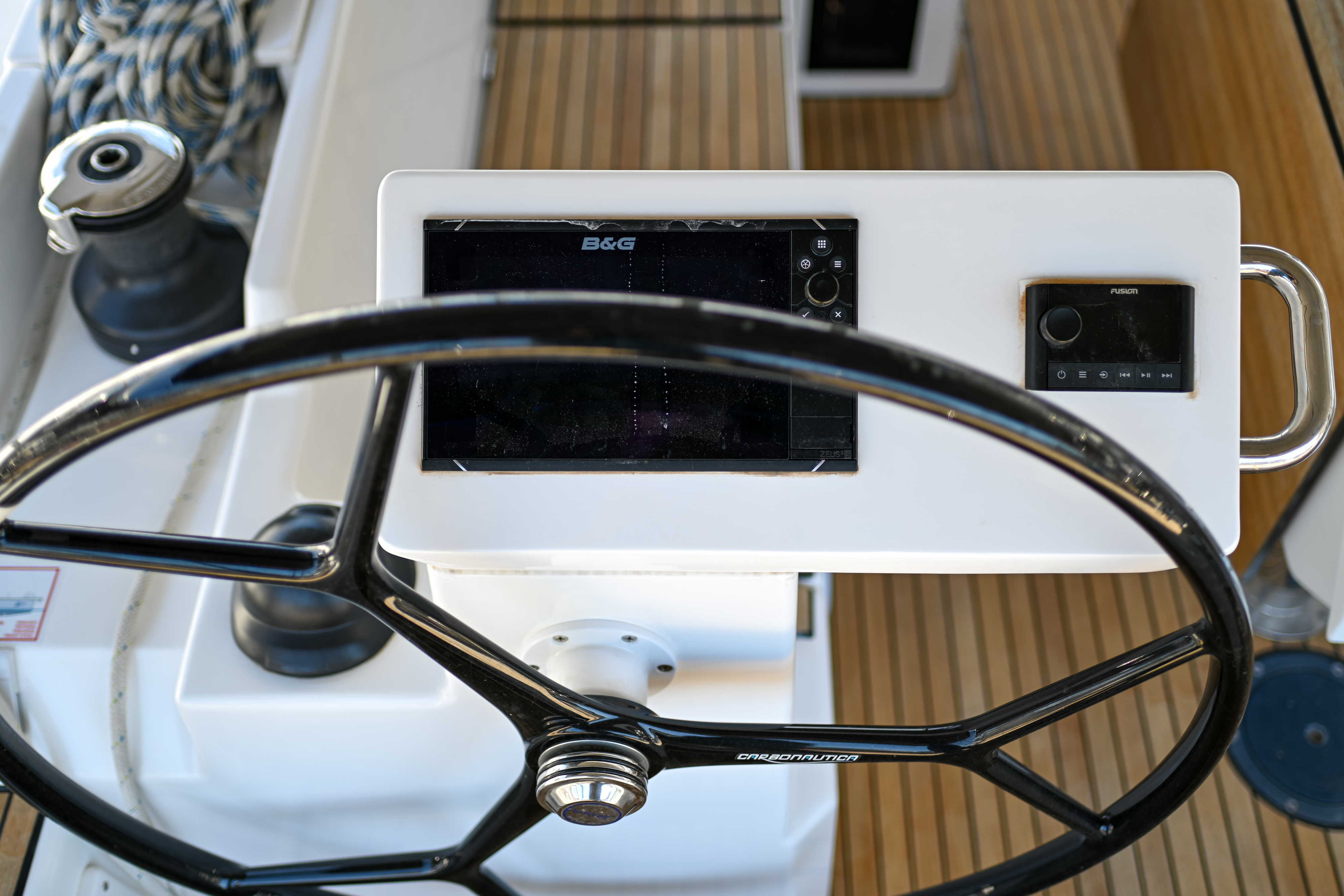 | Outside | Badeplattform, Biminitop, Bootshaken, Cockpitdusche, Cockpitlautsprecher, Cockpitpolster, Cockpittisch, elektr. Ankerwinsch, Fender, Festmacherleinen, Seereling, Solaranlage, Sprayhood, Teak im Cockpit, Windex |