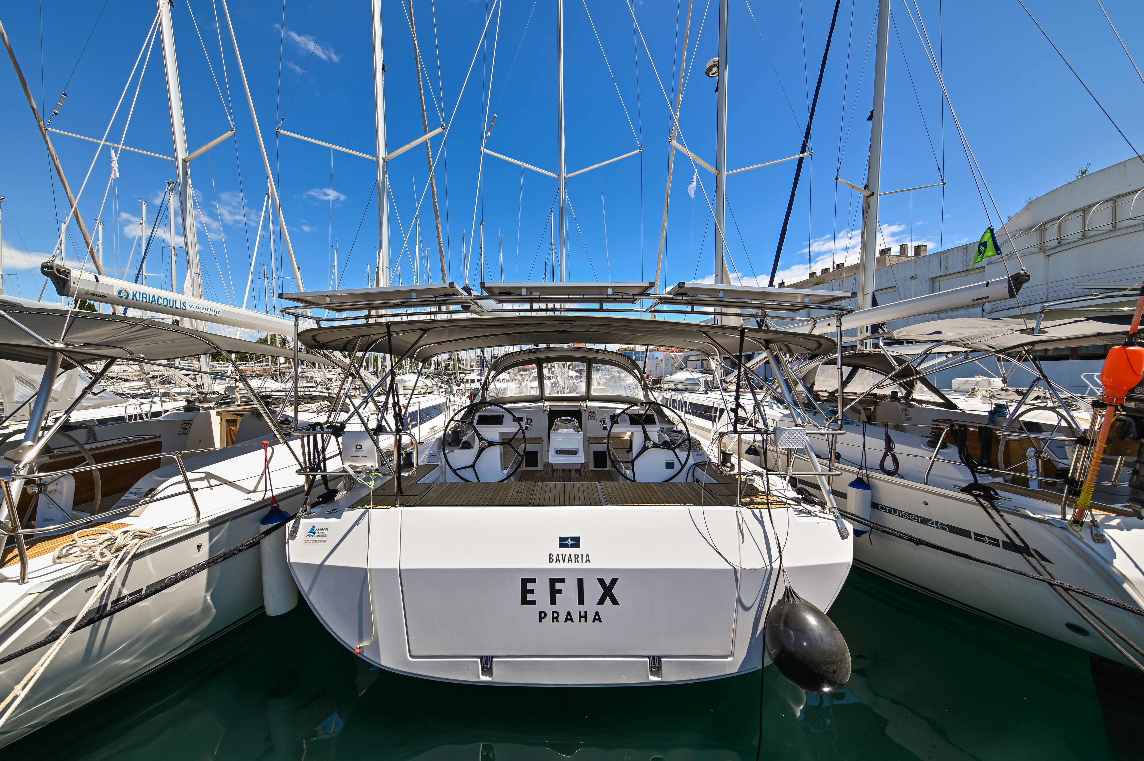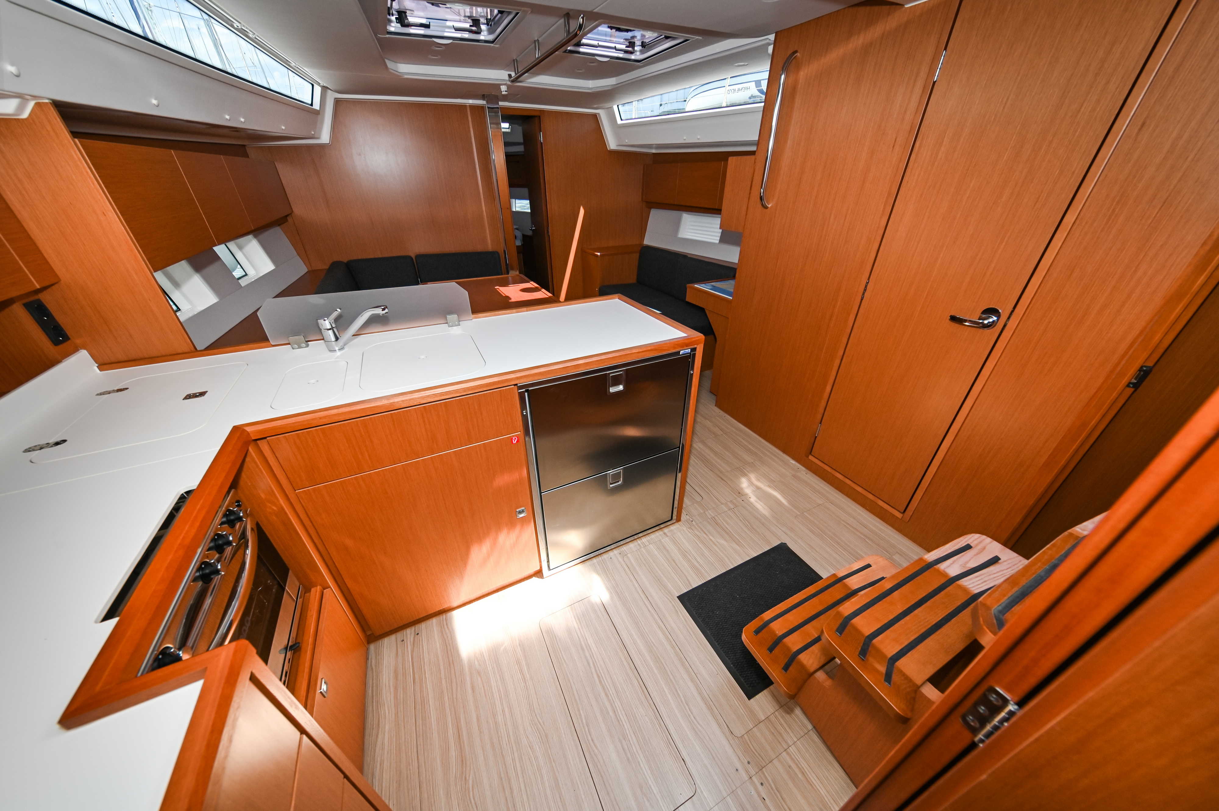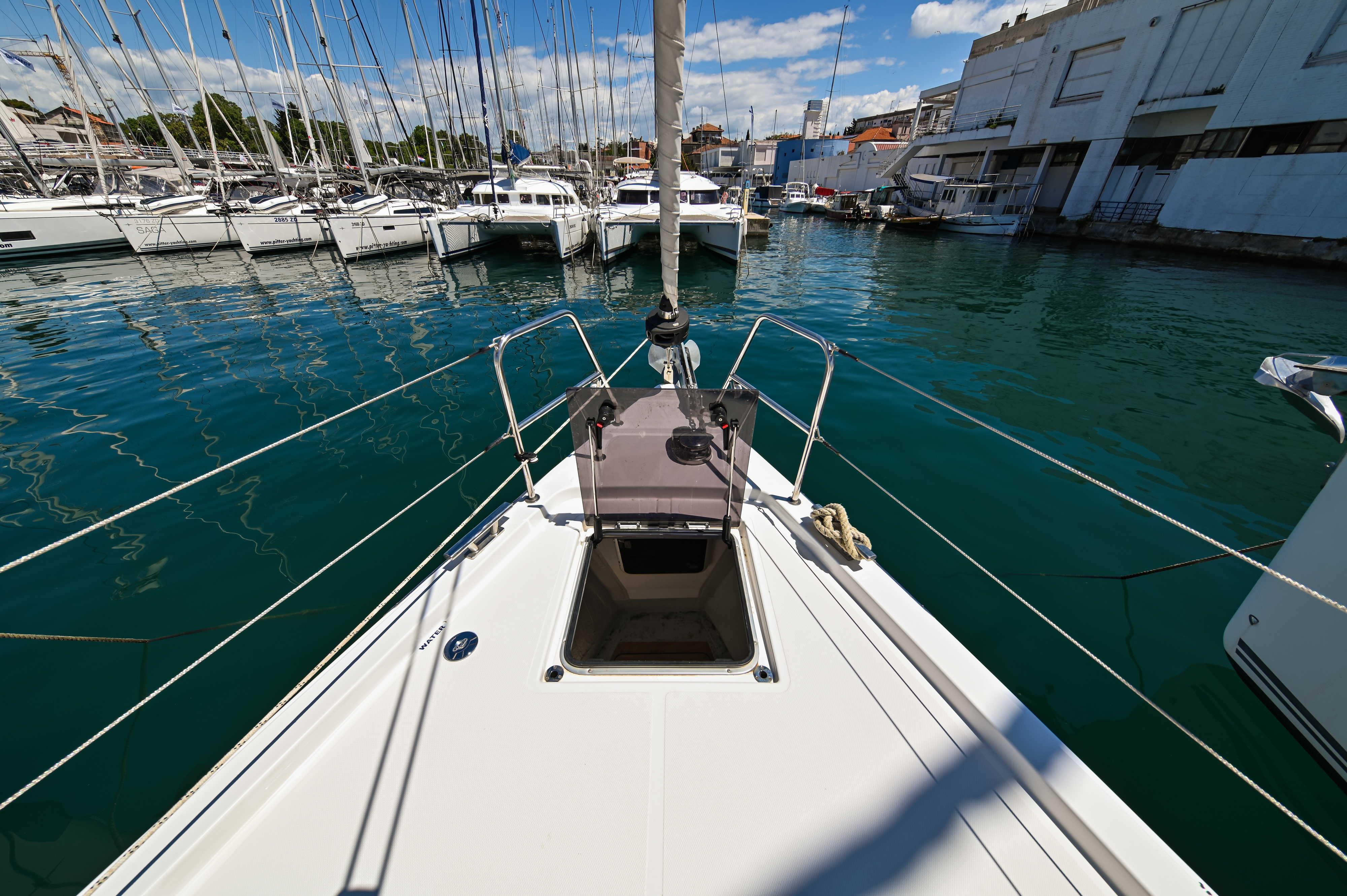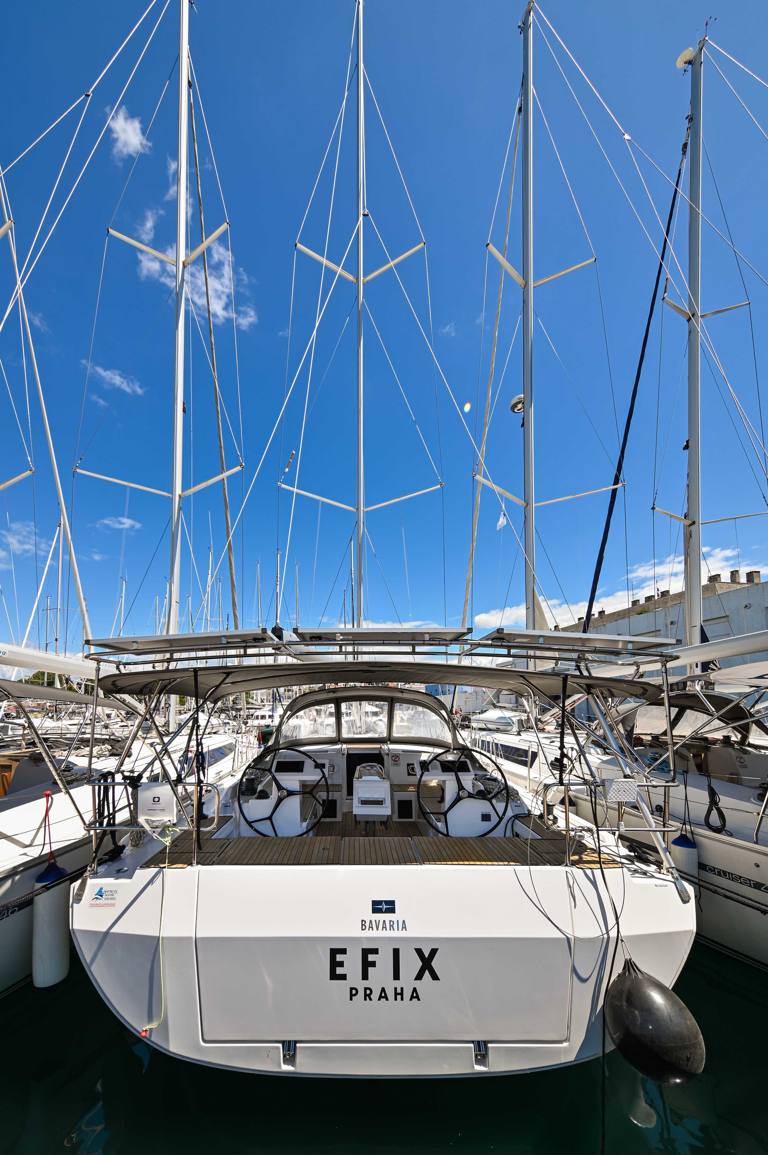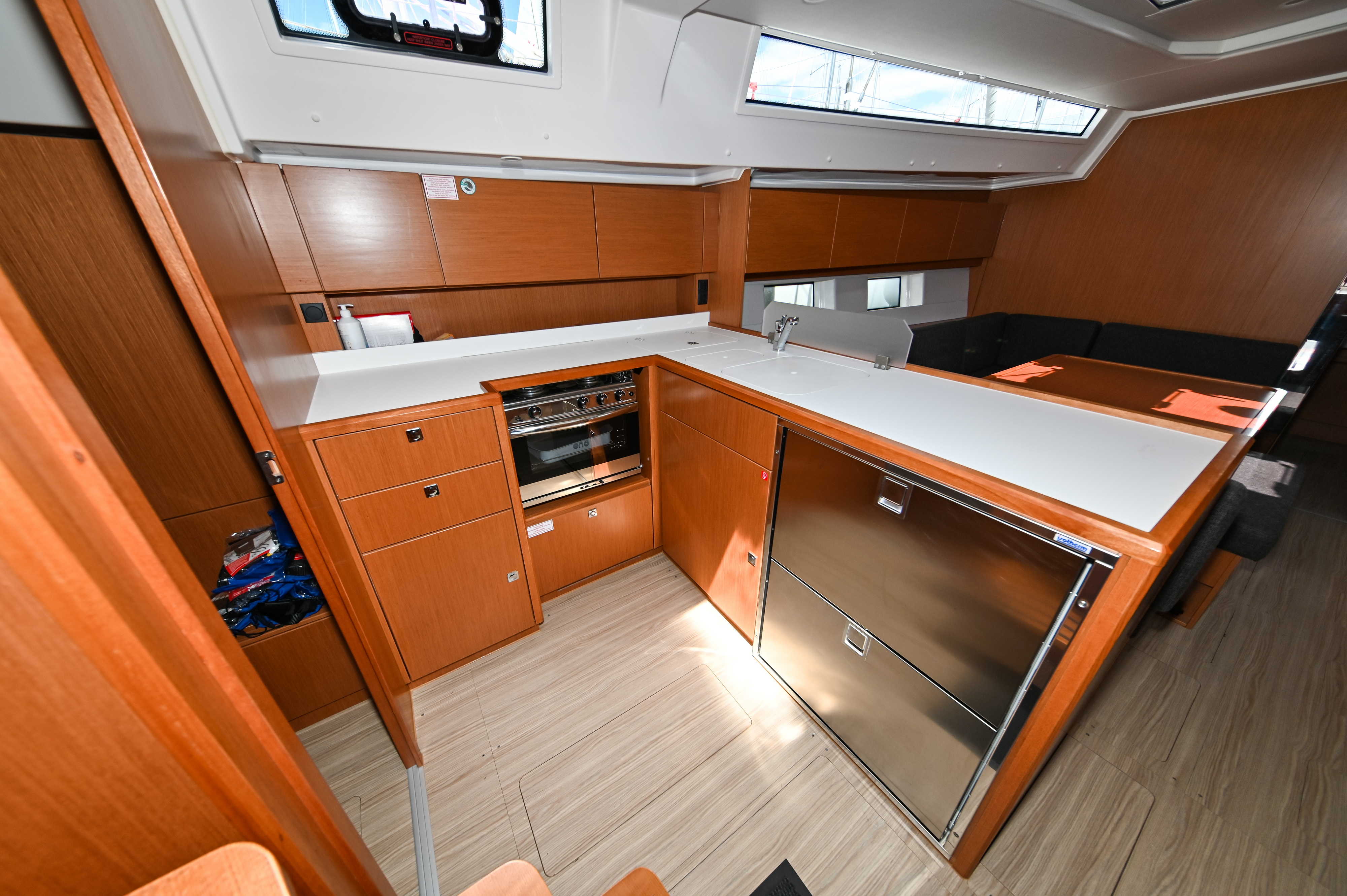 | Outside | Badeplattform, Biminitop, Bootshaken, Cockpitdusche, Cockpitlautsprecher, Cockpitpolster, Cockpittisch, elektr. Ankerwinsch, Fender, Festmacherleinen, Seereling, Solaranlage, Sprayhood, Teak im Cockpit, Windex |