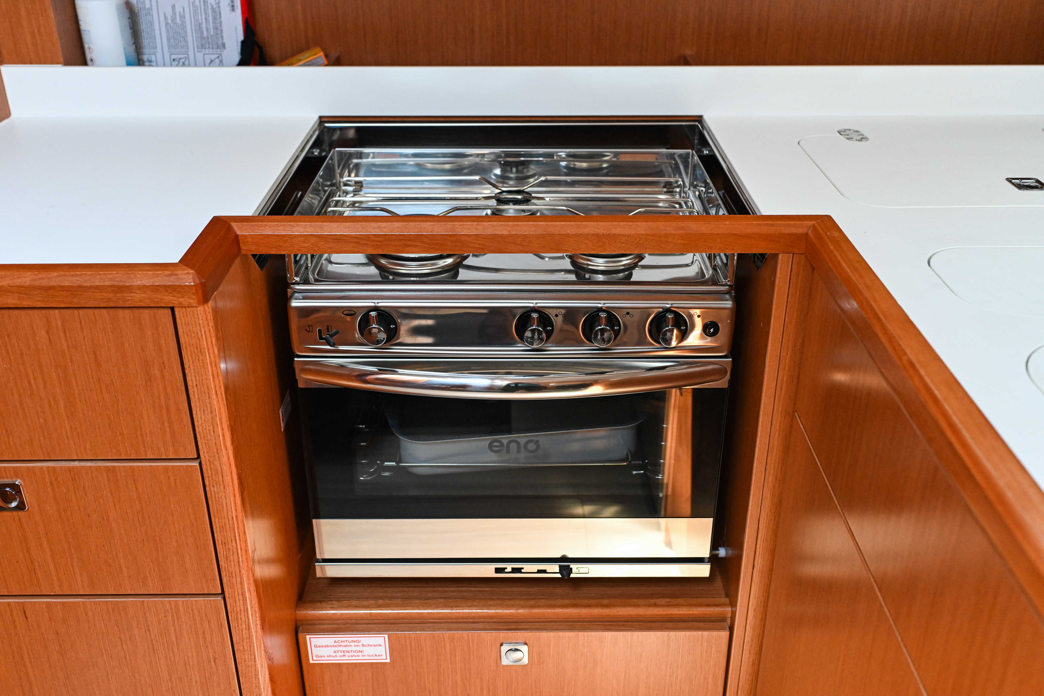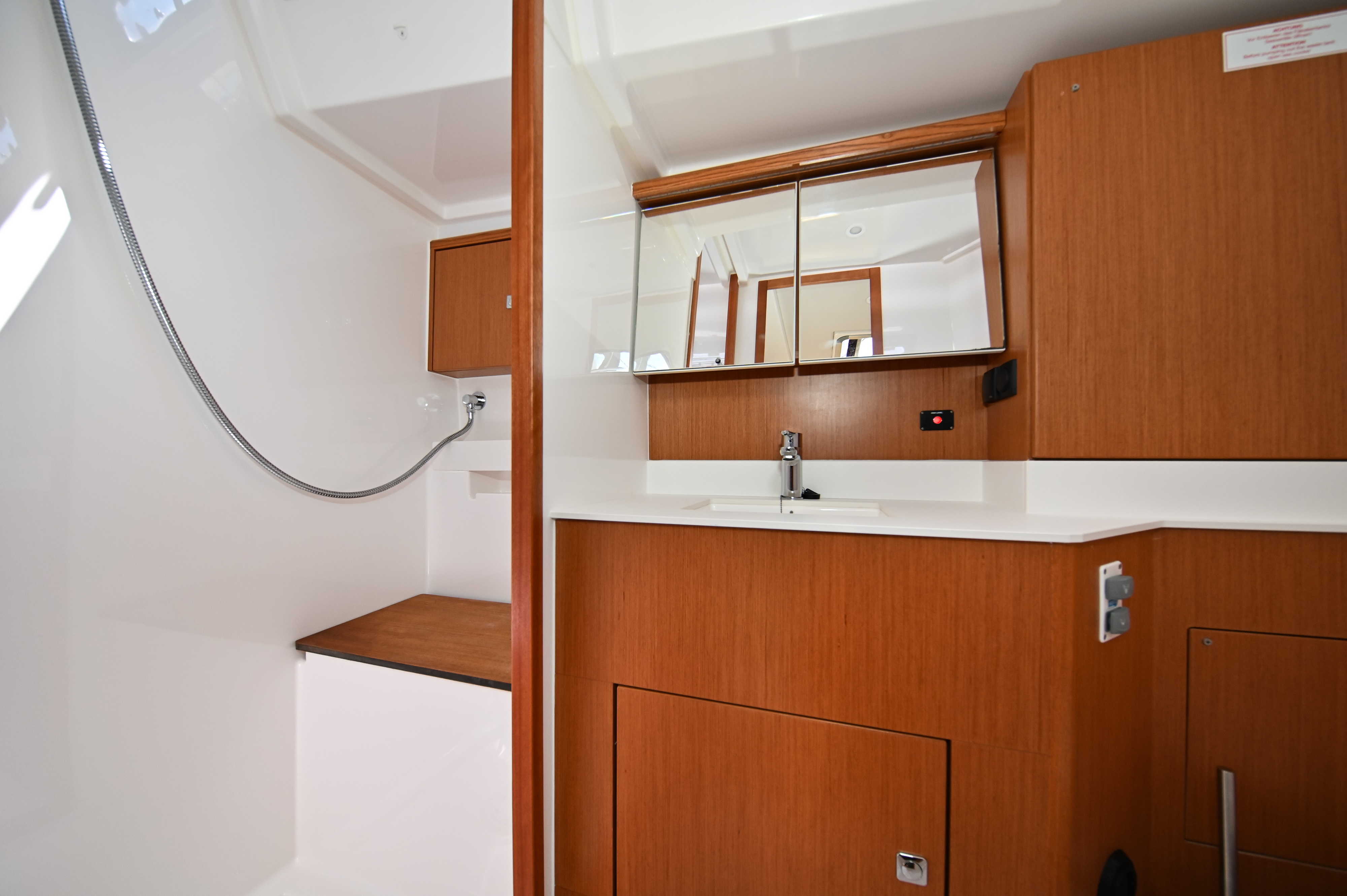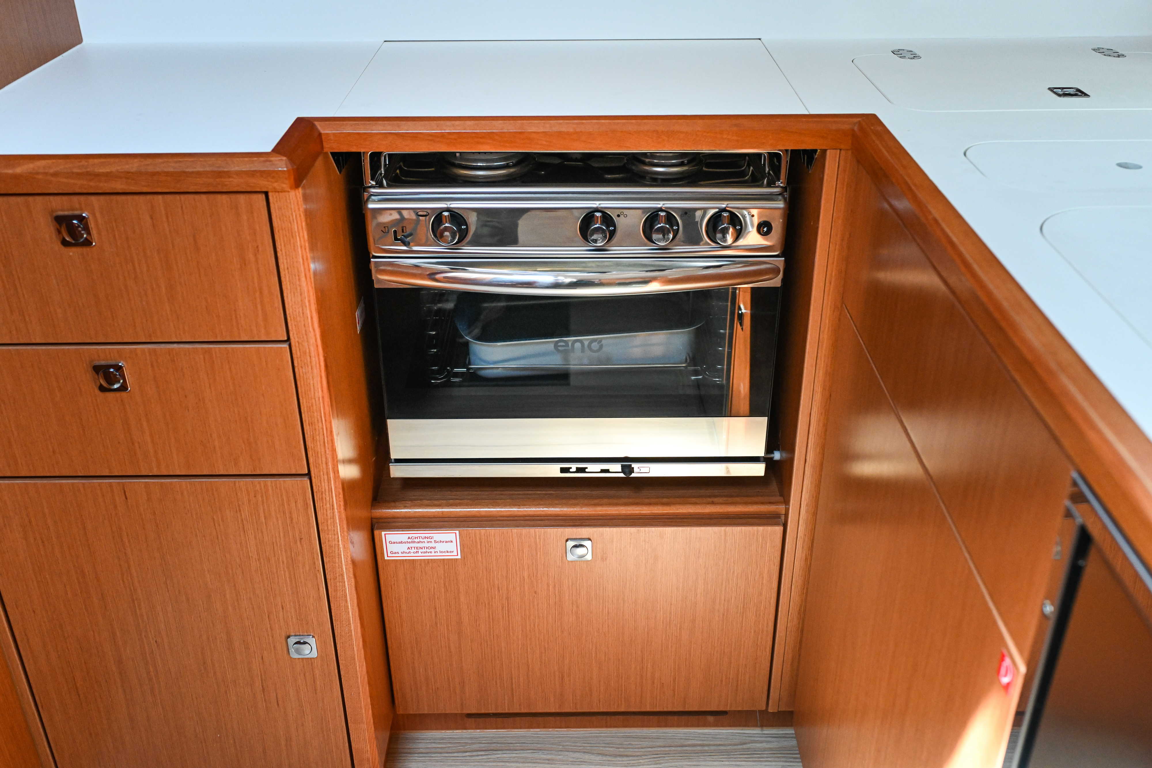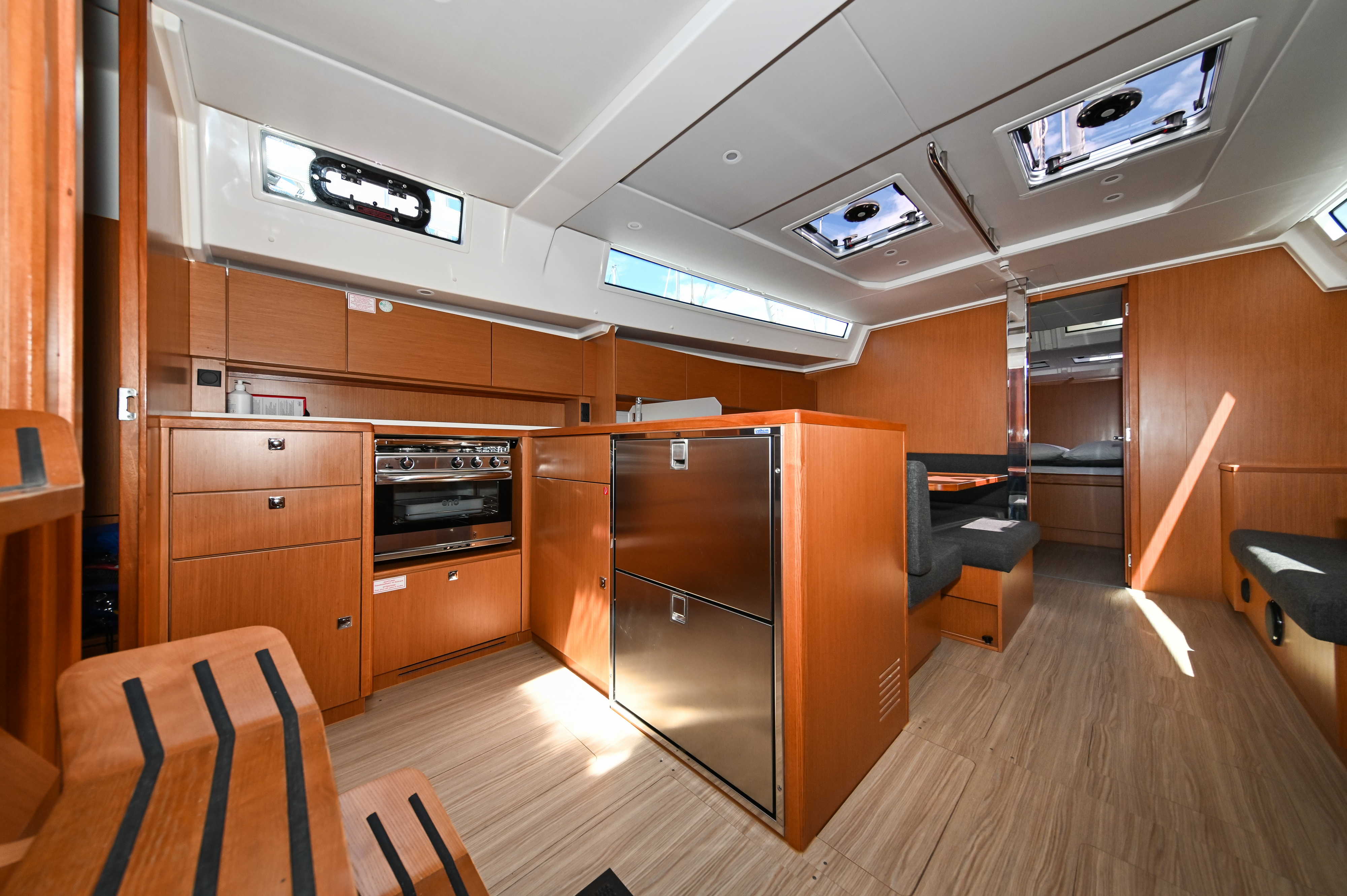 | Outside | Badeplattform, Biminitop, Bootshaken, Cockpitdusche, Cockpitlautsprecher, Cockpitpolster, Cockpittisch, elektr. Ankerwinsch, Fender, Festmacherleinen, Seereling, Solaranlage, Sprayhood, Teak im Cockpit, Windex |
